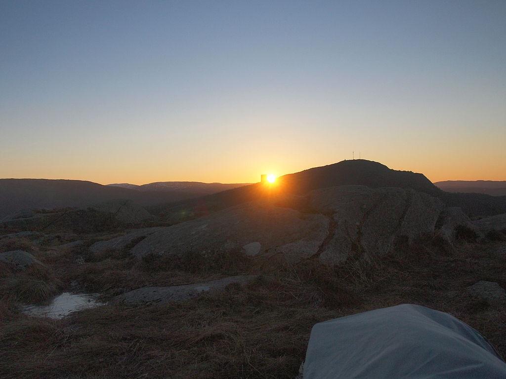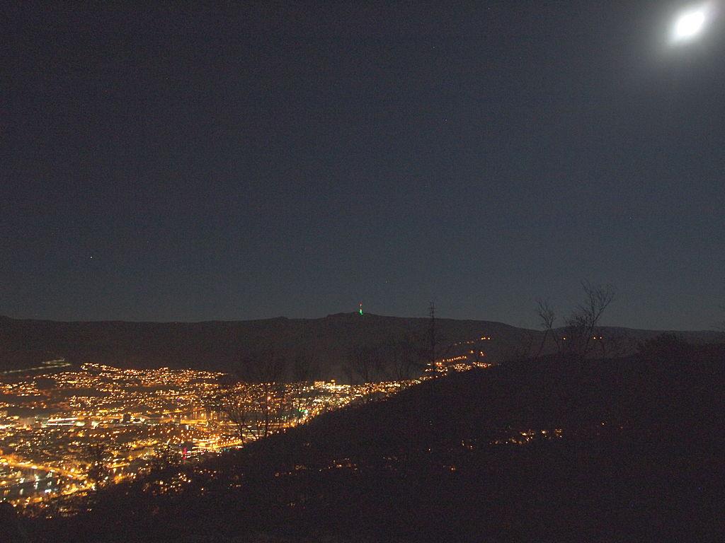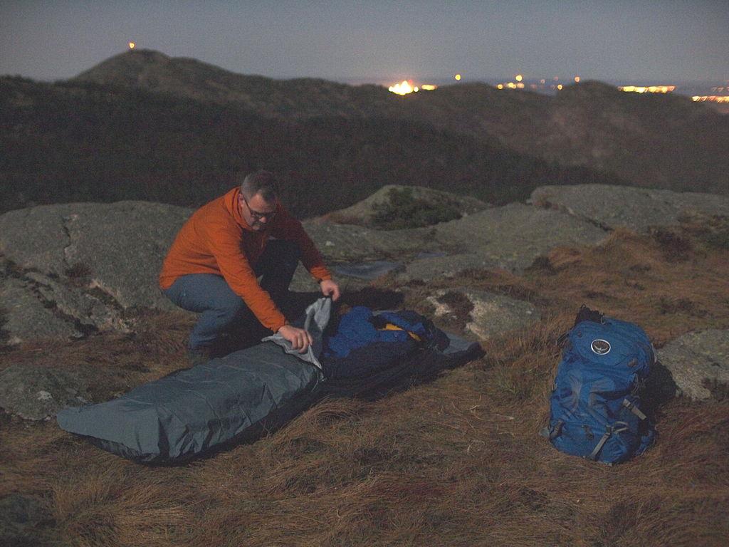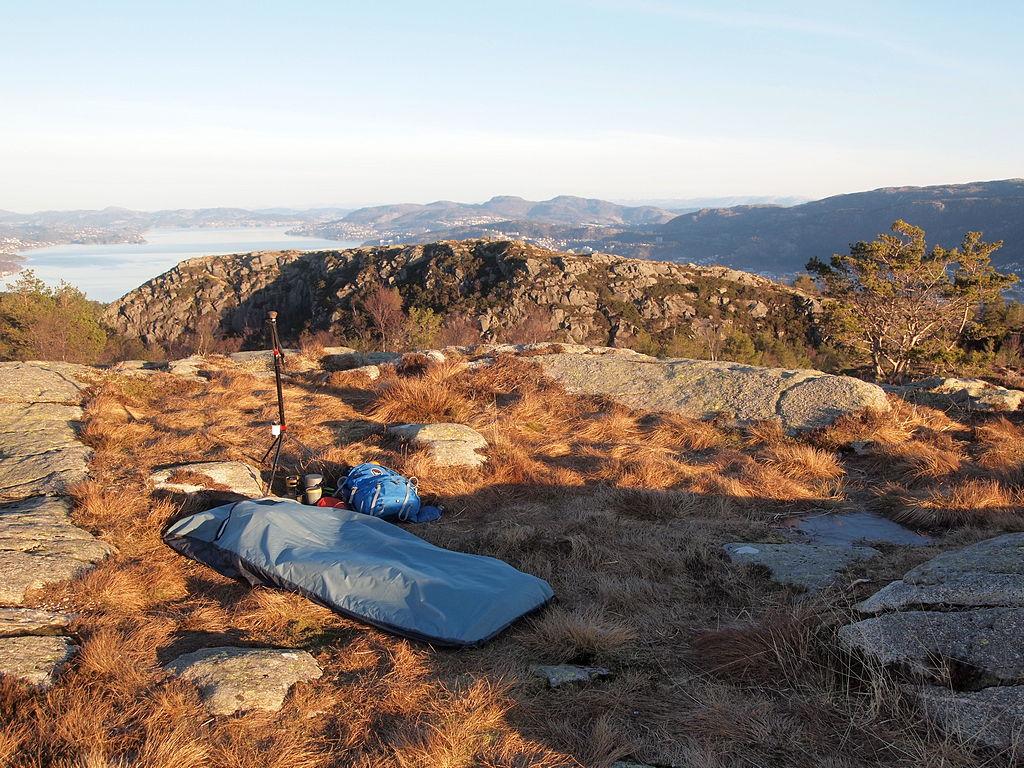 Da er årets første natt under åpen himmel avkrysset Hadde veldig lyst til å ta den på en tur "over vidden", men tok ikke sjansen på en såpass lang tur med oppakning og skrantende venstrebein - overbelastning i helingsperioden ville blitt noe herk. Så det ble en overnatting på toppen av Olsokfjellet istedet. Så ferdig "Nytt på nytt", pakket deretter ned de siste dingsene i sekken, og la avgårde. Strålende flott måneskinn da jeg gikk oppover Damsgårdsfjellet, der jeg knipset et bilde mot Ulriken og Bergen. Fortsatte videre til Olsokfjellet, der jeg fant en passelig flat gressflekk - her er det ofte vått men siden alt var stivfrosset, redde jeg opp for kvelden her. La bivybagen rett på baken, så oppi med Xtherm liggeunderlag, deretter MH Lamina 20 sovepose, og en oppblåsbar pute. Ble liggende å lese litt etterpå, før jeg sovnet. Måtte opp en snartur i 5-6 tiden, månelyset var fortsatt strålende, og det var kaldt! Tok på meg en ekstra ullskjorte før jeg la meg igjen og sovnet. Ble vekket av solen på vei opp bak Løvstakken noen timer senere Strakte meg over mot sekken og fikk fram Svea 123, kaffe og kjele - og i vannflasken hadde det heldigvis bare blitt en tynn ishinne. Jeg tok med lunket vann på vannflaskene og satset på at det neppe ble mer enn 2-4 kuldegrader - og det holdt stikk. Fikk lagd meg litt kaffe uten å forlate den varme soveposen, og tok noen slurker av den før jeg sto opp. Knipset et så bilde av "soverommet". Da var det bare å pakke sammen igjen. Man kan fort bli overrasket over hva som går ned i en ryggsekk på 34 liter (riktignok hadde jeg soveposen hengende på utsiden). Og man trenger ikke 25 kg bare fordi det er kuldegrader, nøyaktig halvparten holdt fint - og det inkluderte ca 2,5 kg mat og vann. Tok på sekken og gikk ned fra Olsokfjellet og over til Holefjellet. Der bestemte jeg meg for å gå over Gravdalsfjellet istedet for å sette kursen hjemover - venstrebeinet kjentes ganske bra ut. Beslutningen ble iverksatt sporenstreks. Da det begynte å verke i kneet på turen ned fra Gravdalsfjellet, tok jeg like godt en lang pause - det ble pølselunsj og kaffe. Beinet ble slett ikke verre av det Bommet på bussen øverst i Nipedalen, så det ble en halvtime asfaltgåing til slutt - akkurat det var kanskje ikke helt innertier, men totalt sett ble dette en flott tur - uten flått1 poeng