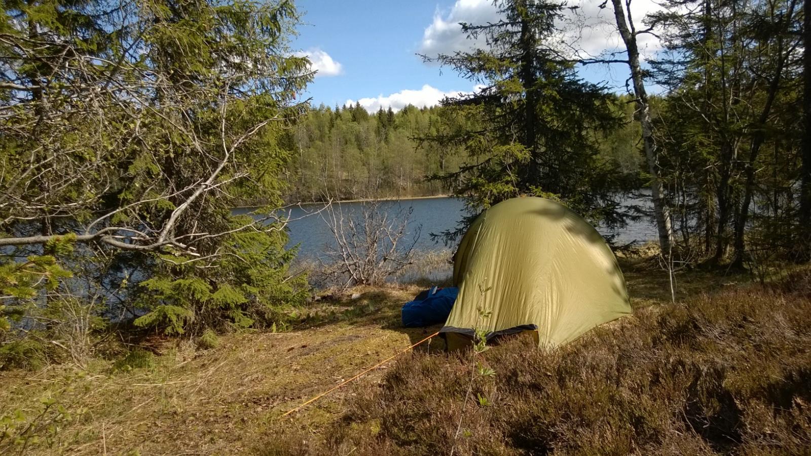 Fra en tur for lenge, lenge siden. Før jeg lasset meg ned med alt mulig utstyr (1979). Nede i vannkanten hadde jeg en gammel kano. Ble det regn la jeg den opp ned på hver sin stokk, en i hodeenden, og en ved føttene, som tak over hodet. Det ble et par kalde grader om natta, såpass at det ble "snerk" på vannet. Svær dunge tørt gress som madrass, og havfull sovepose med gress. Dermed ble en tynn sommerpose et glimrende rede. Aldri har jeg sovet så godt på tur som da.1 poeng