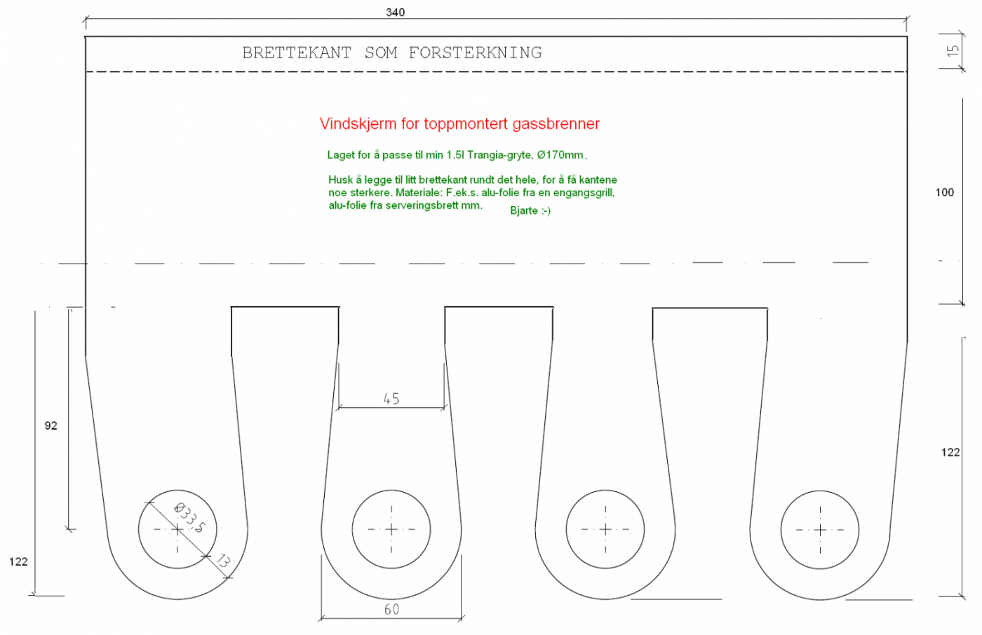 Jeg har lagd meg en vindskjerm av folien fra en brukt engangsgrill som ser omtrent ut som på bildet nedenfor (bildet er funnet på nettet for lenge siden, tror det var på forumet til svenske utsidan.se). Jeg har laget den så den går lenger rundt og dekker mer (og den har fire "bein", ikke tre som på bildet). Den fungerer fint og blåser ikke bort. Den er enkel å brette sammen etter bruk og passer da ned i ei gryte. For tida bruker jeg dog mest slange-brenner og en sammenfoldbar vindskjerm av aluminiumsplater. Jeg lagde meg en mal for lenge siden også - har lagt den ved (husker ikke helt om jeg lagde figuren fra bunnen av eller klippet og limte på en jeg fant på utsidan.no)5 poeng