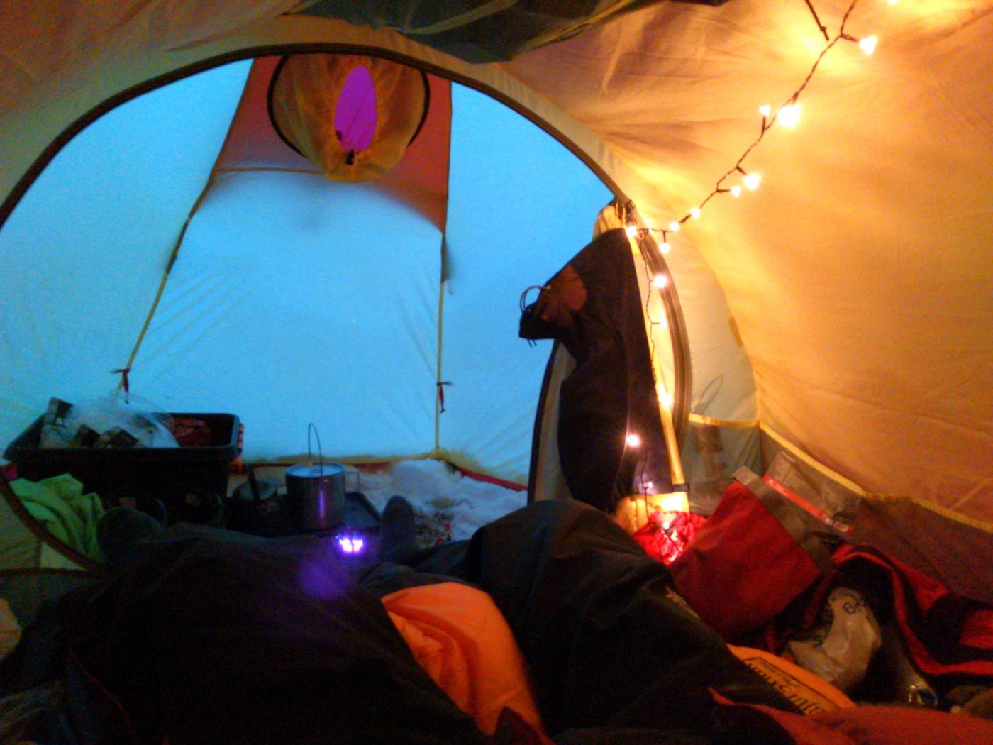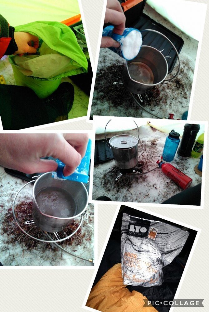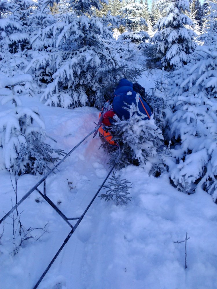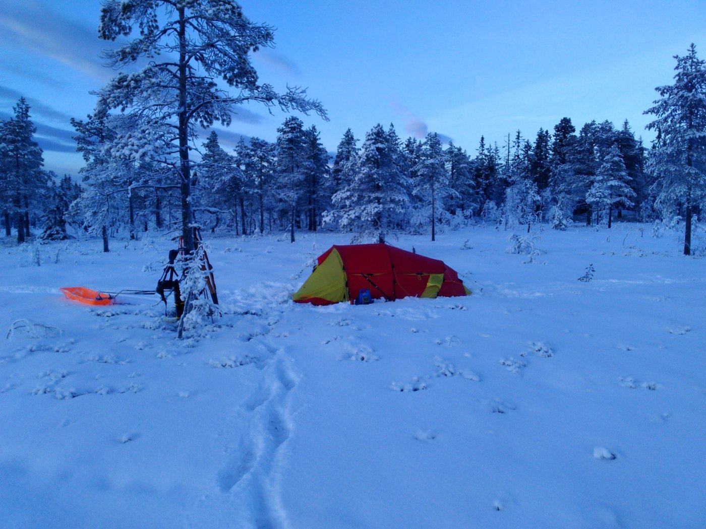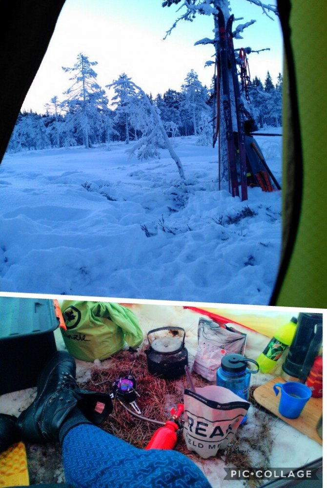 Da har jeg pyntet til jul i teltet, lyslenke til 30 kr fra Rusta funker som nok lys i bruk inni teltet. Flott sol og minus 13 grader. Er på Torgseterhøgda ca 3 km fra Kleivstua (Krokskogen). Smelte snø på primusen og Lyofood tradisjonelle polsk sauerkraut, med hele einerbær. Får litt julestemning av dette😀. Helsport Patagonia telt. Parispulk og fjellpulken drag/sele. På pulkturer hører det vel med et bilde av en veltet pulk, som har kilt seg fast i hugstfeltet.2 poeng