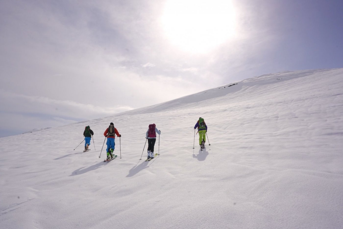 Denne vinteren har det til tross for at eg bur "midt" i toppturland, vore mykje fjellski og langrenn, og lite topptur. Mest pga innkjøring og opplæring av hund. Siste mnd har me dog arbeidd litt med å bevege oss i høgare/brattare lende, med lina av og kontakttrening nedatt frå fjellet og gjennom skogen. Dette har gått så bra, at i går prøvde eg meg på å ta med unghunden på sin første "skikkelige" topptur. Fjellet heiter som så mange andre fjell på Sunnmøre "Grøthornet" (kjem av grjot = stein/ur), og ligg i prakis rett bak huset vårt. Det er ikkje meir enn 1090 moh, men med start frå 90 moh vert det nokre effektive høgdemeter likevel. Oppgang i ei solvendt helling der du jamt kan gå under 30 grader, gjer at ein på dagar som i går hovudsakleg må forhalde seg til å tenkje utløpssoner for solskred. Det buldrar og brakar til gjengjeld jamt i dalen no om dagen, så den problemstillinga må ligge langt framme i pannebrasken. Sett vekk frå at eg er dårleg på alpine startar, og det difor vart noko heftig plumpeføre utover, så vart det ein gjev tur, og unghunden har vist seg som ein potensiell toppturkamerat også. Det er derimot ikkje likte så godt, var synet av den heilt ferskkjørte linja ned frå Hellefjellet, som du kan sjå om du zoomar inn på biletet under (snøfeltet til høgre for den svarte veggen). Dei to jentene som hadde vore på toppen på Grøthornet ei lita stund før meg, stod med hjartet i halsen og såg på, og lurte på kva i søren dei skulle gjere når detta gjekk til dunders. Det var nok ein dyktig skikjører etter sjølve køyringa å dømme, men skredfaren er stor her no, og eg veit at mange av dei proffe fagfolka i går gjorde "nei"-vurderingar på nokre av våre "uskuldige" klassikerar, med grunnlag i fleire typar skredproblem. Det går også skred på stader det "normalt" ikkje går skred, her no. Eg fekk i alle fall vondt i magen av dette synet. Elles ein tipptopp tur, som igrunn (som vanleg) hadde fortent meir enn eit bilete. Eg synes ofte at ein her på Sunnmøre får dei flottaste utsyna på fjell som ligg mellom 1000 og 1200 moh, fordi ein då ser bort på fjell, og alle dei sju "blånane" i staden for å skue ned på fjell, og miste dimensjonane.16 poeng