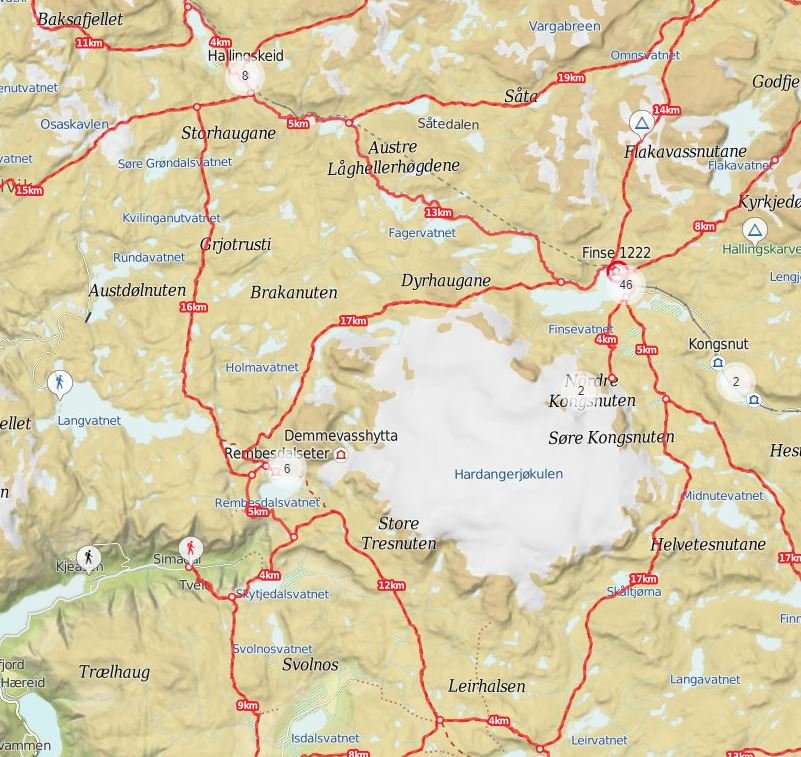 Første alternativet som popper opp i mitt hode er å starte på Finse (eller Hallingskeid) og gå rundt Hardangerjøkulen. Toget går litt sjeldnere fra Hallingskeid, hvilket kan gjøre det lettest å ha dette som startsted, og Finse som avslutning. Om du bommer på togtidene kan du da trekke inn i en varm peisstue på Finse og nyte en overpriset pils i påvente av toget. Forsøker meg på en liten plan. Forbehold om at jeg ikke har gått denne turen selv, så forslag til f.eks. teltplass tas direkte fra kartet. Dag 1: Tar du 12-toget fra Bergen går det direkte til Hallingskeid på drøye 2 timer og klar til å gå rundt halv 3. Sommer i Norge betyr lenge lyst, så du burde fint klare å tusle en 15km denne dagen. Kanskje telte omkring Langvatnet et stykke før Rembedalsseter? Dersom du synes det blir noe langt avslutter du dagens etappe ved et av de umerkede tjernene nord for Langvatnet. Dag 2: Følg stien videre retning Leirhalsen og Kjeldebu. Rent lengdemessig kan det nok tenkes at telting omkring småtjernene ved Leirhalsen vil være passende. Dag 3: På tide å vende nesa nordover. Følg sti oppover ved Leiro, retning Skåltjørna. Kan tenkes at sistnevnte vil være et fint sted å avslutte dagens etappe. Dag 4: Straka vegen i mål. Togtabellen klarer du nok å lese selv. De to siste dagene blir litt kortere enn de to første. Dette kan selvfølgelig justeres slik du ønsker, der spesielt teltplass på dag 3 vil avgjøre hvilket tog du når frem til på dag 4. Ellers alltid lurt å telte med tilgang til rent vann (fortrinnsvis rennende), samtidig som det er lurt å holde seg litt lavt i terrenget for å unngå det verste av vær. PS: har vært noe ruteomlegging av ruta sør for Rembedalsseter retning Kjeldebu. Et litt våkent øye, kart og kompass, samt relevant info: https://www.ut.no/hytte/3.2072/ er derfor nødvendig.2 poeng