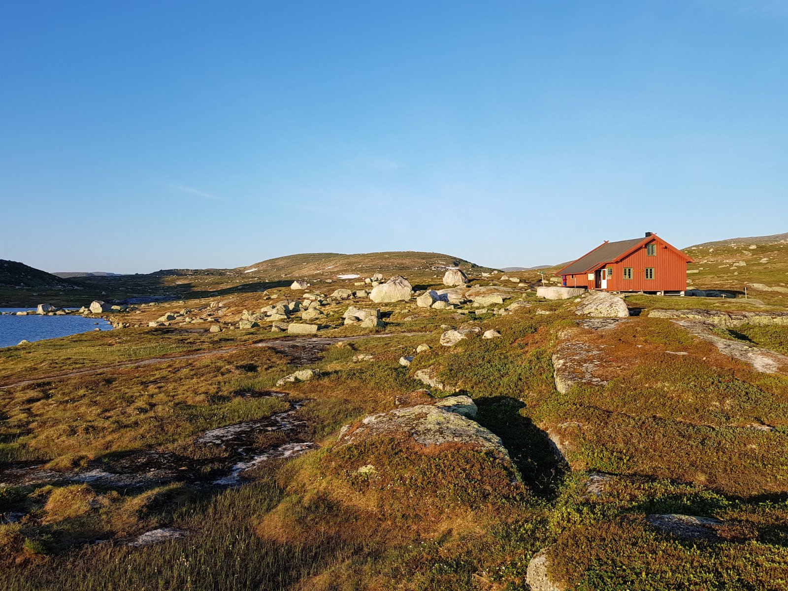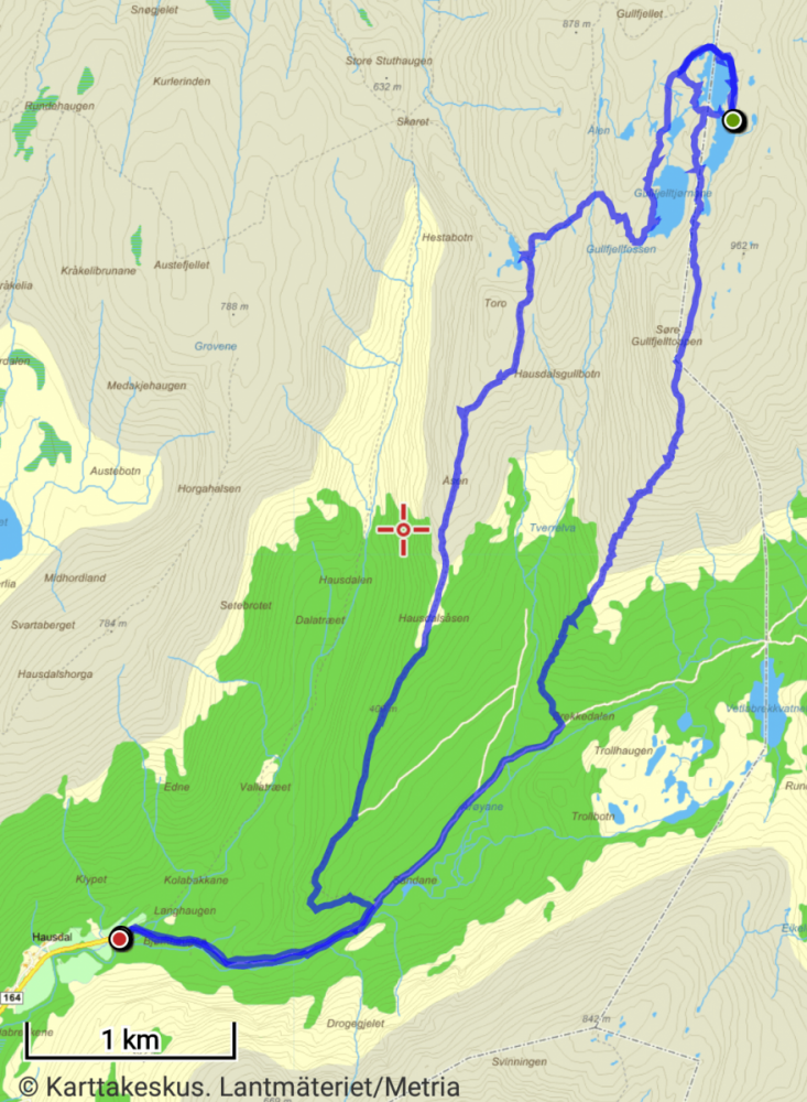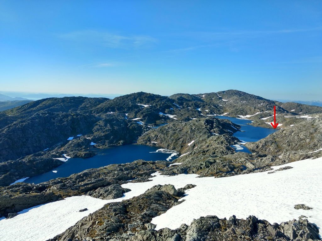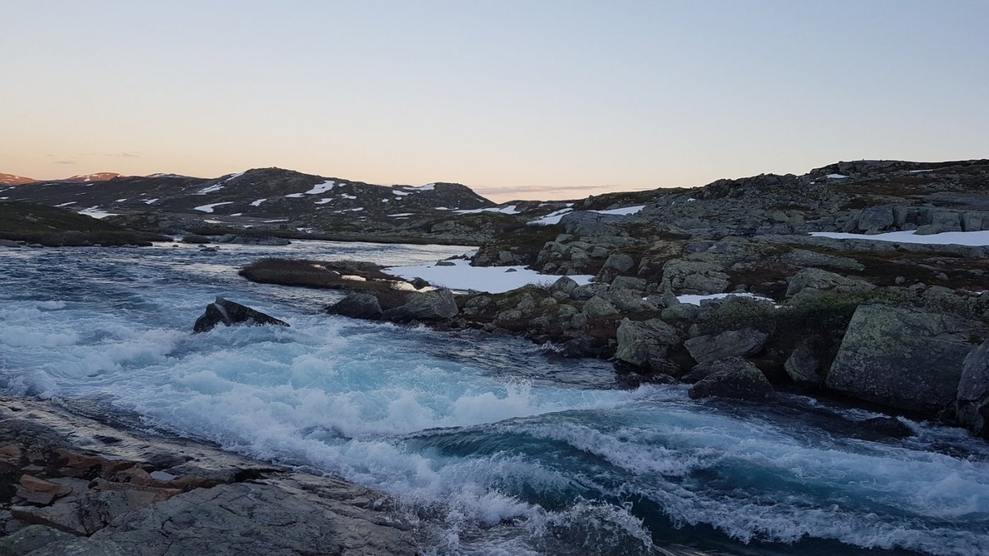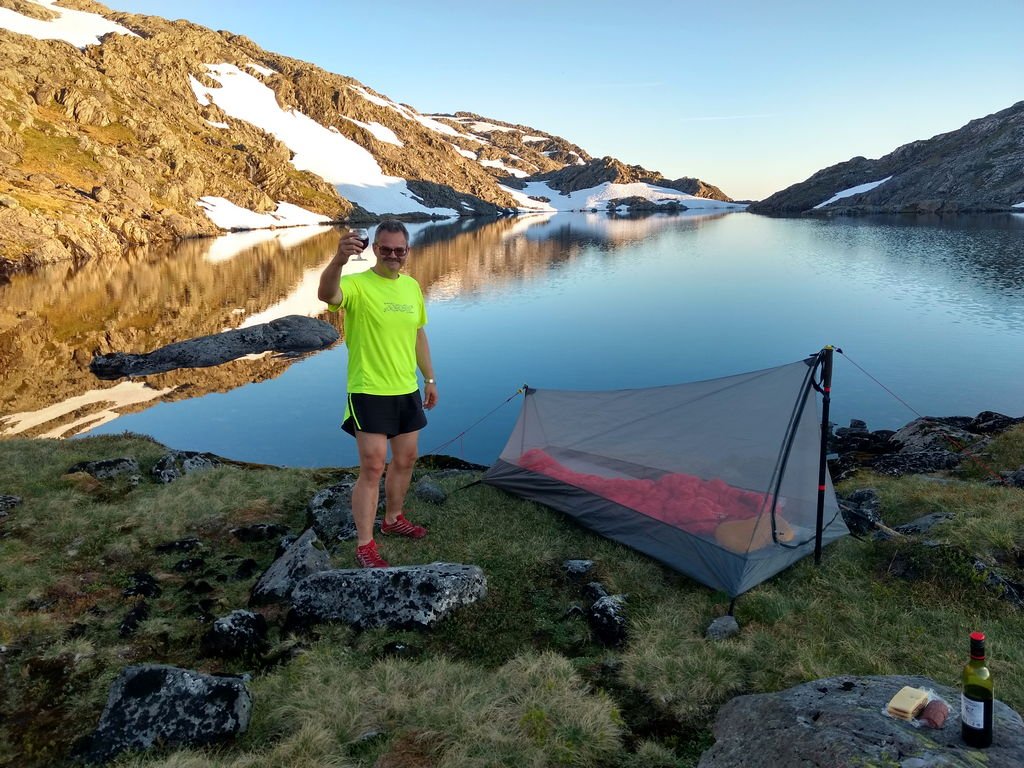 Månedsuteovernatting i juni er herved i boks Det ble Gullfjelltjørnane denne gangen: Startet fra parkeringsplassen i Hausdalen på ettermiddagen og gikk til oppstigningen av Sydpolen (Søndre Gullfjelltoppen), tok halvannen time oppover den drøye stigningen. Mer snø enn ventet mot Gullfjelltjørnane, men ingen problem. Fisket meg et stykke rundt det største - vurderte en vading for å komme over et sted, men vatnet var såpass iskaldt at jeg feiget ut og fortsatte rund baut til jeg fant en teltplass med skygge fra øst. Null fisk, null napp. Fikk satt opp innerteltet på Golite Shangri-La 1, ytterteltet fikk ligge i sekken - og oppsettet ble feiret med ost, fenålår, rødvinspølse og selvsagt rødvin. Noe skal man unne seg når man ikke får "gjøre opp ild" på snøflekkene Solen nådde teltet i halvnitiden neste morgen, og selv om jeg sto opp, var det labert tempo i leiren til nærmere lunsjtider - det var Dab-lytting og lesing, litt bruk av fiskestangen, tørking av sovepose (en hektisk aktivitet, som alle vet). Rundt lunsjtider hadde jeg pakket sammen og begynt på returen - med mål om å dyppe sluken i de andre tjernene og å få sett nærmere på Gullfjellfossen, før turen gikke nedover mot bilen. Slukdyppingen gikk litt som forventet - null fisk, null napp - på hele turen langs tjernene så jeg ikke et eneste vak. Kanskje bare et rykte at det er fisk her, så folk kan oppleve det kontemplative ved å sitte i vannkanten og kaste en sluk utover vann og dra den inn igjen? Ikke dumt dét, men ta med mat! Etter at "fiskingen" var over, gikk turen via Gullfjellfossen tilbake til standardløypa i Gullfjellet, som viste seg å være befolket med prustende folk med startnummer på brystet - hadde ikke fått med meg at "Gullfjellet opp" gikk i dag. Heldigvis var det ikke lange biten jeg gikk mot strømmen i løypa - etter Korketrekkeren brøt jeg av mot Toro, og fulgte ryggen nedover mot Brekkedalen, og så til parkeringsplassen igjen. En flott tur i et vær vi begynner å bli bortskjemt av1 poeng