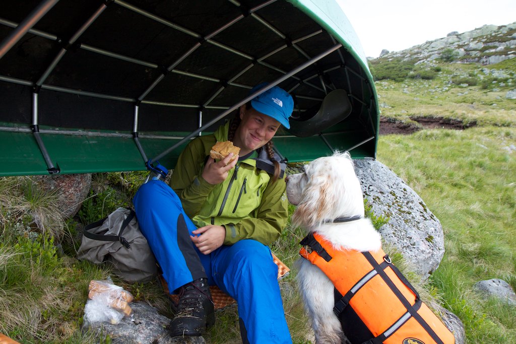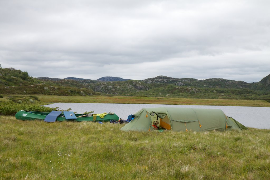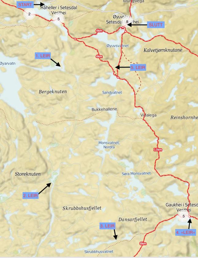 Ikke akkurat fersk tur, men fikk lyst til å mimre litt over en av de artigste kanoturene jeg har vært på - juli 2012, i Setesdals vesthei. Vi pakka kano, sekker og hund i bilen og kjørte Suleskar-vegen fram til Rosskreppfjorden. Kanoen ble satt ut i nordøst-enden av Sandvigvatnet, og vi padla sørover forbi Håheller. En bæring etter Busteinvatnet, og så leir ved Rågeloni, på en halvøy med sandstrand. Dag 2 padla vi videre vest til oppdemte Øyarvatn, så sørover til enden og bæring / padling ned forbi Toraldstjødn og Kotådalskilen (Kvine). Her var det kupert og steinete i vannet, så både bæringer og padling var litt kronglete - men artig fiske i kulpene! Leir ved Åmlibadstoga, hvor det ble fisk til middag. Dag 3 padla vi videre sørover Longaloni, og dro så østover med bæring til Moldbrautvatnet og mellom vanna østover, med ny leir i østenden av Skrubbhusvatnet. Dag 4 padla vi vestre Gaukheivatnet, lang bæring over til sjølve Gaukheivatnet og så unna vi oss middag og ei natt i hundehytta der. Vi bar kano og sekker opp til sørenden av Søra Monsvatnet i samme slengen, for å spare en bæring neste dag. Dag 5 gikk det radig nordover Gjuvvatnet, nordra Monsvatnet, Svoetjørnin og Sandvatnet, og vi slo siste leir i nordenden av Sandvatnet. Siste dag bæring over til Øyuvsvatnet, padle over til hytta og så demontere kanoen. Tung bakke opp til veien, mannen fikk heldigvis haik bort til bilen så han slapp den traskinga. Vi hadde flaks med været, noen regndrypp i lunsjen dag 2 bare, ellers sol og varmt. Noen av de korteste bærestrekka klarte vi å få med sekker, kano og hund i ei vending, men som oftest ble det to (eller tre...) turer for å få med alt. Første padletak Idyllisk sandstrand ved Rågeloni Kveldsfiske To fornøyde campere Lunsj med kanoen som ly for regnet Tigging... Leir ved Åmlibadstoga Fiskemiddag Artig fiske i kulpene! Fra hundebua ved Gaukhei Kart over ruta3 poeng