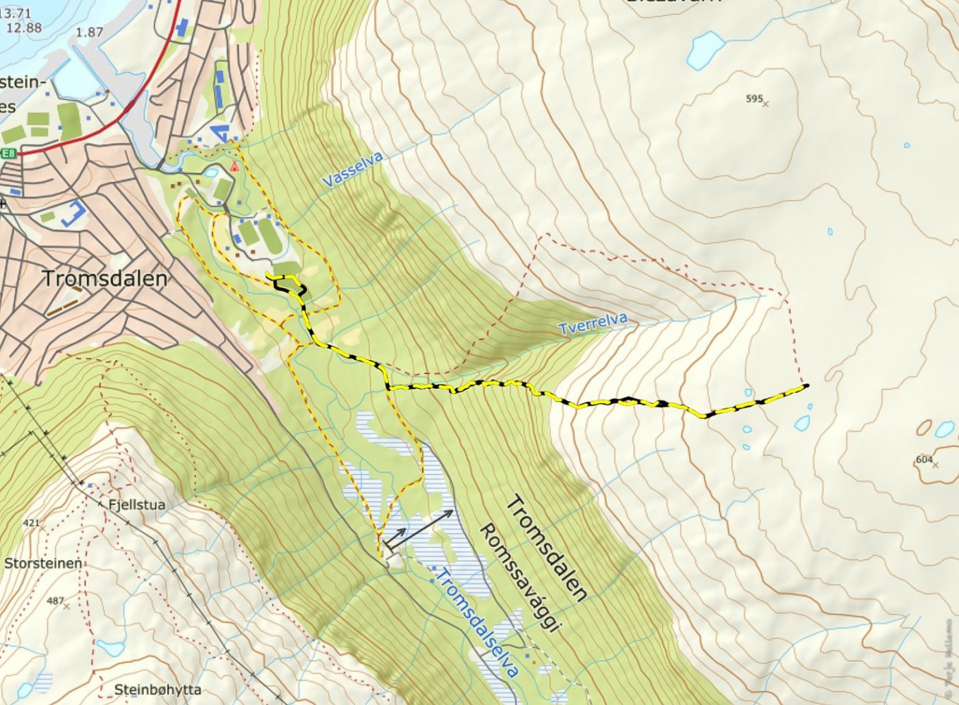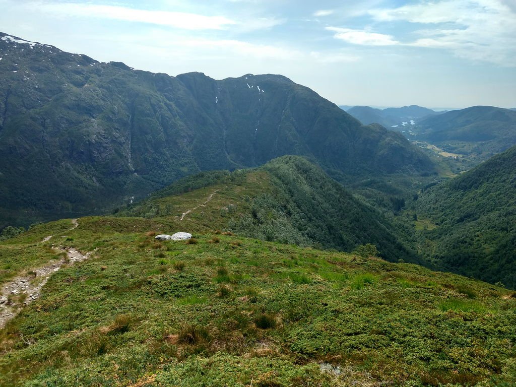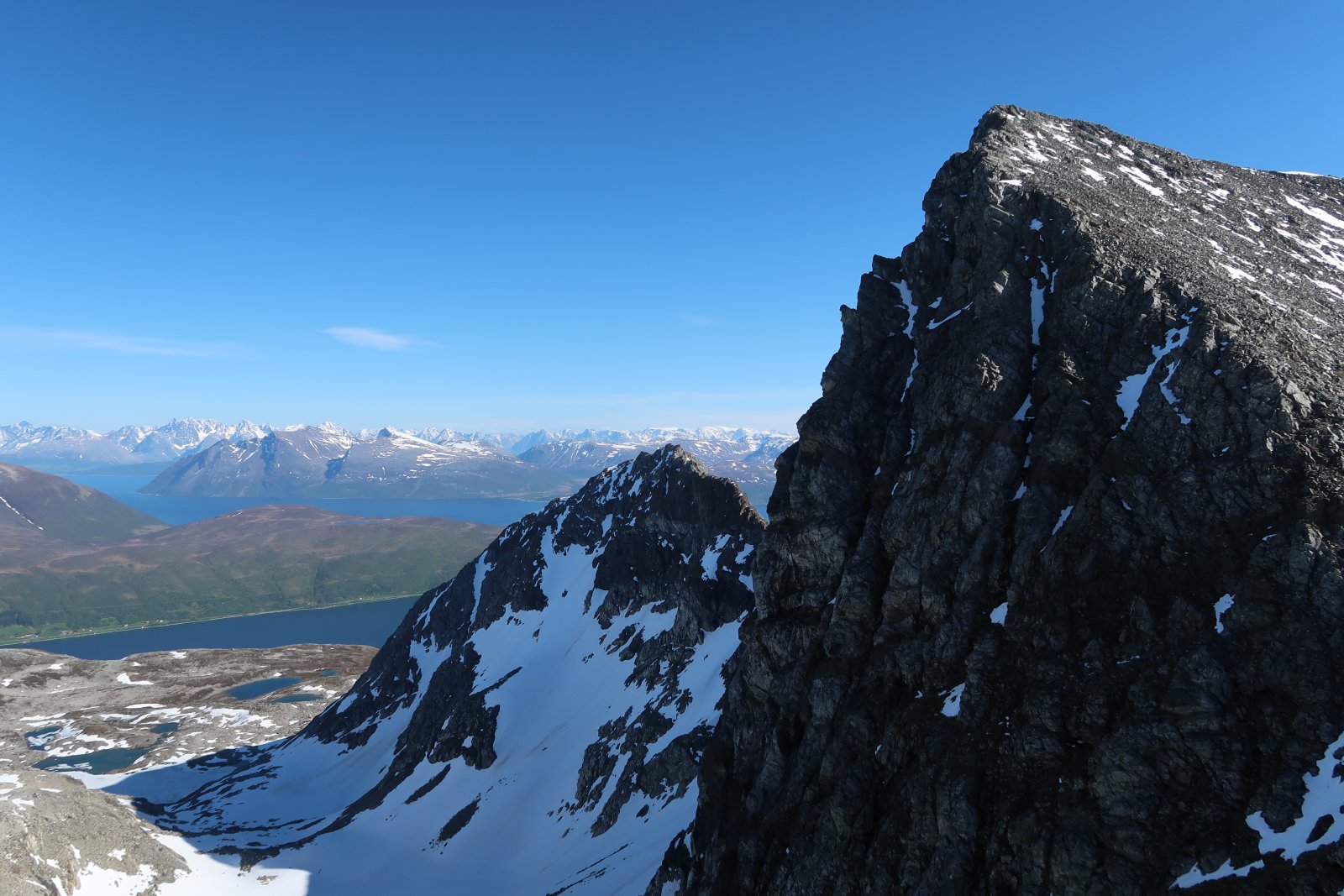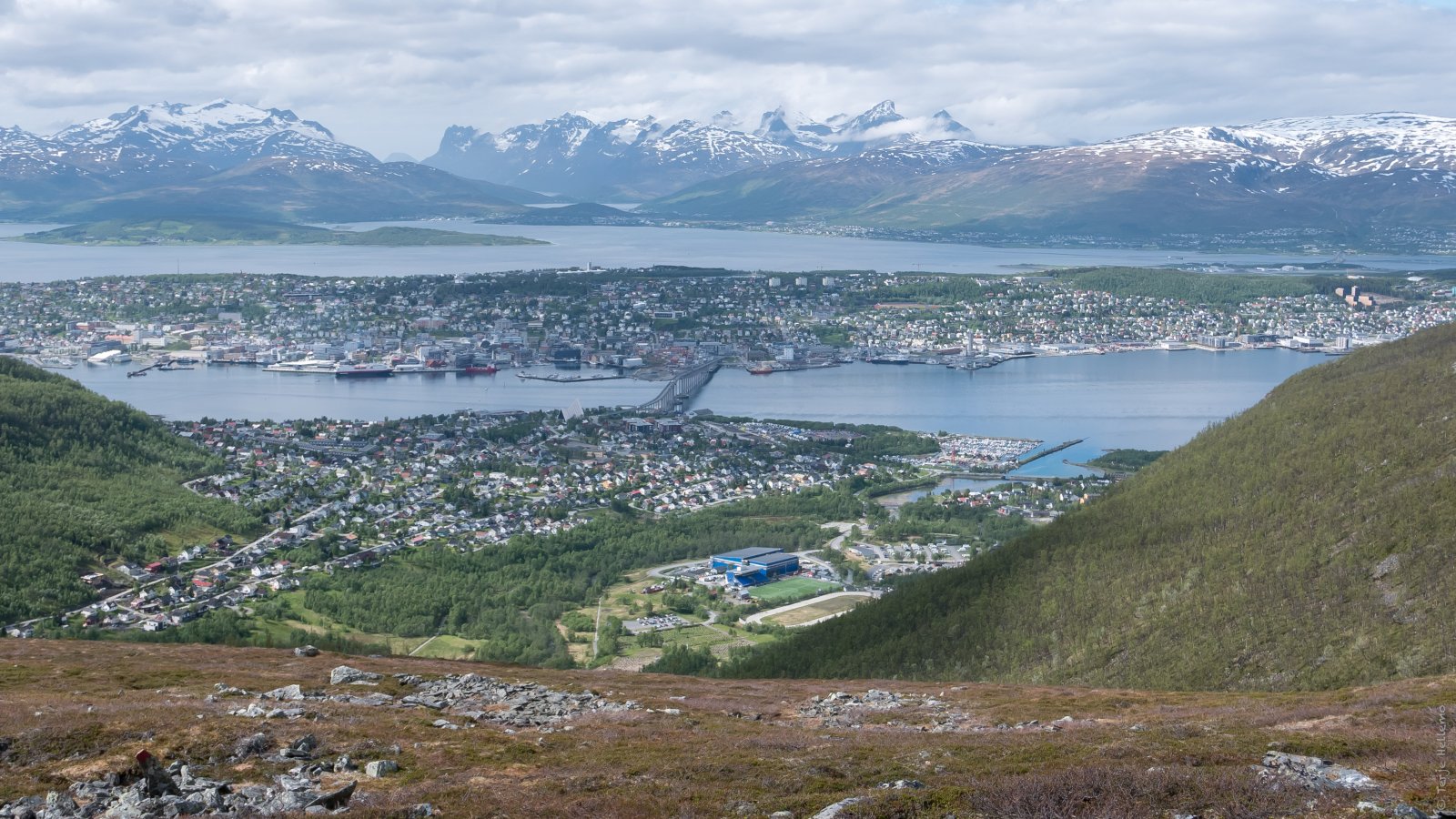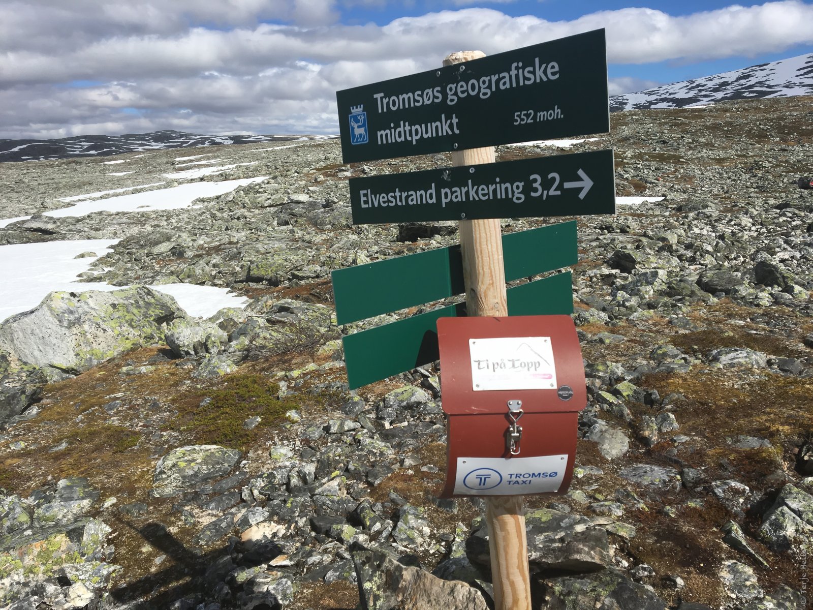 Etter en vinter preget av for lite snø, for kaldt, for mye snø, en gubbe som var krank i en fot og en dørstokk som blei høyere og høyere, var det godt å få startet tursesongen i helga sammen med @TerjeH. Lørdag blei en blåsbort-tur i frisk bris opp til ca 400 moh på Kvaløysletta. Søndag opprant med sol og sommertemperaturer (selv om vi ikke stolte nok på været til å ta på shorts) og vi testet ett av sesongens nye ti-på-topp-mål: Tromsøs geografiske midtpunkt. Slike midtpunkt havner sjelden på en spektakulær topp, og i Tromsøs tilfelle havner det i ei dump oppe på en fjellrygg. Det var rimelig bratt opp mot skoggrensa (over 40 graders helling på det verste) og vi fikk fart på både blodpumpa og syreproduksjonen. Jeg vil anbefale å ta med gåstaver til nedturen. Sånn blei utsikten. Matpakken sklei ned likevel. Litt meir tradisjonelt utsiktsbilde på tur ned igjen. Tromsøya med Kvaløyfjellene bak. Skrekkelig bratt uansett hvordan man prøver å komme seg ut av Tromsdalen. Men alle var enige om at det hadde vært en fin tur.1 poeng
