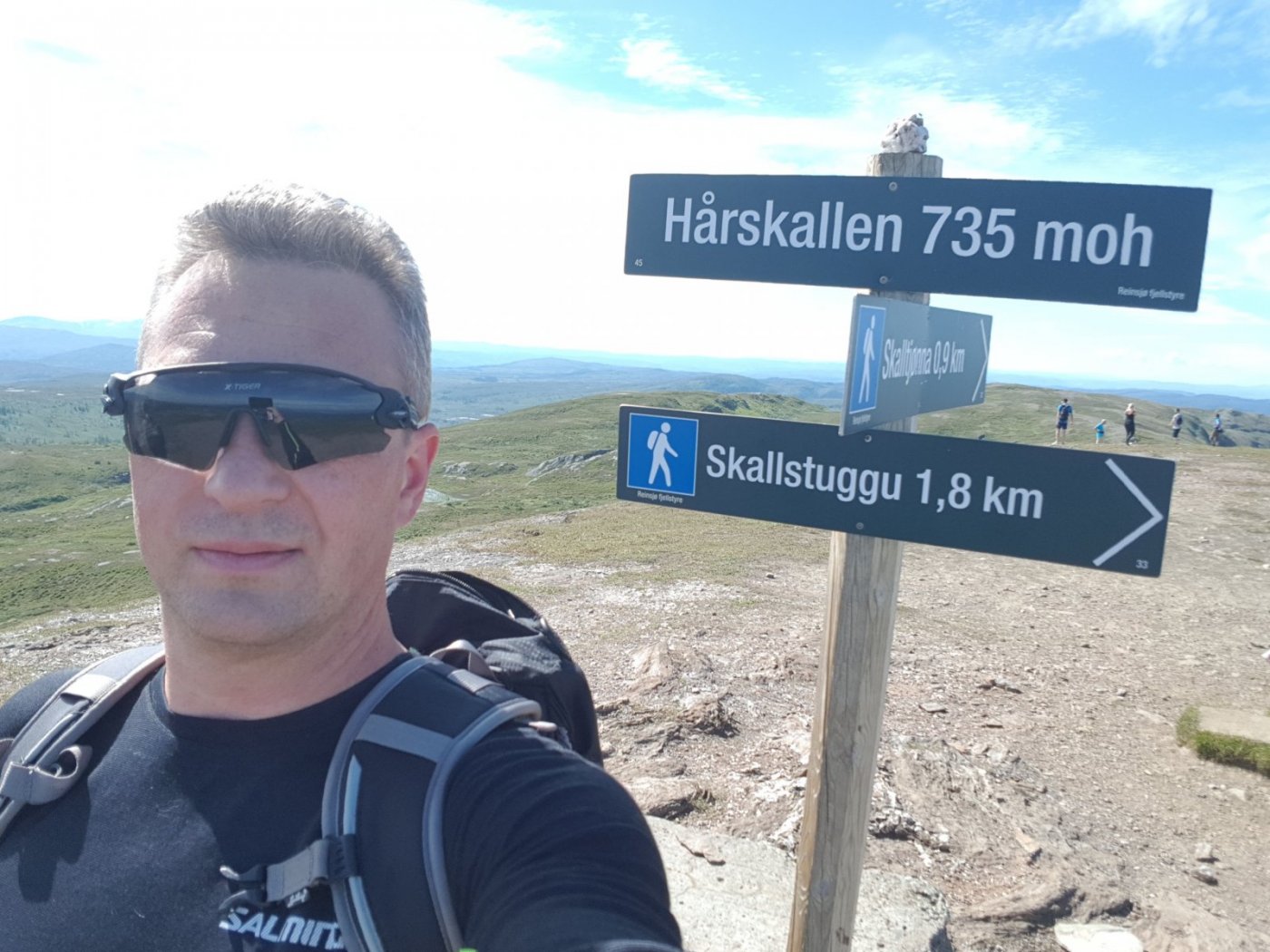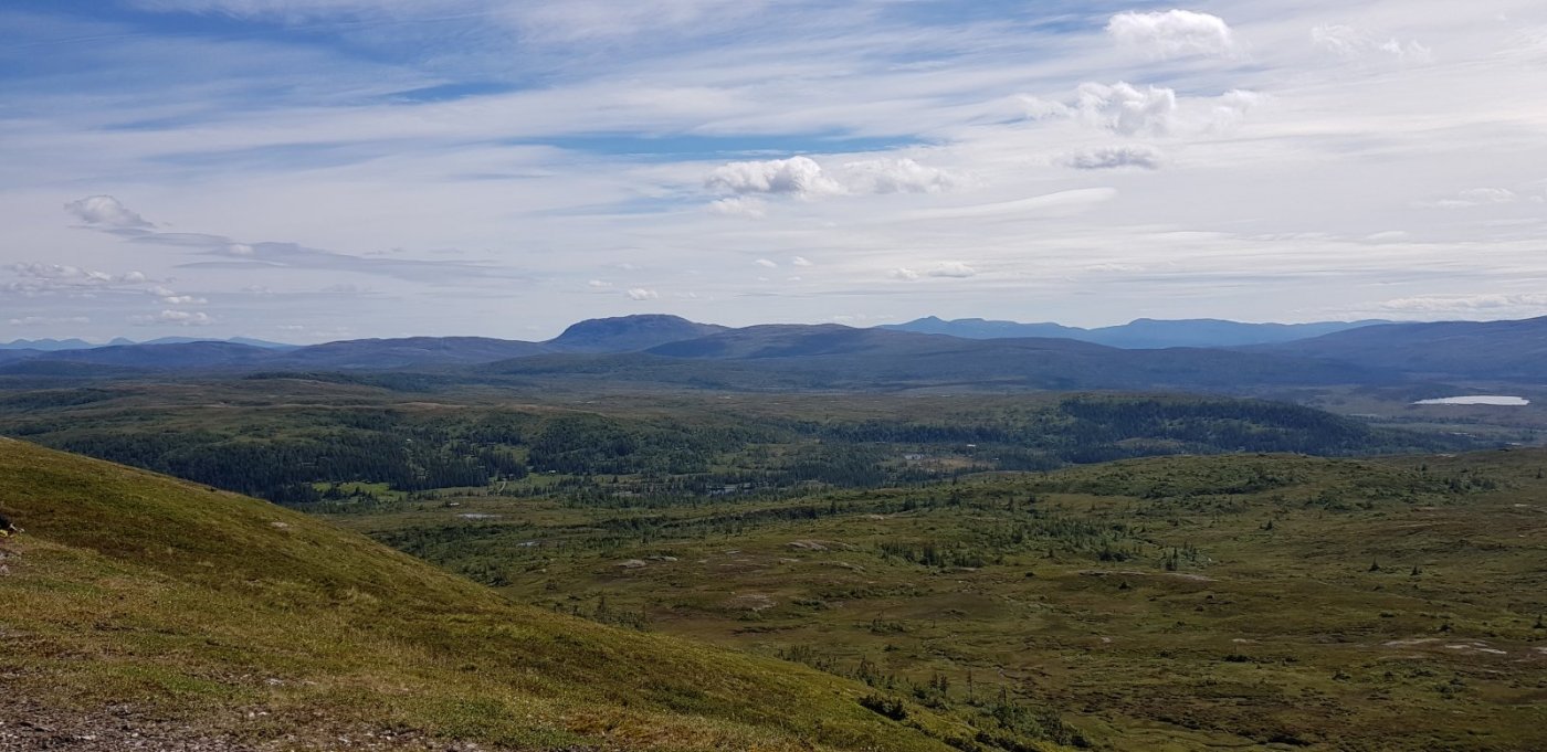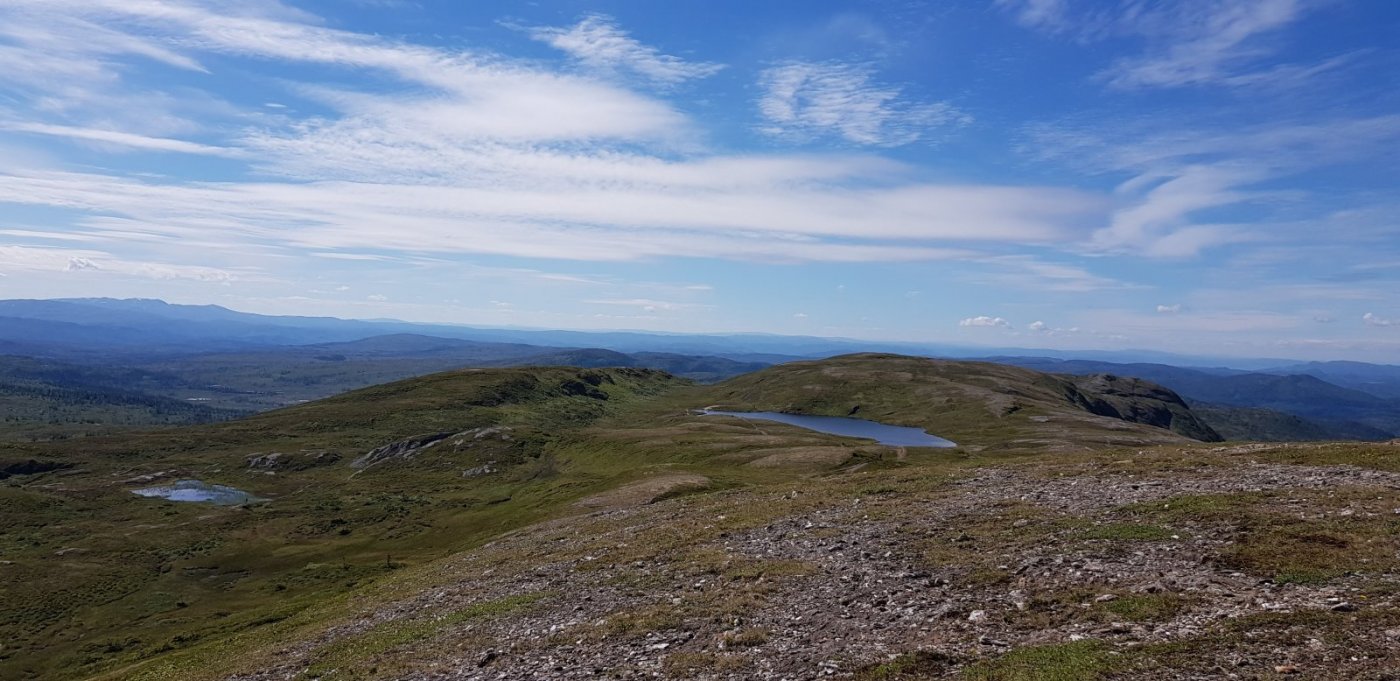 Fortsatt godvær i indre Trøndelag som må utnyttes maks. I går var planen å plukke multer, men det var ingenting å finne. Dermed ble det to topper i stedet: Knippen og Brekkfjellet øst for Røros. Begge toppene ble besøkt i fjor også, men hyggelig med et gjensyn i knall sommervær. Bildet viser Aursunden som ble stadig mer synlig jo høyere opp vi kom. I dag gikk turen til Hyllingen i Holtålen kommune. Nydelig tur opp langs en elv som etterhvert viste seg å ha utspring i et stort elvedelta. Her ble det mange bekker å krysse, men så tørt som det har vært i sommer, var det en enkel sak å komme seg over disse. Turen videre gikk via Skjellåbua som har en fantastisk beliggenhet ved Skjellåtjønnan. Etter en kort kaffepause her brukte vi 30 minutter til toppen. Returen ble lagt på andre siden av vannet for variasjonens skyld.6 poeng