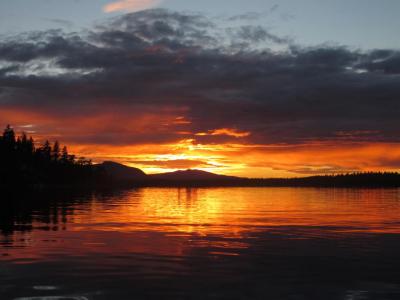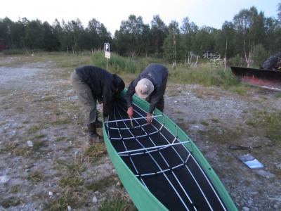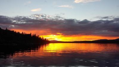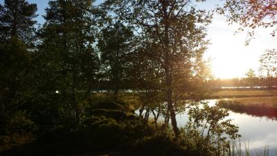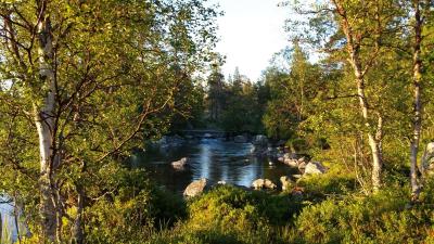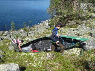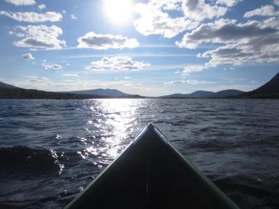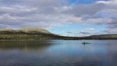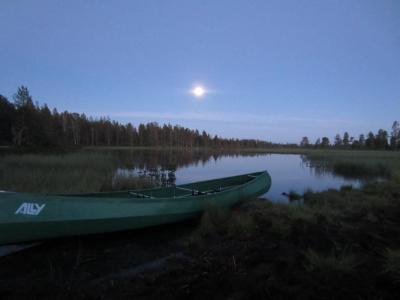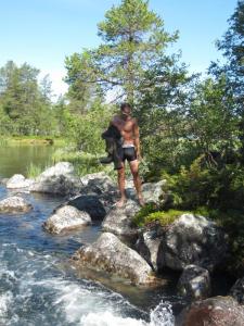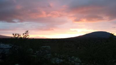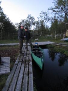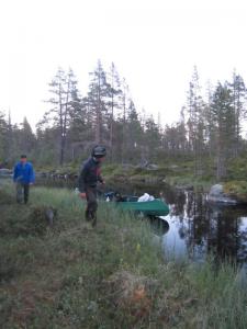 FEMUNDSMARKA OG ROGEN JULI 2014 EN KANORUNDTUR Årets andre tur til Femundsmarka hadde vært avtalt i lang tid. Mine turkamerater denne gangen var Arne (omtalt i forrige rapport) og Henning. I og med at Henning ikke fikk delta på hverken fjorårets jomfrutur eller årets pinsetur, var det dags for å introdusere ham for nasjonalparkperlen. Henning er den desidert ivrigste fiskeren av alle mine turkamerater, og det lyste storfisk i øynene hans allerede ved avreise. Jeg hadde forberedt ham på at Femundsmarka kan være vanskelig fiskemessig, slik at vi skulle unngå eventuelle sure miner dersom fiskelykken uteble. Et annet viktig aspekt ved denne turen var at den skulle foregå vha. kano! Etter mye fram og tilbake hadde jeg endelig gått til anskaffelse av en Ally, og vi gledet oss voldsomt til å få testet denne. Avreise var satt til 13. juli, og målet var Vonsjøen/Kratlland/Grøtådalen, via Käringsjön, Rogen, Bredåsjön og Läsjön. Lengden på turen var ikke bestemt. Det er delig å ha litt løse rammer for slike turer. Da står man friere til å improvisere, og man føler seg mindre bundet, slik at man klarer å stresse ned litt mer. Bildet over: Allyen monteres på parkeringsplassen på Käringsjön. Kun andre gangs montering, derfor veldig stram duk. Min Volvo V50 har vel aldri vært pakket mer til bristpunktet enn den var idet vi forlot Meldal med kurs for Funäsdalen og Käringsjön. Tre mann, tre oppakninger samt en kano var i grenseland for hva som får plass i den relativt småvokste bilen. Vi kom oss uansett helskinnet over grensa, og kanoen ble montert på parkeringsplassen til Per-Roger Wiberg, som fungerer som en slags turiststasjon og innfallsport til Rogens Naturreservat og Femundsmarka. Det var midt i fellesferien, og følgelig en god del bilder på parkeringen. Allyen ble sjøsatt i det som i følge skiltingen er starten på Göta Älv, et steinkast nedenfor gården, og turen var i gang for alvor (prøv å følg Göta Älv i Google Earth, så vil du se at skiltingen ikke er helt på viddene, selv om en slik elv naturligvis har flere kilder). Bildene over: Flere idyller på ferden ned mot Rogen denne sommerkvelden. Ferden ned mot Rogen ble nokså strabasiøs, grunnet stor oppakning, og en god del bæringer. I tillegg fikk vi litt trøbbel med å få kanoen til å gå rett. Tre mann og tre tunge sekker er i grenseland både volum- og vektmessig (strengt tatt over grensen volummessig), og det tok en stund før vi fant en god vektfordeling i kanoen. Å få tre mann og tre store sekker, samt en del fiskestenger og annet utstyr, ut og inn av kanoen for hver eneste bæring er relativt strevsomt. Jeg må si at jeg er imponert av hva Allyen tåler av påkjenninger. Den fikk virkelig kjørt seg. Bildene over: En del lining og bæring ned mot Rogen. Vel nede ved Rogen ble vi møtt av bølger som slett ikke virket avskrekkende. Jeg hadde ventet verre forhold, da jeg hadde fjorårets tur frisk i minne. Heldigvis blåste det fra østlig retning, som er gunstig mtp. kryssing. Jeg var allikevel noe skeptisk da vi la i vei. Halvveis ute på vannet begynte bølgene å bli relativt store, og jeg var ute av komfortsonen. Det gjaldt Arne også. Henning derimot, var irriterende rolig, og ville til alt overmål ta seg tid til å fiske. Jeg og Arne padlet de vi var karer om, mens dorgen til Henning var mer i lufta enn i vannet bak kanoen. Vi kom oss uansett trygt over, og i ettertid ser jeg at denne krysningen var relativt udramatisk. Min skepsis bunnet stort sett i total mangel på padleerfaring. Det skulle derimot vise seg at Vonsjøen ville by på større problemer enn det Rogen gjorde.. Bildet over: Turist i solnedgang. På veg inn til Bredåns utløp i Rogen. Inne i vikene ved Bredåns utløp var Rogen helt blikk stille, og padlingen her inne var veldig fin. Det begynte å bli mørkt, og solnedgangen speilet seg i vannet. Vi fant etter hvert fram til gapahuken innerst i vika. Fantastisk vakkert her inne! Gapahuken var en del av en opparbeidet leirplass helt inntil utløpet av Bredån. Her fantes ferdig kløyvd ved, bålplass, teltplasser og søppeldunker. Riktig nok bar området litt preg av slitasje, men det var fritt for søppel og rot, og gapahuken og bålområdet var velholdt. Svenskene er flinke til å tilrettelegge for friluftsliv. Bakdelen med denne tilretteleggingen er at noe av villmarksfølelsen forsvinner. Dette er litt smak og behag, men akkurat denne plassen syntes jeg var veldig fin, og den idylliske og isolerte plasseringen gjorde at stedet hadde bevart noe av villmarksfølelsen. Det faktum at vi var fullstendig alene her inne, midt i fellesferien, hjalp selvfølgelig også. Vi satte opp teltene og koste oss ved bålet i gapahuken før vi tok kvelden. Jeg var så heldig at jeg fikk hele teltet mitt alene på denne turen. Ikke det at jeg har noe imot mine turkompanjonger, men å ha teltet alene er fantastisk deilig. Man slipper å forholde seg til andre, og kan strekke og vri seg så mye man vil gjennom natten. Bildet over: Henning nyter villmarksluksusen som tilbys av svenskene i gapahuken ved Bredån. Vi våknet til stekende varme og sol den neste dagen. Det første jeg gjorde etter å ha stått opp var å gå ned til den dype, krystallklare Bredån for å freshe meg opp litt. Det føltes helt fantastisk å stikke hodet ned i vannet og vaske bort "glovarmt telt-følelsen". Et strek i regningen var at jeg glemte å ta av solbrillene, som ble tatt av strømmen og ført noen meter nedover. Jeg så de synke til bunns og bli liggende. Ikke annet å gjøre enn å hoppe uti! Bekken er bare et par meter bred, men i hvert fall 1,5 meter dyp akkurat her, og som sagt helt klar, som selve definisjonen av friskt fjellvann. Det endte med en forfriskende dukkert for hele kroppen. En deilig start på dagen. Bildet over: Ufrivillig, men herlig forfriskende, dukkert på morgenkvisten etter første teltnatt. Det var bra at starten på dagen var såpass god, for fortsettelsen skulle b