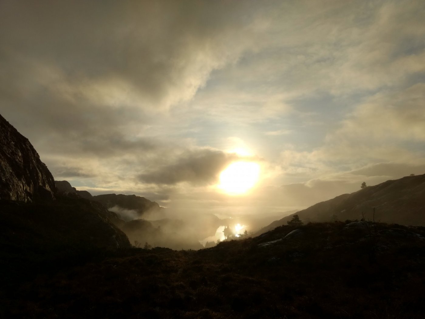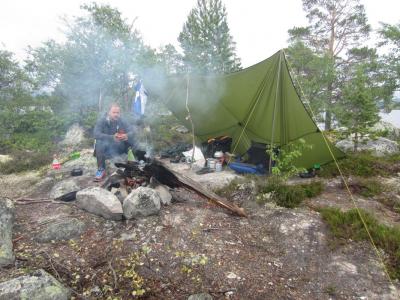 Andre forsøk: Dette ble andre boller. Har byttet ut TTTM enkel med dobbel, og montert mønesnor. Jeg kutta dessuten ut downmat, og hadde bare reinskinn og bamse. Det ga en mindre "tårn" følelse. Og alt lå veldig stabilt gjennom natta. Det doble sovepose-opplegget fungerte bra sist og ble brukt denne gang og. Til neste tur har forhåpentligvis den nye soveposen kommet (Mountain Hardware Lamima Z Blaze). Våknet i natt av at jeg frøs på skuldrene, men pakka 3-sesongeren godt rundt og det ble bedre. Sov sammenhengende i syv timer, og det kunne blitt lengre om jeg ikke hadde blitt vekt.4 poeng