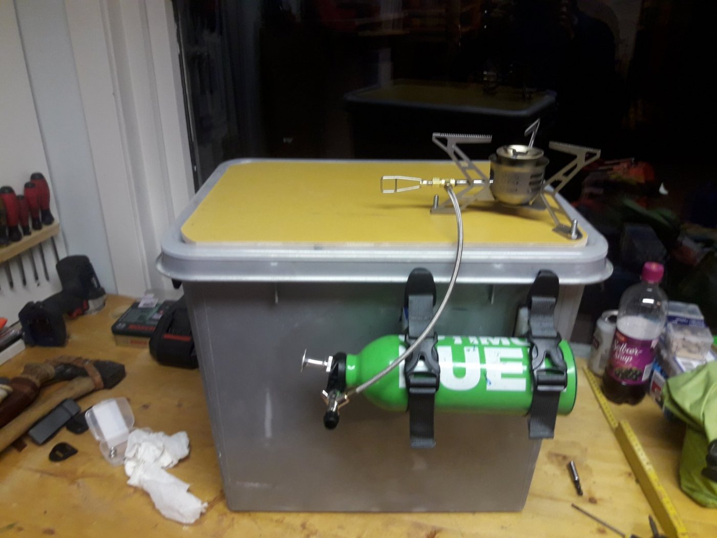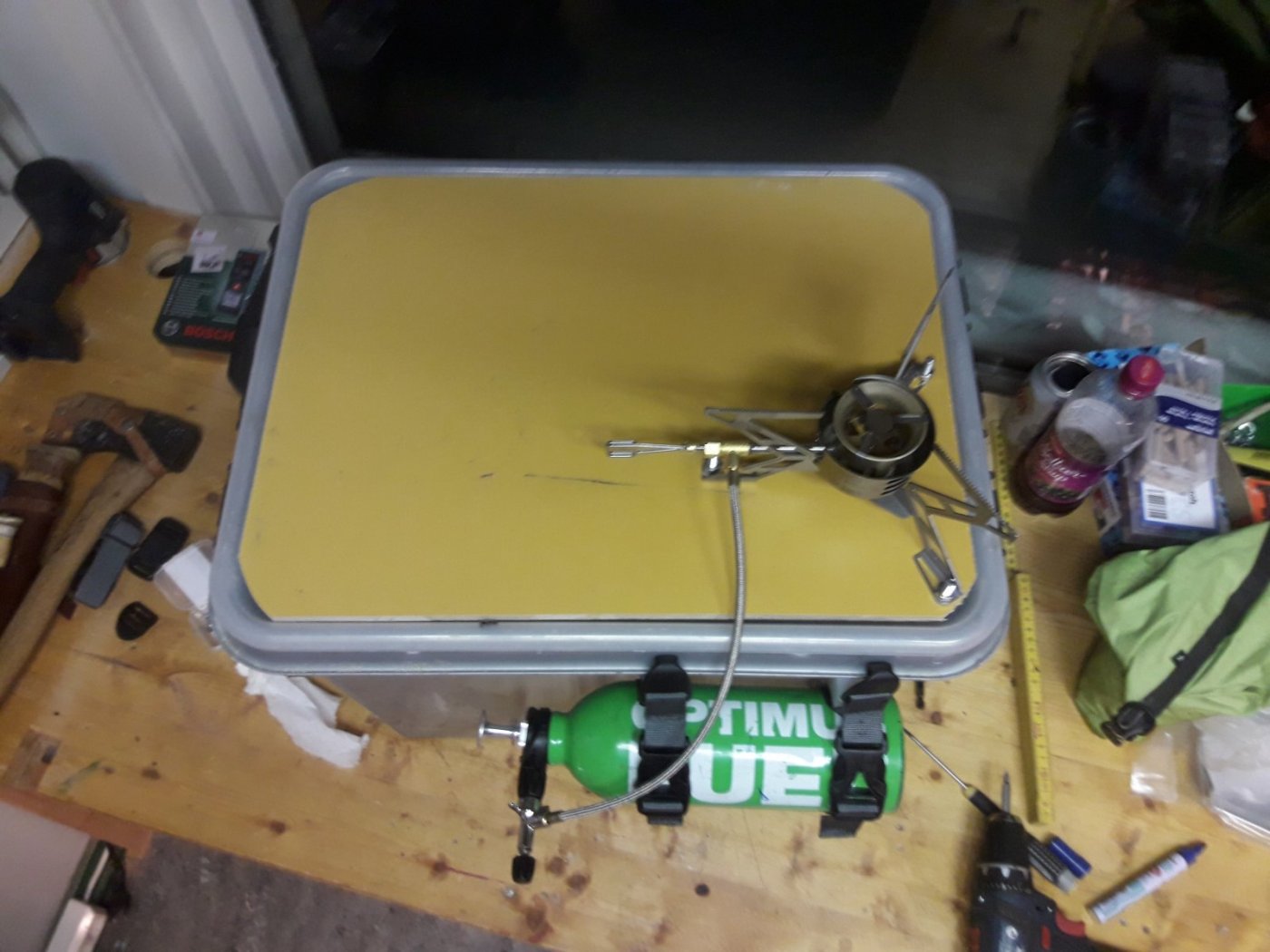 Har altid med meg en Stor smartstore plastkasse med meg på vintertur, Fine å pakke i også flotte til å bruke som bord! Har hatt Primus stånede på denne, men har gått å fundert på å videre utvikle denne... Så etter 2 Dager i Boden er resultatet klart, Må si meg meget fornøyd, god plass til primus og kjeller på Kryssfinerplata som er limt fast i plastkassa, Ikke den beste finish på prosjektet men planen er å gjøre samme løsninger på Zarges Kasse, da plast og streng kulde over lang tid ikke altid er forenlig.4 poeng