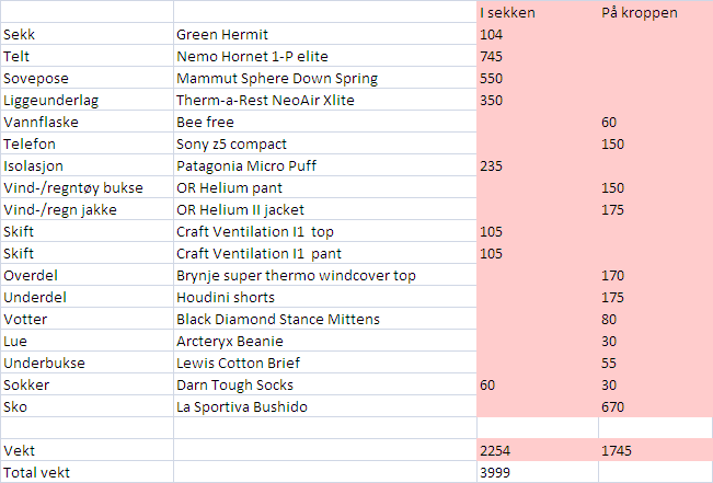 Hei, Ønsker å få noen innspill på mitt lettpakkingsprosjekt. Turen er som følger: Dag 1 (fredag etter jobb, kjører fra Oslo) : Valdresflya-Leirungsdalen-Svartdalen-Gjendebu Dag 2 (lørdag) : Gjendebu-Bukkelægret-Memurubu Dag 3 (søndag hjem til Oslo): Memurubu-Besseggen-Gjendesheim-Valdresflya Utfordringen er (utenom avstandene): 1) Totalvekt under 4kg (på kropp og i sekk) 2) Overnatting utendørs 3) Ikke lov med buss, bil, båt, sykkel, skateboard osv. 4) Proviantstopp på Gjendebu, Memurubu og Gjendesheim er lov. Foreløpig pakkliste (må kontrollveies en gang til)1 poeng