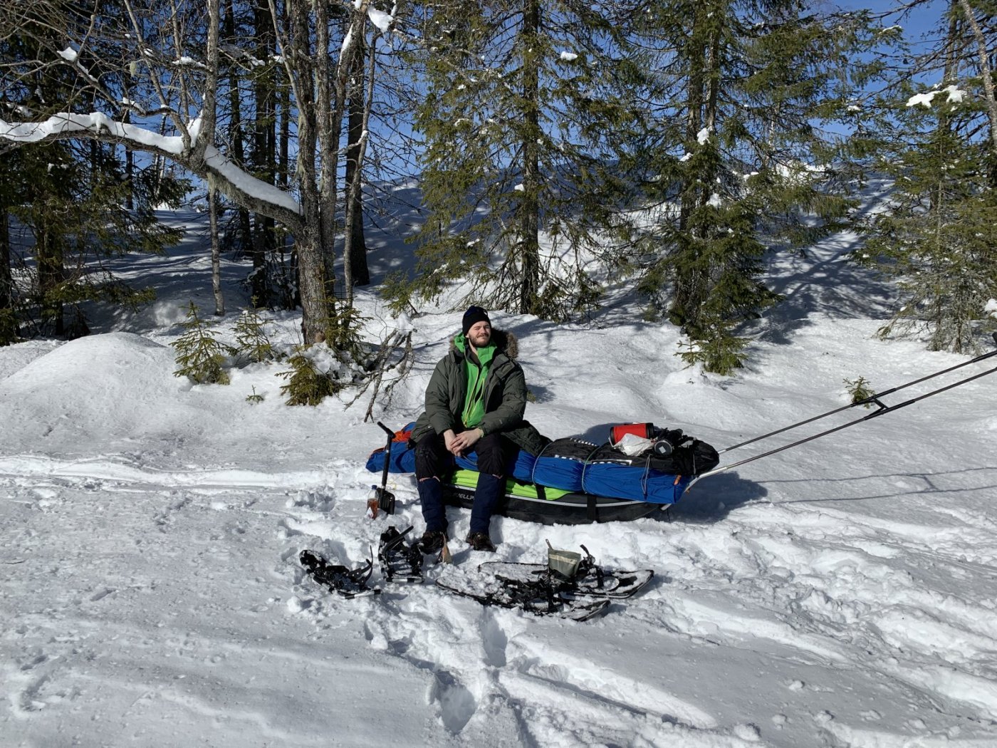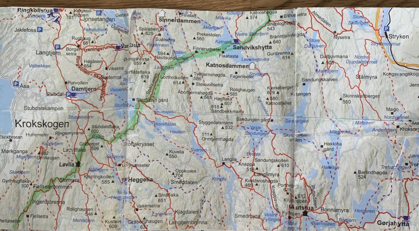 Etter turen Da er det tørking, vasking av tøy. Oppvask Lufting av dun, soveposer og rastejakke. Aller kjedeligste er tørking av teltet syns jeg. Her er brøytekartet som Løvenskiold har for Nordmarka. Det er grovt, men gir viktig info til denne turen, særlig når det kom så mye snø. Ellers brukte jeg dette gratis kartet fra skiforeningen og imarka appen for status på løyper. Topokart app til tracking etc. Hadde med stort kart og kompass i pulken. Eneste stedet jeg navigerte litt feil var her, hvor jeg hadde tenkt å gått på høyre side, men det var bedre å gå på venstre side ifølge en mann vi traff. Gikk ca 100 meter feil. Vi gikk 65 km totalt, og det går forbausende mye opp og ned. Det og gå nesten samme ruta frem og tilbake oppleves som to forskjellige turer, spesielt siden vi gikk med «tvangstrøye» stivt drag. Alt utstyret funket bra, og ingen problemer, bortsett fra tannbørsten min som ikke var riktig vedlikeholdt siden forrige tur🙈 Kommer til å flytte et surrefeste for ei dør på teltet, den står 10 cm for lavt. Det meste av utstyret som var men ble brukt, men burde hatt med en stor Thermos til. Da kunne vi ha smeltet mer snø på kvelden. Det gikk ca 6-7 liter med vann i døgnet. Har tatt ca 450 bilder, og lagt ut nesten 200! Fant mer 4G dekning, enn forventet. Hva jeg kommer til å huske fra turen, er at vi gjennomført etter ønske om type tur, på tross av mye vær, og at det var veldig hyggelig, og mest minnerike bilder fra turen er disse fire. Som døpt, tilbake i sivilisasjon. Uttalt av herr sønn etter dusjen når han kom hjem.2 poeng
