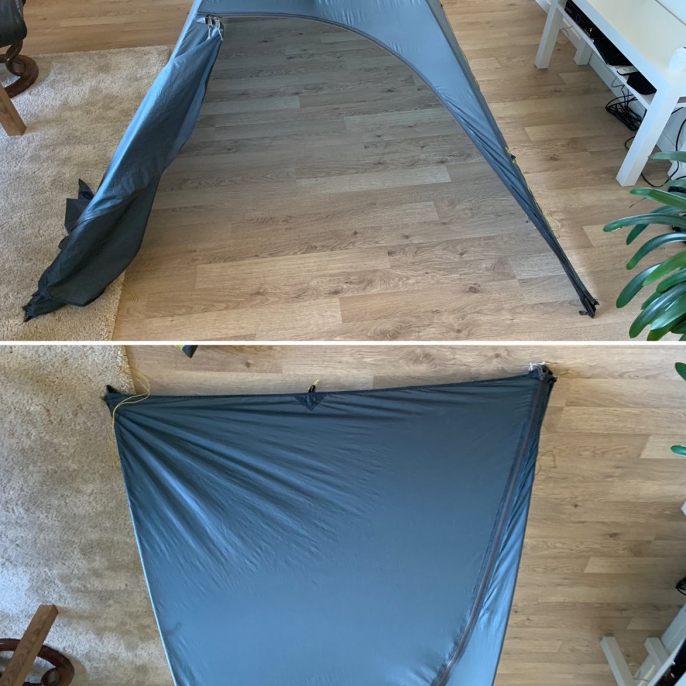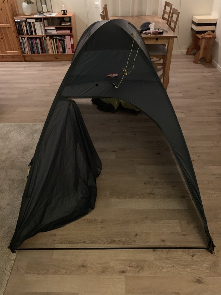 Ja her er hele innerteltet løst, men det forskrever seg om du gjøre det i døråpningen. Jeg har fått sydd på et bånd, slik at jeg ikke er avhengig av pluggfester. Sparer glidelåsen mye på dette. Med og uten bånd - frittstående. Ja, blir litt lei, instaryddige telt og tok det for å vise hvordan det ble - satt opp i mørket. Syns forøvrig at for 1.3-1.4 kg med telt, at Trolltind kommer veldig bra ut med tanke på vind. Trenger ikke 16 plugger som Feks ombygget Ringstind for å stå bra i vind. Spesielt bra med de ekstra festene jeg har på mitt som gjør at det tåler litt snø.1 poeng