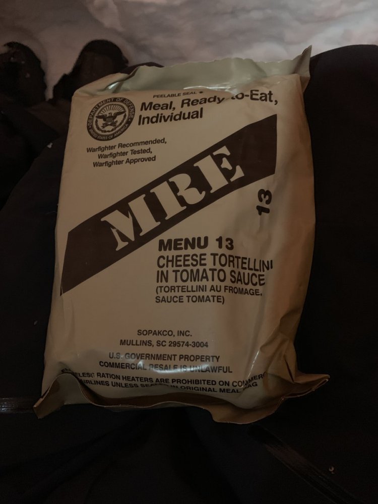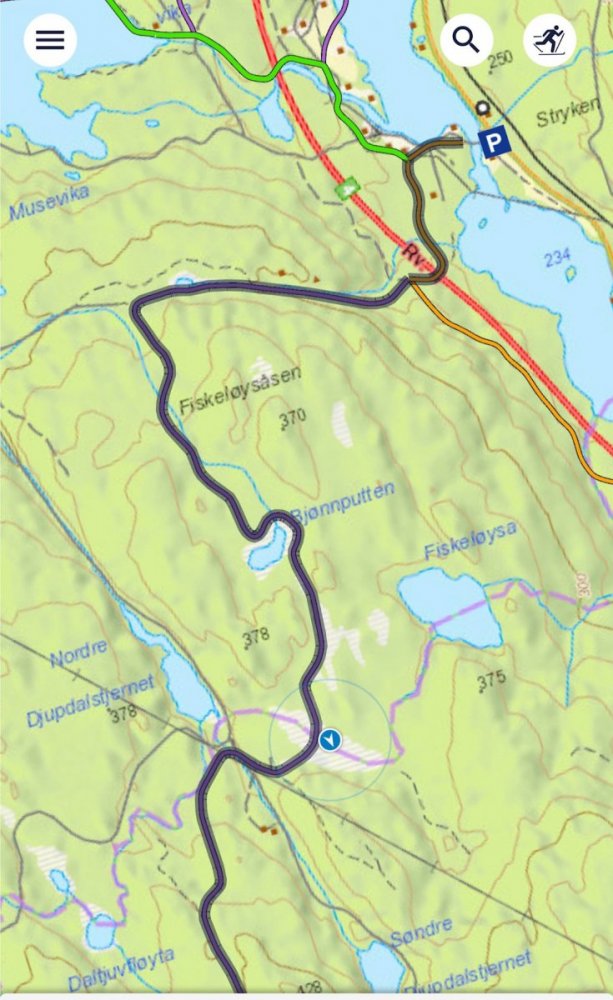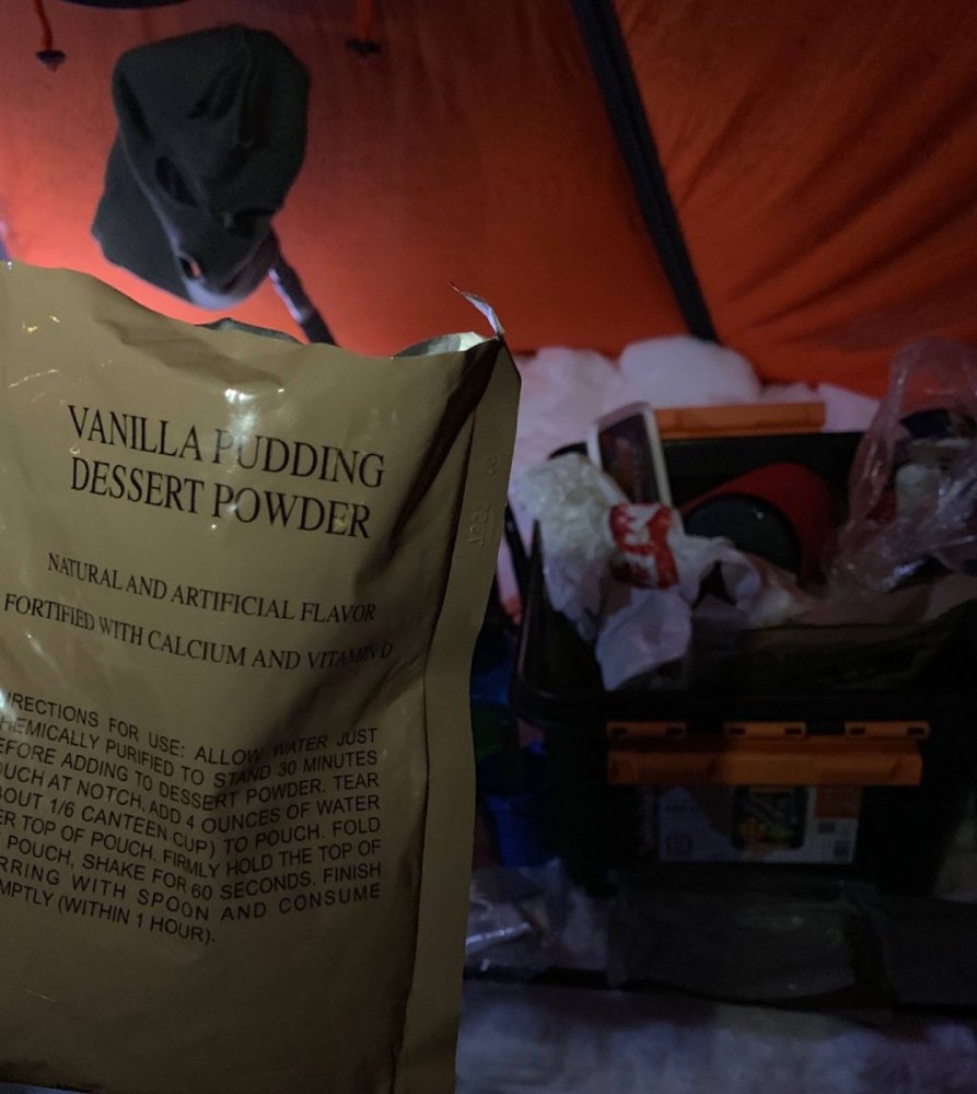 Da valgte vi å slå opp teltet og ta lunsjpause inne det. Vi ligger på ca 360 meter og Stryken stasjon på 250 MOH. Vi sparer 110 høydemeter med pulk om vi slo leir her. Det er meldt sludd og jo høyere vi er jo større er sjangsen for at det er snø som kommer. Vi ligger på ei fin myr og det er ca 4 km ned til stryken. Det begynte å snø når vi startet og gå. Her gikk det en snarvei over et vann. Vi gikk rundt før vi fant det ut... RV4 ble passert. Ruta vi har gått ene veien. Veldig greit å slippe å ha pulk opp disse bakkene. Jeg husket snarveien, det gjorde ikke avkommet, jeg vant, ser dere etter syns noe grønt i skogkanten😀 Snødde igjen med vi gikk, her på tilbaketuren. Teltet ligger fint til på myra. Har satt opp fullt sett med barduner. Jeg har med en CO alarm for å teste den ut. For å se om den gir noe utslag hang jeg den rett over, ikke noe utslag enda. Den piper under test hjemme med andre primuser. Da blir det MRE Feltrasjoner til kvelds. Litt artig med forandring. Mye emballasje. Ble ikke varmt nok. La de i vannbad. Da blir det en god natts søvn og vi er litt spente på hvordan været blir. Ligger litt taktisk til. Vi kan gå skiløypa eller veien. Men vet ikke om hvor raskt de i såfall kjører løyper/brøyter. Følgermed mye rart, litt tidtrøyte og litt kunstig smaker. Slags pudding. Hovedretten lignet spagetti ala capri. Men lite. Litt middag og 3 desserter, pluss snacks. Mye vær, og litt vind. Spent på morgendagen. Blir tidlig kvelden i dag også. Edit: Ser det kan gå mot snørekord, blir nok en minneverdigtur dette.1 poeng