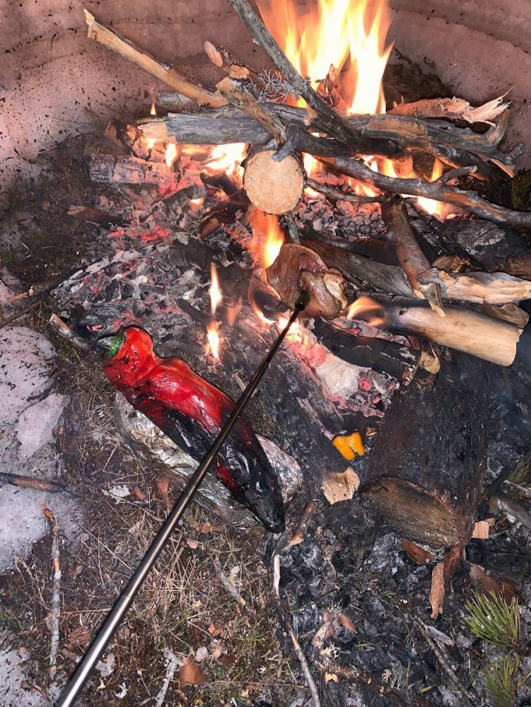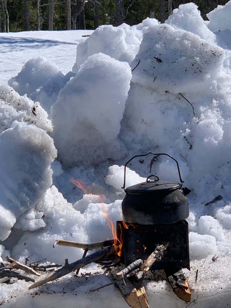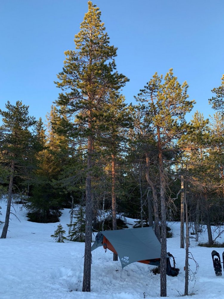 Det ble en del snøsmelting og med tørr ved funker det bra. Men du ser det tar fyr under. Men både vann og kaffe ble det, og det veltet ikke mere. hengekøyeoppsettet ble så lav jeg kunne ha det, for å skjerme for vind. Men det subbet ikke. Naboen satt opp sin i kanten, men jeg ligger litt mer utpå. Råten snø, men klaker fort på kvelden. Helt klart vær, men litt vind, men betydelig mindre enn dagen før. Sola går ned ved 8 tia. Bålgrop klar. Lite pent bål. Mere kaffikoking og glør for matlaging. Entrecote - bakt søt potet og lange paprika. Naboen hadde real som base med litt ekstra kjøtt oppi. Blir litt crash i mat opplegget når han kommer på kort varsel, og jeg alt var på tur. Han hadde med smågodt også. Jeg hadde bare kamferdrops. Det ble mest prating og ikke mange bilder ble tatt, i seng kl 23 og helt stjerneklart. Bildet er tatt med iPhone.10 poeng