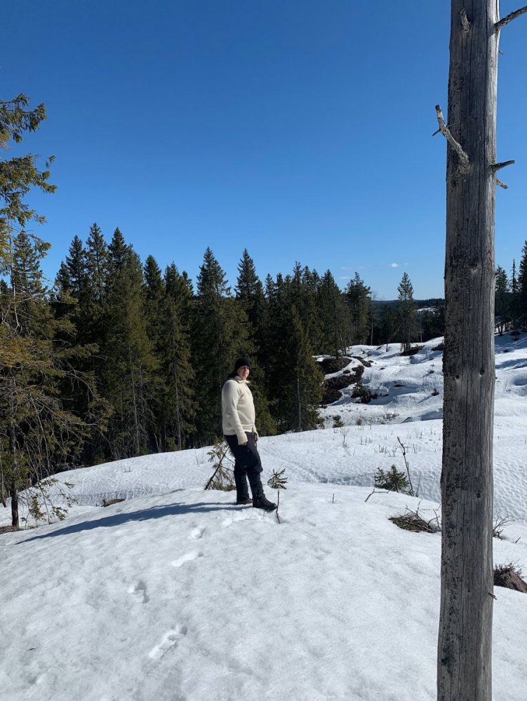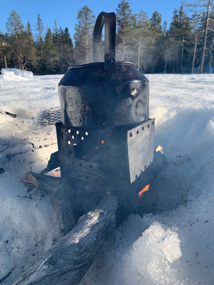 Artig med Amokkoppen som du kan måle 30 grader med. Fyll kaffe til linja Så setter du koppen på båndet og du ser om du har 30 grader. Ikke en sky på Norefjell når jeg gikk. Fant ei mye i le. Mye flotte gamle furuer, som får stå i fred. Heldigvis mye å sanke ellers og trenger ikle så mye ved. Her er jeg i ly av Kleivåsen. Bare sol og fint, men litt vind fra alle kanter. Gapahuken redder dagen, nok en gang. For 200kr som den kostet har den gitt mye glede. Pølser til lunsj i dag. Spadd en liten grop til bålet. Meldt mye mindre vind, og litt mildere. Tar sjangsen på ei ny natt, og naboen kommer innom for å henge litt han også. Vedovnen funker fint! Men plutselig hadde det jeg satte den på, brent opp også... Så da satser jeg på at det blir ei bra natt, og hyggelig med overnattingsbesøk også.6 poeng