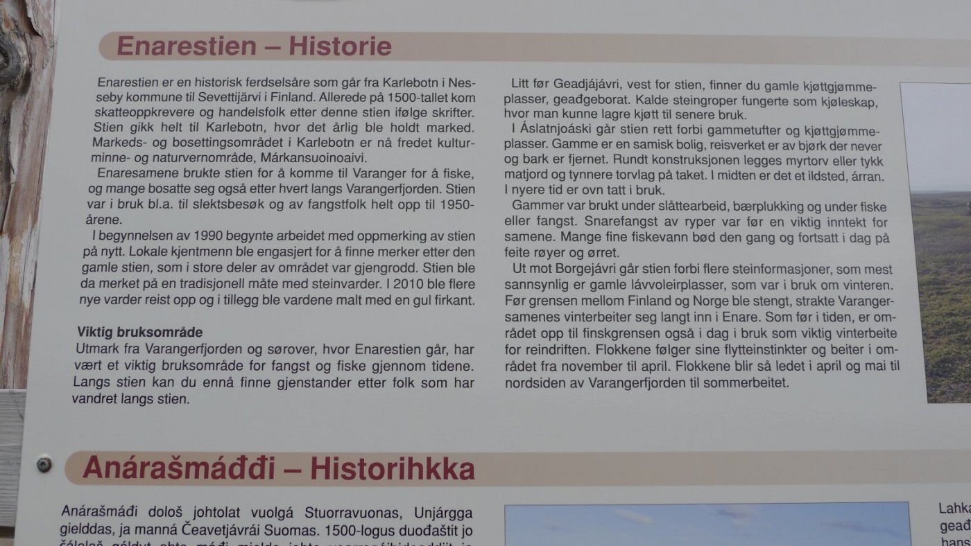 Om du mener den som går til Karlebotn har jeg gått deler av den. Fint det, spennende fiskemuligheter. Bjørn hadde jeg ikke bekymret meg for, den holder seg nok langt unna. Legger med noen bilder som kanskje kan være til hjelp. Om du googler Enarestien og gps spor tror jeg du finner gpsspor som kan brukes..1 poeng