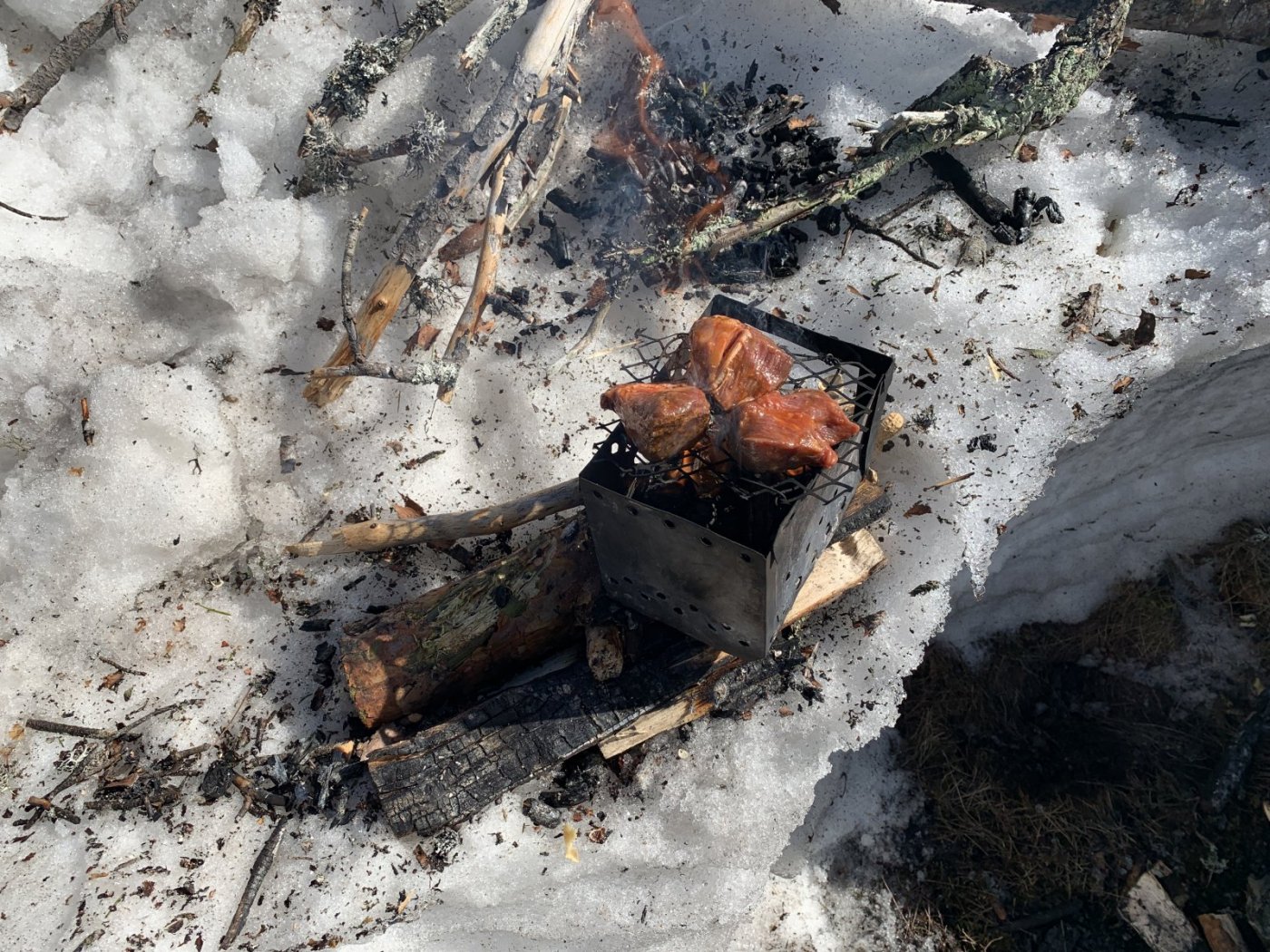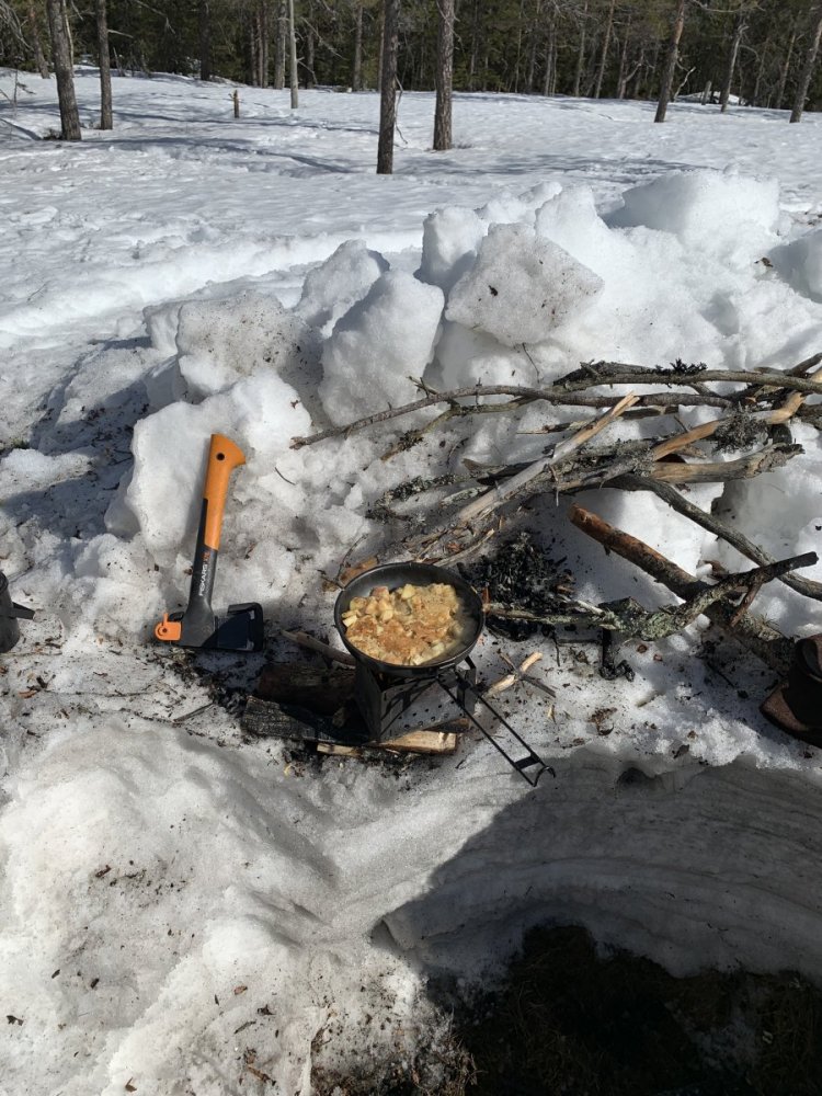 Naboen hadde glemt solbriller - så ble litt mysing. Litt vind i dag også. Men bare sol og varmt. Det ble mye matlaging på @Tom42 sin ovn. Kokken laget stekte epler. Og blandet det med pannekakerøre. Så og smakt bra ut. Jeg testet grillfunksjon som ovnen også har. Entrequte Oppkuttet søt paprika surret i kryddersmør. Alt blandet med søtpotetmos - smakte fortreffelig 😀 Måtte ta et bilde av dagens sky, ellers bare sol. Blir en bra grop etter bålet og all snøen som vi måkte vekk. Skiløypene er harde og her kjører de ikke lengere. Truger for å komme seg ut til løypa på roten snø. Deretter brodder. Veldig hardt. Syns ikke at vi går her. Enkelte steder bare blåisen. Stoppet og tok bilder av Tyrifjorden og sendte inn til Regobs. Det har vært en utrolig fin tur, føles som den har vært mye lenger enn 3 dager. Har lært mye om køya også, da i vind og kulde.1 poeng