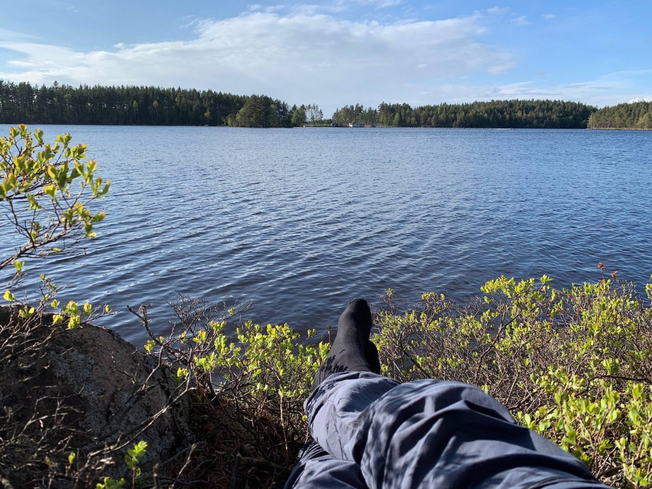 Stor åpne jorder, den sure vinden får bra tak. Men sola varmer. Det ble noen få meter på asfalt, så inn på små grus/traktorveier. Så inn på små stier igjen, veldig forbauset over hvor lite asfalt det faktisk har blitt i dag. Dagens hovedmål, post i butikk😀 Merker at sekken går fra veldig lett og opp med ca 4-5 kg med mat. Det betyr at delmål nr 2 av 6 er i mål. 🎉 Litt asfalt og inn i skogen igjen. Snakket med et par små gutter på 7-8 år, som laget en fallgrop for å fange dyr. De lurte på hva jeg skulle, og jeg sa jeg skulle ligge i telt. De viste om en fin plass. Fikk greie på hvor det var. Etter ca 30 meter dukket plassen opp! Komplett med sliten lavvo. Mer små veier og stier Endelig et skilt, viste ikke at det het noe her, men var her jeg hadde sett meg ut som teltplass. Spesielt skilt, dog for en meget god grunn. Her var det 100% frittgående høner/hane. Ikke ofte en ser dette. Greit å ha hund i band da. Hit kom jeg - helt etter planen. Appene er stort sett enige også om hvor langt jeg har gått. Et skilt viser trolig veien videre, må studere kartet i kveld. Fantastisk flott odde, dett blir en fin kveld. Status er at kroppen er like fin etter ei uke, ingen gnagsår, buksa passer forsatt, og klar for regnværet i morgen. Til og med 100% strøm på AirPods, DAB-radio, inreach og mobil! Alt etter ei uke på tur. Satser på at de to siste ukene også går etter planen.2 poeng