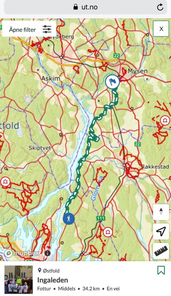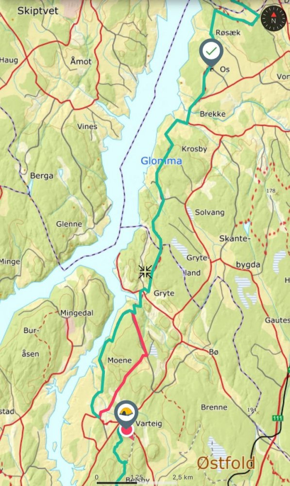 Her var teltplassen, glad lampa jeg lå under ikke funket. Åpne fine områder, ble ca 1,5 km på asfalt, men ikke noe trafikk. Bra merket, måtte Google litt Dette dukket opp. Inga-leden. Den kjente jeg ikke til og er bra merket, den kan jeg faktisk følge til jeg svinger av mot Askim😀 Flotte lettgått grusveier. Nok et Rådyr Mer kjerreveier, opp og ned, hit og dit. Glomma kommer til syne, den er utrolig stor. Litt regn på vei. Er noen infoskilt, Men ikke mye å se😂 Mer elv, skog og jorder om hverandre. Det er smale stier, ofte bratt. Det veksler ganske mye, men glatt å gå regnet. Ned i bekkejuv,. Blir som å gå i bekken et lite stykke, gode muligheter til å knekke stavene her. Tar det veldig med ro på slike plasser, når det er glatt slik som her, leiregrunn før og etter også. Oppigjen på andre sida, Østfold er ikke bare flatt. Her er jeg nå. Det siger nordover. Tipper nesten halvveis til Oslo omtrent. Håper å slippe unna de værste bygene.13 poeng