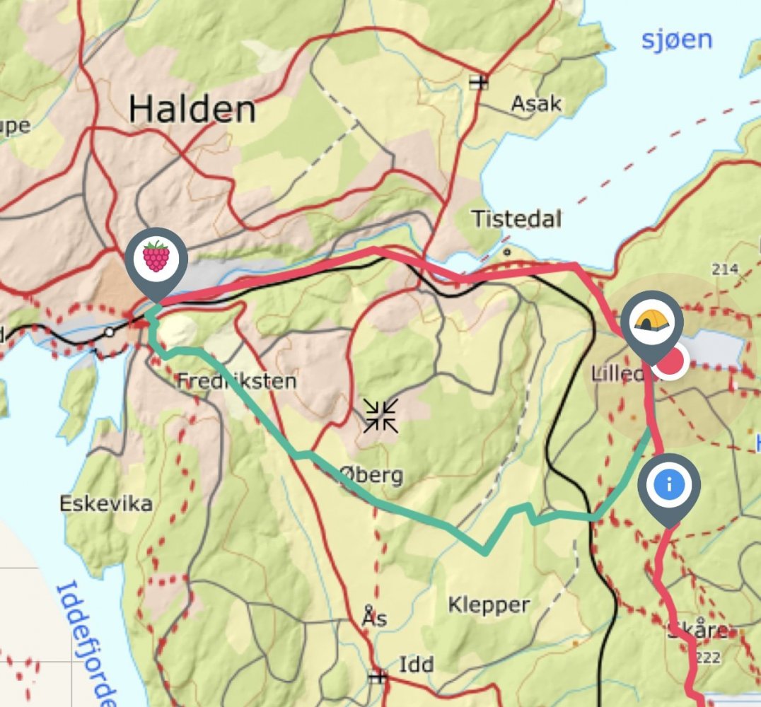 Da jeg valgte å gå et par km tilbake, var det både gode stier og god merking. Lettgått og ikke noe knoting. Fin skogbunn å gå på. Passerte jernbanelinja igjen. Kom ut på åpne områder, men surt. Av og på med jakka og hansker. Fine gårdsveier og ikke trafikk. Skumle skyer i horisonten, men fikk ikke noe på meg. Kom i på pilgrimsleden, da er navigering veldig lett. Fredriksten i synet for første gang. 1.5 km igjen😀 Jeg slapp unna med ca 2 km på asfalt før det ble ny grusvei. Gamle veier er ofte gode å gå på. Disse er ikke gode å gå på, glad jeg ikke er hest her, På grensen til allsang scene. Hovedporten. Ble ingen salutt, men fornøyd med å nå første delmål. Flagget var i det minste oppe. Flott utsikt, men sur vind, så ble bare noen få bilder. På vei ned til Ekstra for å hente pakka som venter. Pakka i boks, klar for neste etappe. Litt lading, når muligheten byr seg hører med, men hadde 60% igjen. Føre var prinsippet. Alt glir ned 😂 Første strekka med teltplasser. Da er det bare å omstille hode og gå i retning Sarpsborg som er neste mål. Litt stolt, og litt rart på samme tid..... føles godt å dele det med dere🤗1 poeng