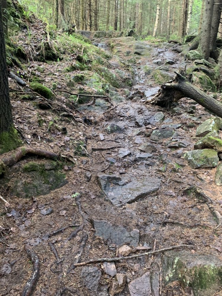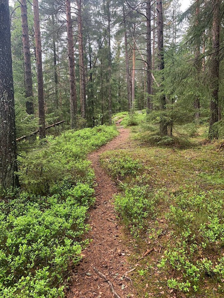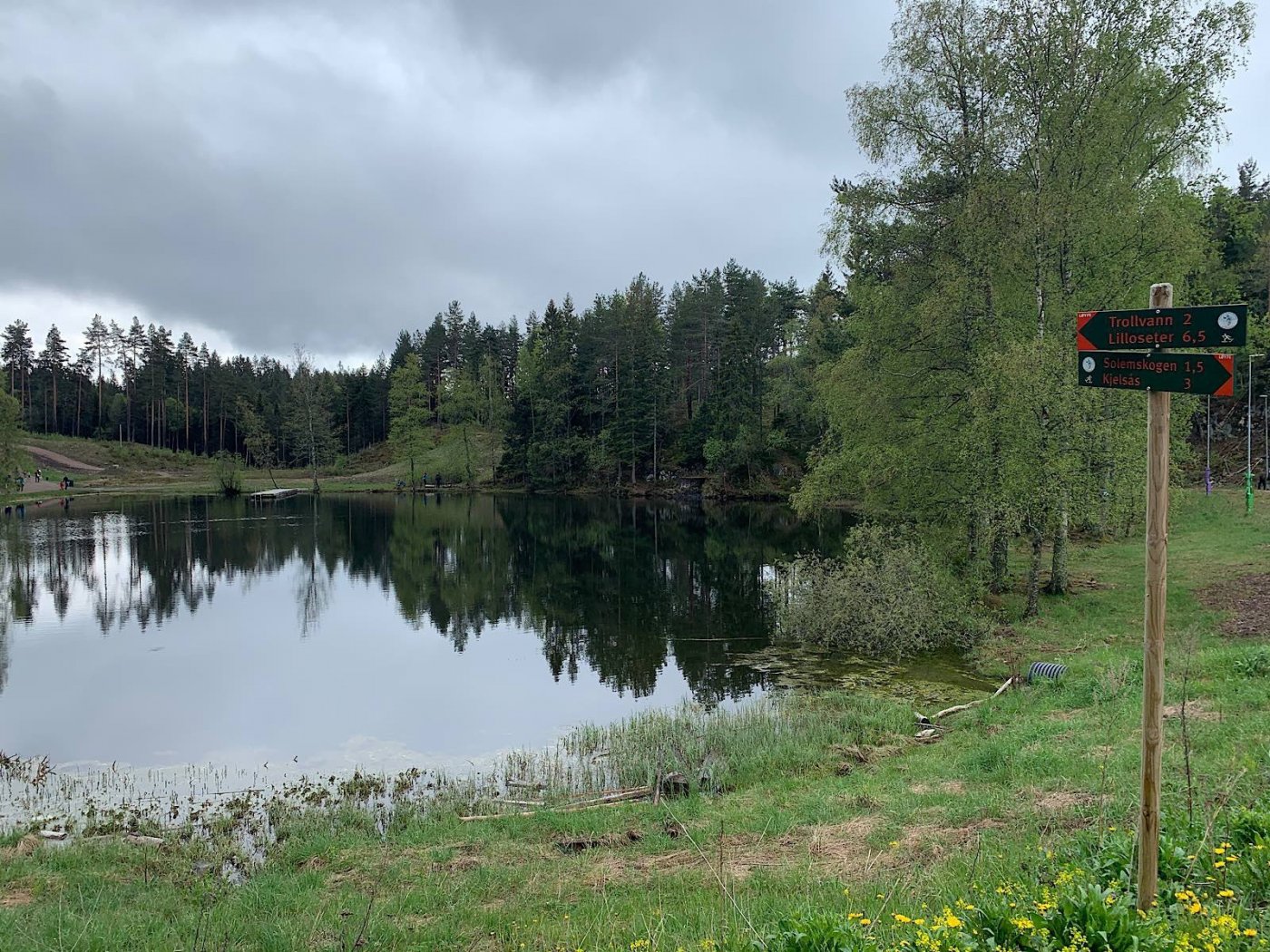 Dag 17 Voknet litt før kl 7, sulten. Kokte kaffe og laget en real til frokost. Det regnet. Tenkte jeg fikk legge meg såvidt nedpå for å tenke på dagens rutevalg siden det regnet... Gjett hvem som våknet kl 10!😂 Kroppen og beina like fine. Men hadde slurvet litt med teltoppsettet og fått lagt sokkene oppå meshen. Så en var våt, resten var rå. Tørkes på lommene på buksa mens jeg går. Lett å se footprint på teltet når det hadde regnet. Ble ikke en fin teltplass, men lovlig. Lett fin sti å gå, men glatt, trolig på grunn av all pollen. Ser ut til at jeg går klar av det værste regnet. Nabber og røtter, stavene er gode og ha, har heldigvis ikke falt enda. Bratt og glatt sti ved høyt vann. Men flott grå utsikt og betydelig kaldere enn i går. Glatte og bratte svaberg er ekle å gå på. Bratt og vondt ned også. Tar det rolig. Ikke merket sti, og ikke noe vedlikehold. Sti ved lavt vann, sto over den. Mer skifte i landskap. Helt tydelig at det ikke drives i skogen her, i Nordmarka er veiene av betydelig høyere standard. Noen med øks, har kappet slik at det gikk å sykle forbi, de fleste hadde vel tatt den lenger inn. Det går unna på slike veier. Lite utsikt til vannet, litt hugst hadde gjort seg. Damen ved Mariholtet, artig fasong, en S. Nok et skilt, eldre versjon. Flott ved dammen og du ser at vannet er langt. Mye pollen! På grensa til overskilting, lite samarbeid tydeligvis. Nordover fra dammen. Mer ganske klare skilt på mange språk. Fant et sykkelkart - den grønne streken er ruta jeg velger Litt mat må man ha😀 Da går turen til Haugerud, før det blir Asfalt til Veitvet hvor delmål 5 og pakke med mat/kart for siste del hjem ligger. Ruta gjennom marka er ikke planlagt. Må se litt an været og alle daler går nord-syd og jeg må gå øst-vest. Så enten må jeg via kikut omtrent eller mye opp og ned. Er det noen med PC og kunnskap om mulig rute, så send meg gjerne en pm. Lommekjent funker dårlig på mobil.4 poeng