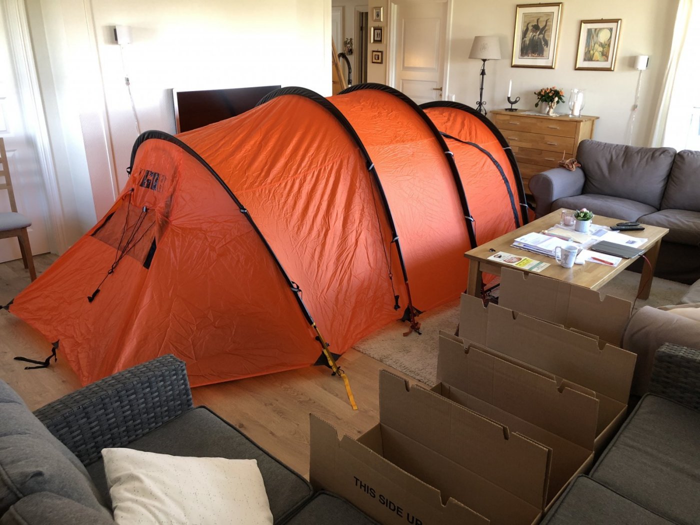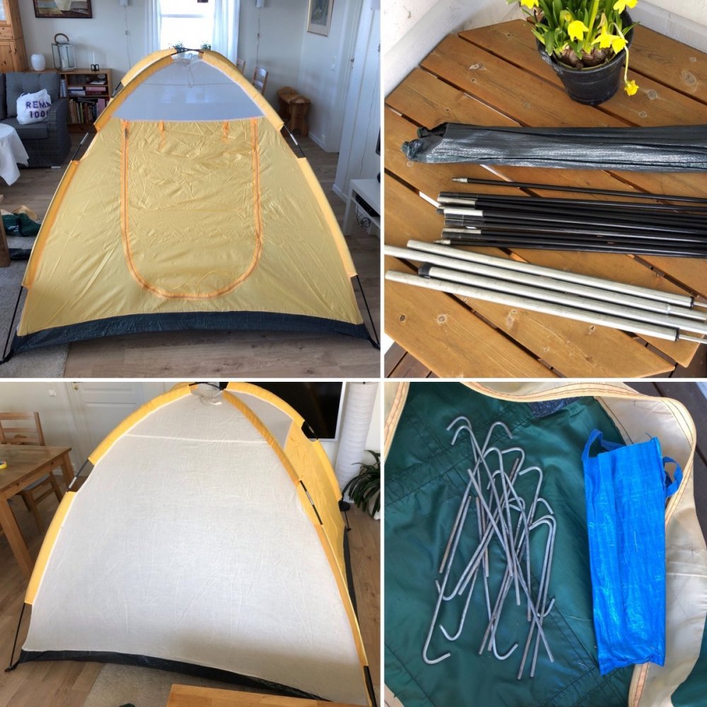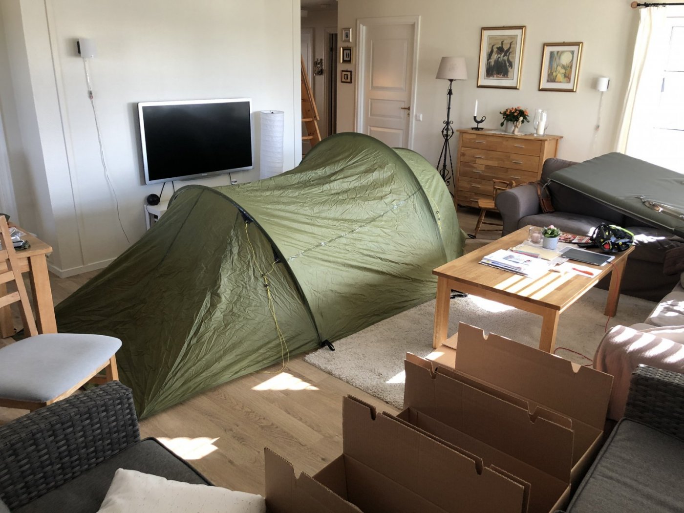 Da er teltet testa inne i stua (ble selvfølgelig utålmodig og måtte gjøre det midt i flyttinga. Litt ekstra rot kunne jo ikke skade). Ble så som så med å få festet det, men jeg fikk da et inntrykk. Har ikke noe særlig å sammenligne med, så materialer kan jeg ikke si så mye om... Men fikk krøpet inn i det og som det ble nevnt tidligere i tråden her så var det ganske lavt. Jeg med mine 165 cm kunne ikke sitte oppreist i teltet uten å være borti taket (noe kan nok skyldes slapt telt, men det var ikke bare det vil jeg tro). Teltet pakkes dermed pent sammen igjen og jeg benytter meg av 100 dagers åpent kjøp. Satser på at jeg finner noe annet som jeg liker bedre!1 poeng