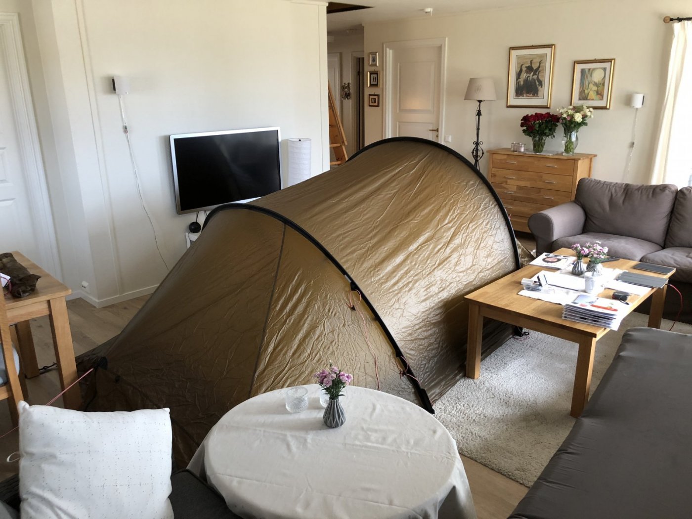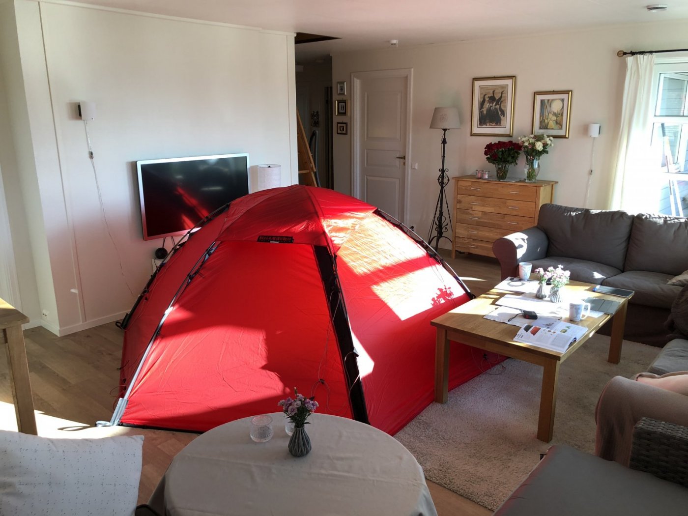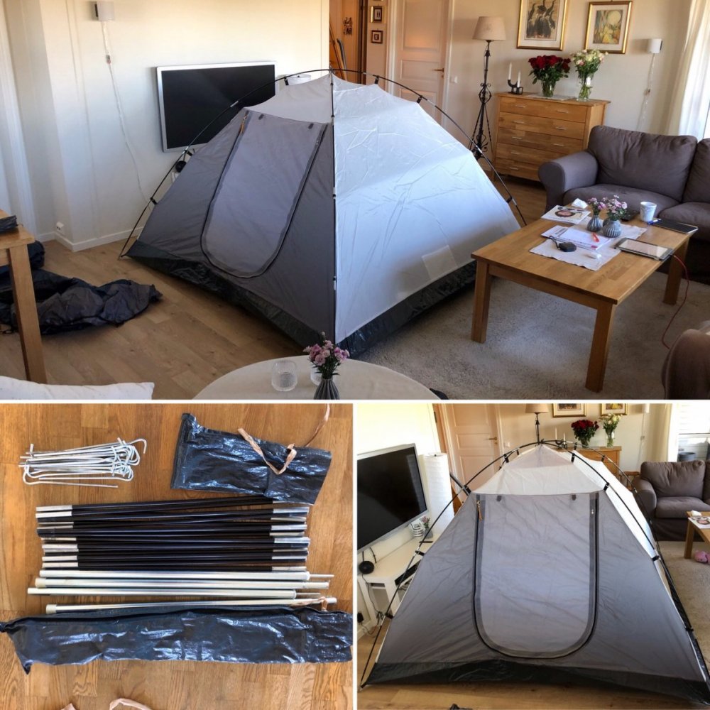 Da er teltet testa inne i stua (ble selvfølgelig utålmodig og måtte gjøre det midt i flyttinga. Litt ekstra rot kunne jo ikke skade). Ble så som så med å få festet det, men jeg fikk da et inntrykk. Har ikke noe særlig å sammenligne med, så materialer kan jeg ikke si så mye om... Men fikk krøpet inn i det og som det ble nevnt tidligere i tråden her så var det ganske lavt. Jeg med mine 165 cm kunne ikke sitte oppreist i teltet uten å være borti taket (noe kan nok skyldes slapt telt, men det var ikke bare det vil jeg tro). Teltet pakkes dermed pent sammen igjen og jeg benytter meg av 100 dagers åpent kjøp. Satser på at jeg finner noe annet som jeg liker bedre!1 poeng