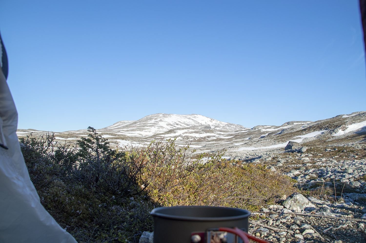 Om jeg skulle ha valgt nytt telt i dag ville jeg nok som gammel (77), litt stiv, støl og pga et kne, ganske handikappet. (15% invalid ifølge legerapport), ha valgt meg et to manns telt. Men ennå klarer jeg å opptre som slangemenneske i min lille og kjære Akto. Og siden vi er inne på telt klarer jeg ikke å la vær å vise Akto med baldkin 3 x 160. Her vises prototypen, men den jeg nå bruker nå er en modifisert Tarp fra Magasinet. Vekten øker med den bare 500 gram, men dette er gram jeg gladelig bærer på, gram jeg mer enn sparer siden jeg bare fyrer med ved i min Blikkboksovn MJK II som veier beskjedne 170 gram Og til dere som er luta lei både meg, Akto med baldakin og vedovnen får ha meg tilgitt, for i dag er det tre måneder siden jeg tok grep, la på en gelpakning på kneet, og plutselig kunne jeg gå. Det er i dag, eller rettere sagt i går 2 år siden en fatal kneoperasjon nærmest gjorde meg mer eller mindre avhengig av krykker. Men etter at jeg fikk innskytelsen om gelpakningen som jeg surrer stramt rundt kneet og så har jeg gått relativt lange turer med 18 kg på ryggen. Og nå - nå blinker Hardangervidda og Holken i det fjerne. Ikke rart jeg smiler bredt.4 poeng