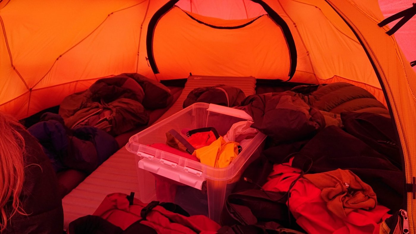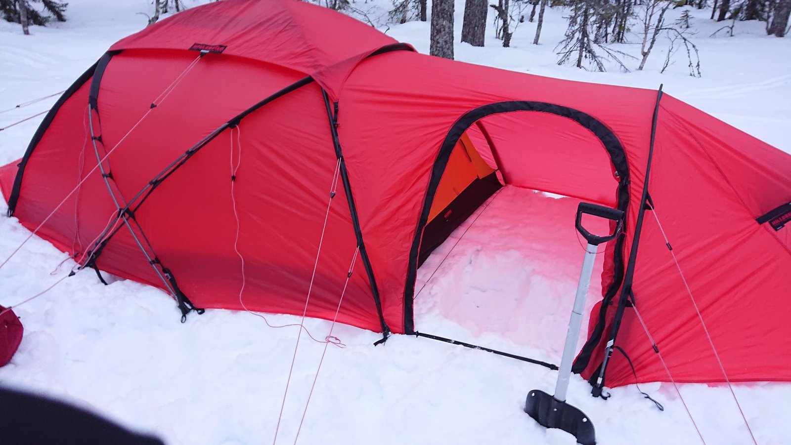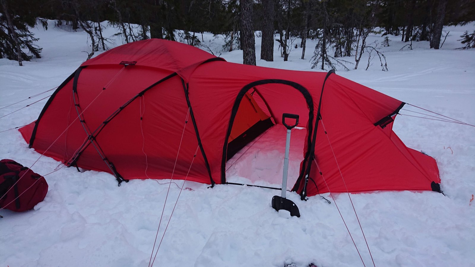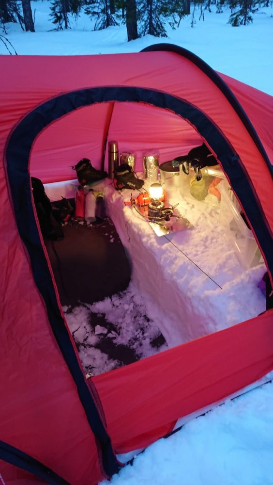 Siden det blir skrevet at rødt gjør seg på bilder, så kommer det noen her Jeg har ikke fått prøvd teltet i noe vær å snakke om, men ett av punktene som gjør at jeg liker konstruksjonen er at det tåler snøfall. Og av det jeg har lest, så er det ett av de teltene som tåler mest vær. Både vind og snø. Jeg sover godt og tungt, så setter pris at jeg ikke trenger bekymre meg mye om at innerteltet kommer ned på nesen om det skulle komme mye snø iløpet av natten. At det tåler en blåst er ikke negativt heller. Forteltet virker litt lite, men jeg tror det henger litt sammen med at hovedfeltet er såpass høyt og stort. Det har dog mindre mål enn feks forteltet på Keron 4GT. Men bevares har god plass til å sitte å kokkelere. Film og snop hører med på en lørdag. Mye lufting, siden vi hadde gjevne 20 grader inni teltet igjennom kvelden. 🔥 Tre stykk 65 cm brede underlag har god plass inni teltet. Dessverre forsvinner ikke rotet selv om man har god plass. Rart det der 🙈1 poeng