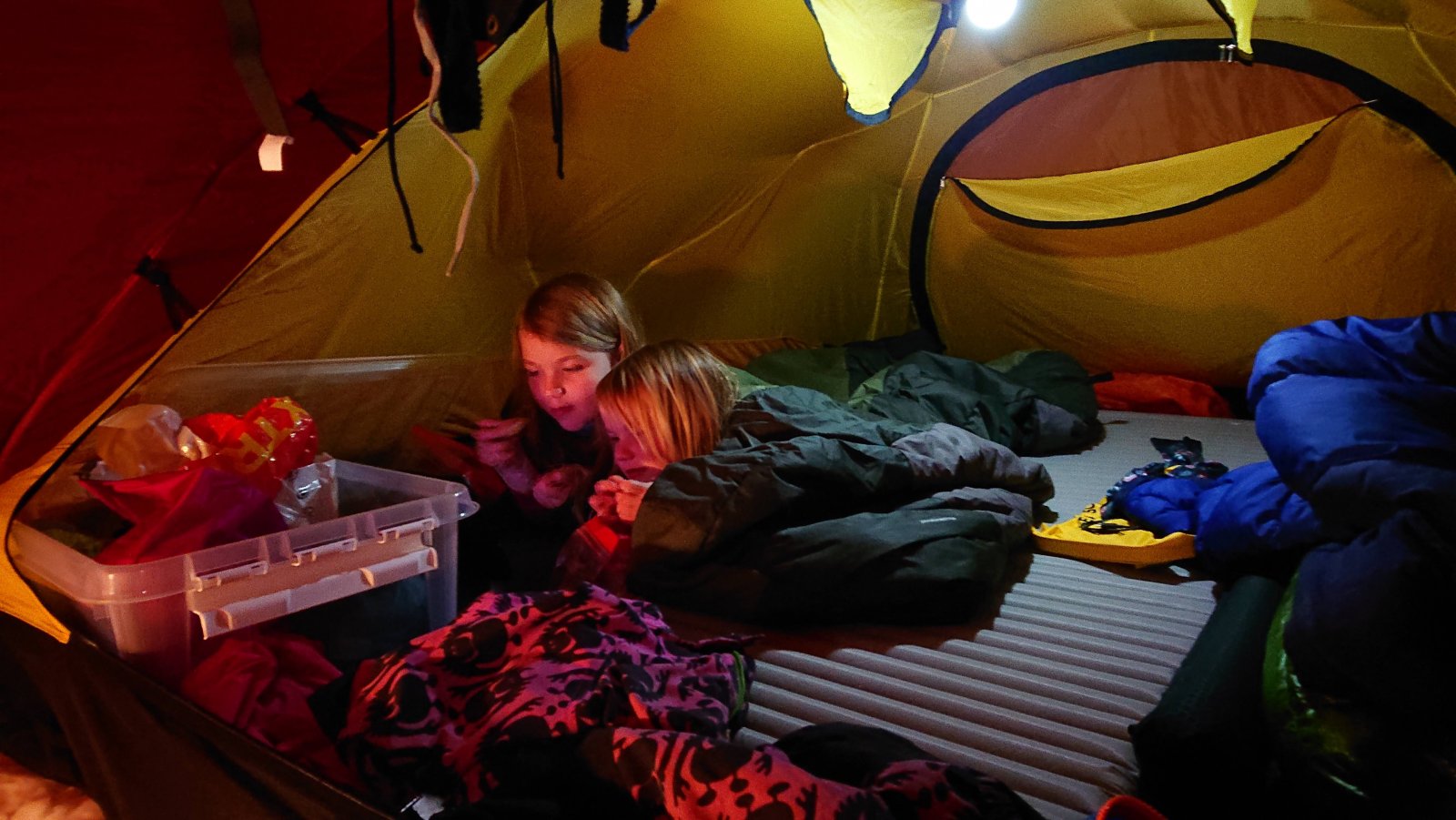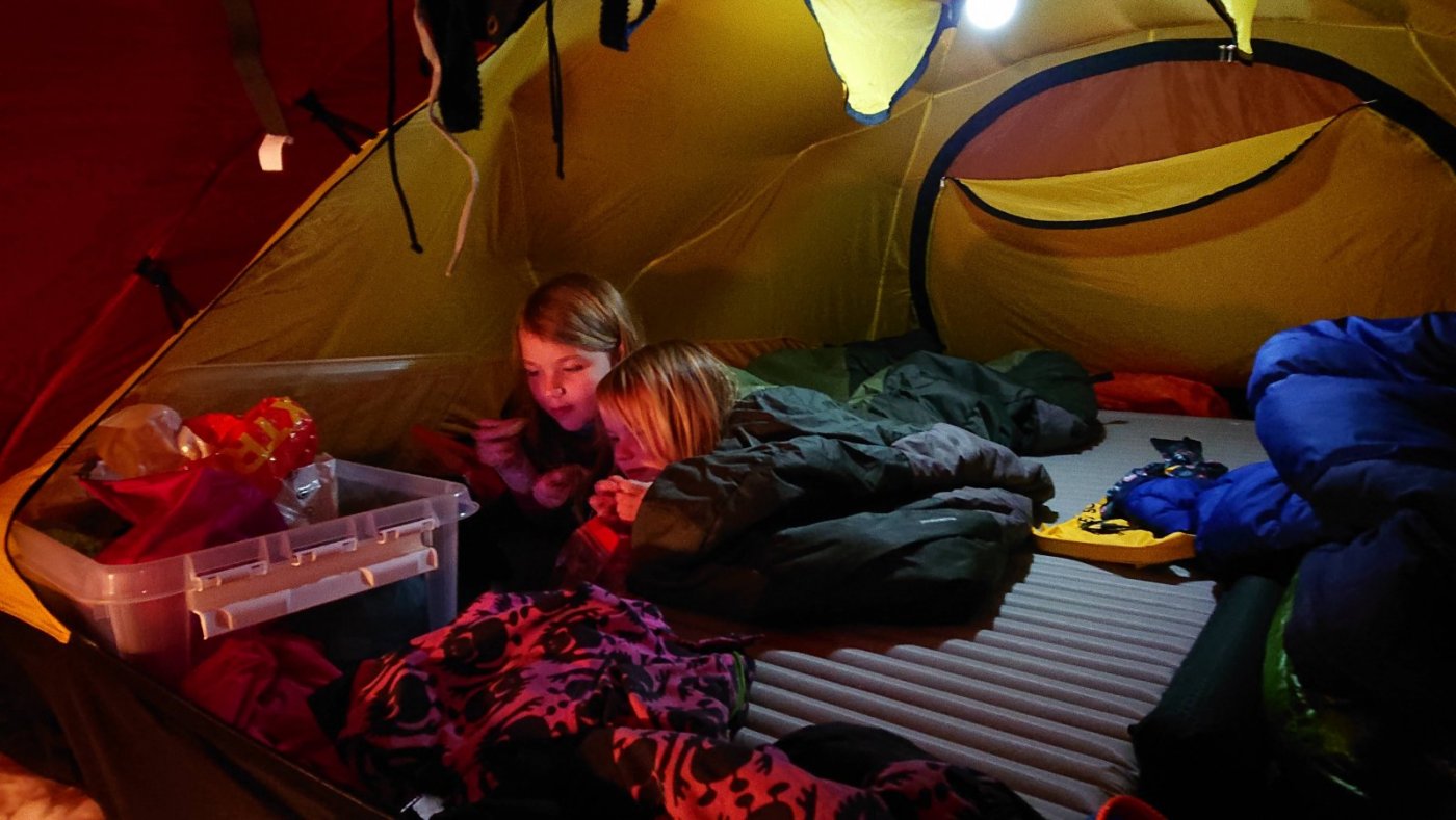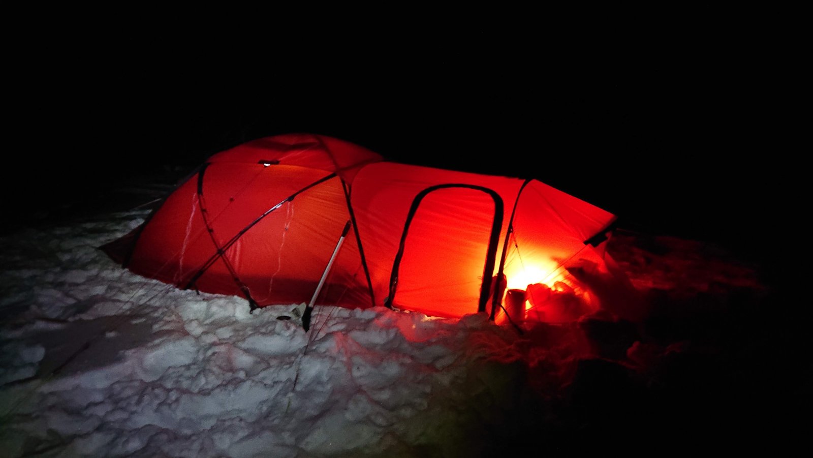 Siden det blir skrevet at rødt gjør seg på bilder, så kommer det noen her Jeg har ikke fått prøvd teltet i noe vær å snakke om, men ett av punktene som gjør at jeg liker konstruksjonen er at det tåler snøfall. Og av det jeg har lest, så er det ett av de teltene som tåler mest vær. Både vind og snø. Jeg sover godt og tungt, så setter pris at jeg ikke trenger bekymre meg mye om at innerteltet kommer ned på nesen om det skulle komme mye snø iløpet av natten. At det tåler en blåst er ikke negativt heller. Forteltet virker litt lite, men jeg tror det henger litt sammen med at hovedfeltet er såpass høyt og stort. Det har dog mindre mål enn feks forteltet på Keron 4GT. Men bevares har god plass til å sitte å kokkelere. Film og snop hører med på en lørdag. Mye lufting, siden vi hadde gjevne 20 grader inni teltet igjennom kvelden. 🔥 Tre stykk 65 cm brede underlag har god plass inni teltet. Dessverre forsvinner ikke rotet selv om man har god plass. Rart det der 🙈1 poeng