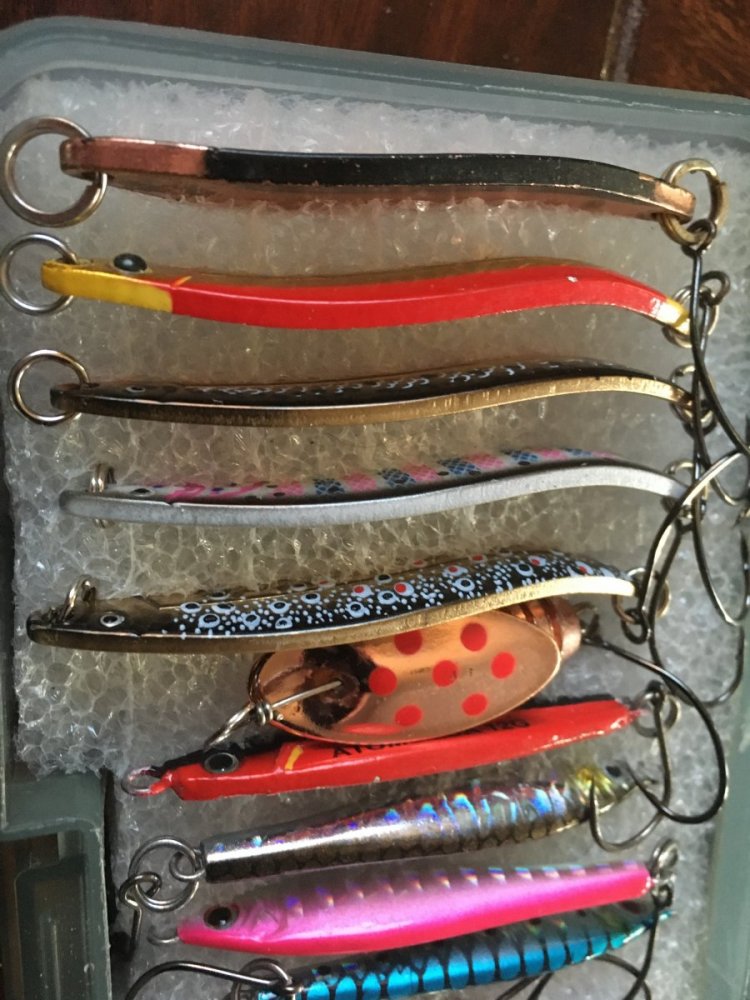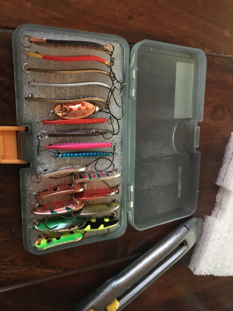Slukskrinet mitt er stappfull. Den er passe stor (eller liten) slik at den passer i lomma til fjellbuksa. Jeg liker å gå langs vannet, helst rundt der jeg fisker. Det blir fort noen kilometer. Så skramler det skikkelig i buksa (slukskrinet mener jeg). I tillegg mister slukene lakken. Irriterende. Så tok jeg litt skummateriale og tapetkniv. Nå ligger slukene pent i skrinet uten å lage rabalder. Oversiktlig er det og. Pluss at jeg måtte slanke innholdet.1 poeng