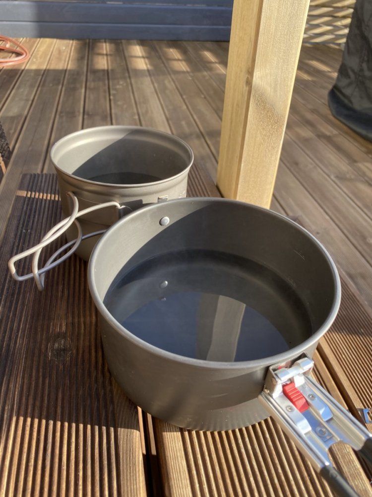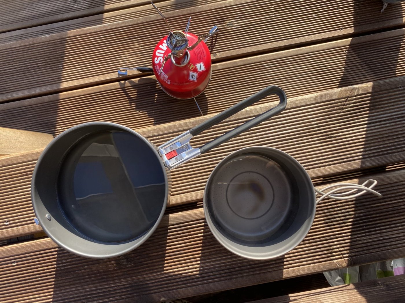 Fant ut at det passet bra med litt testing i ettermiddag - og litt konkurranse. I det ene hjørnet, MSR Quick Solo pot, eloksert alu, 1,1 l. kapasitet. Lav og fin profil. I det andre, en toaks 900ml titankopp/panne, kjøpt på eBay. 115mm bred, bare. Begge ble fylt med ,5 l vann, og satt over en pocketrocket 2 med primusgass. Full guffe. Noen som vil tippe vinneren? 😀2 poeng