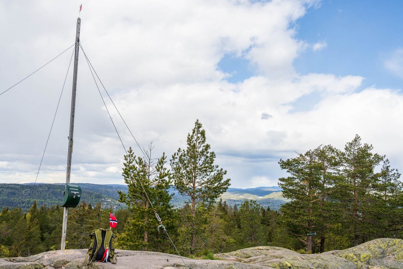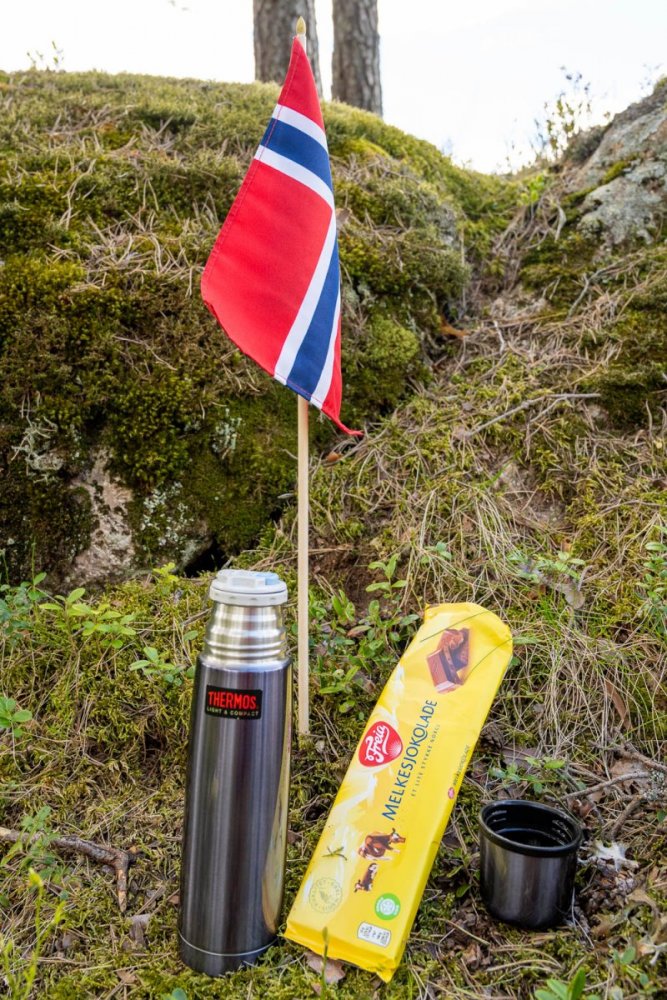 Nasjonaldagen ble markert med en tur til Nordre Kolsås (380 moh), som er den høyeste av Kolsåstoppene. Det var en god del som hadde valgt å feire dagen på samme måte, blant annet et par familier med store og små, som hadde tatt turen opp for å synge nasjonalsagen klokken 1300. Fra toppen er det blant annet flott utsikt mot Nesoddlandet og sørover i Oslofjorden mot Drøbak. Fra selve toppunktet er det utsikt mot Krokkskogen. I anledning dagen hadde jeg pyntet sekken med flagg og 17. mai sløyfe. Det var mange sekker med flagg å se ute i dag. Hva passer ikke bedre enn et lite stykke Norge fra Freia i anledning dagen, med litt te til. Selv om det var en del skyer og vind, så lyste løvetannen godt opp.1 poeng