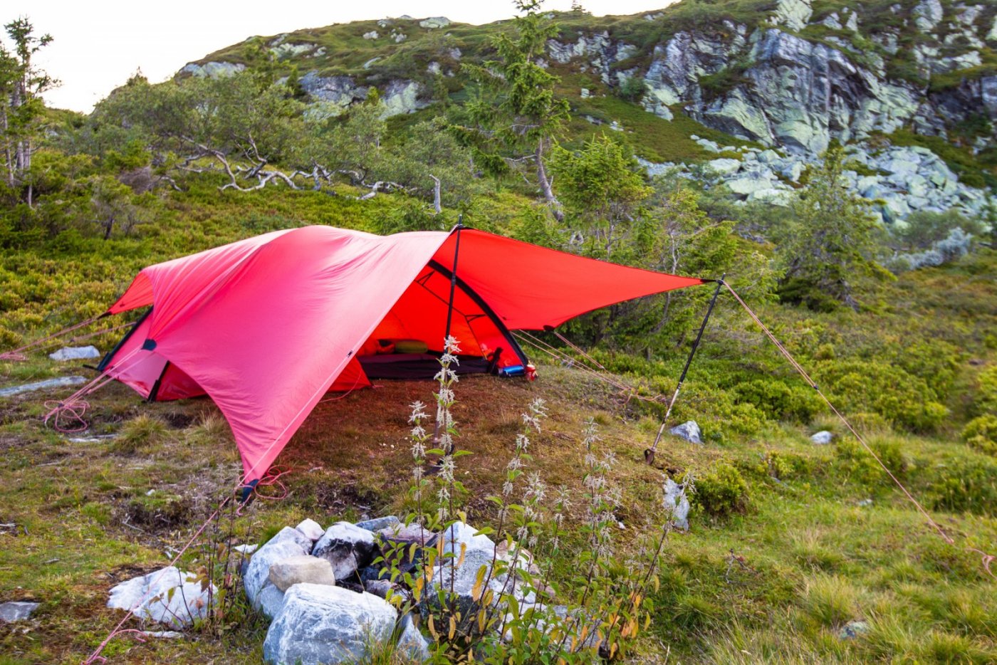 På siste turen i fjor i Vikbekkfjellet viste sola ingen nåde. Det fantes ikke skygge heller. Noe må altså gjøres før neste tur. Jeg fikk en tarp og gåstaver i bursdagsgave. Tarpen vil jeg ikke drasse med på solotur, for tung. Men stavene kan vel brukes til flere formål? Innerteltet til Aktoen min er fort tatt ut, bare noen klips. Så prøvde jeg meg på ett tarplignende oppsett. Selvfølgelig får jeg ikke hele duken stramm, men går det vind trenger jeg heller ikke skygge. Tror dette kan fungere:1 poeng
