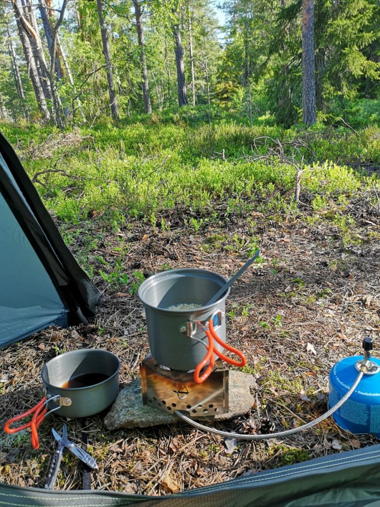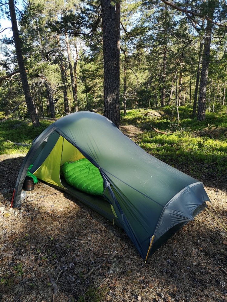 Jeg har med ett halvt tynt skumunderlag. Det dekker fra rompen og opp til nakken, så det vil fungere i ett nødsfall. Og utenpå sekken tar det liten plass, samt veldig greit å ha i inngangen i teltet. Legg igjen alt du ikke må ha, og «klipp alt i to» Med å «klippe alt i to» mener jeg at en tannkost med halvt skaft veier halvparten, og tar halvparten av plassen til en fullsize tannkost. Det samme gjelder en evt. stekespade etc. Ett kjøkkenhåndkle er mer enn nok til å tørke kroppen og teltgulvet om du har med denslags. Og om jeg har med en sovepose jeg vet er mer enn varm nok til å ligge i uten klær, trenger jeg faktisk ikke tørt skift engang. Jeg synes den vanlige 90 literen eller deromkring er helt passe1 poeng