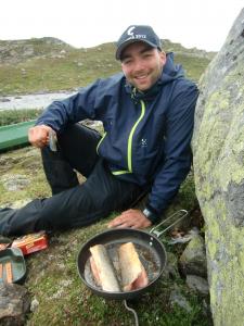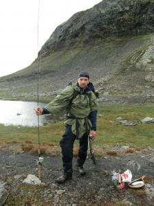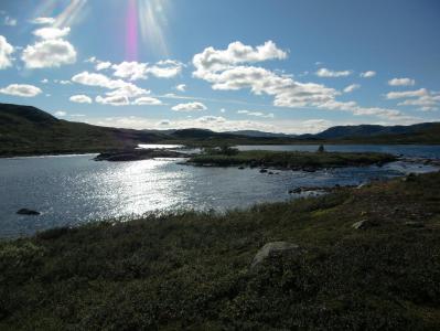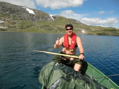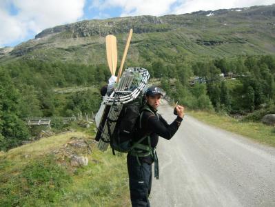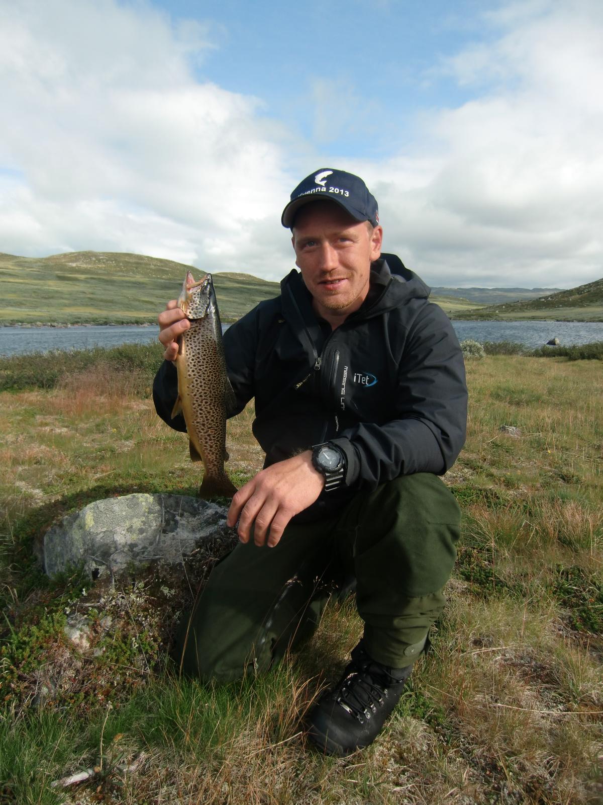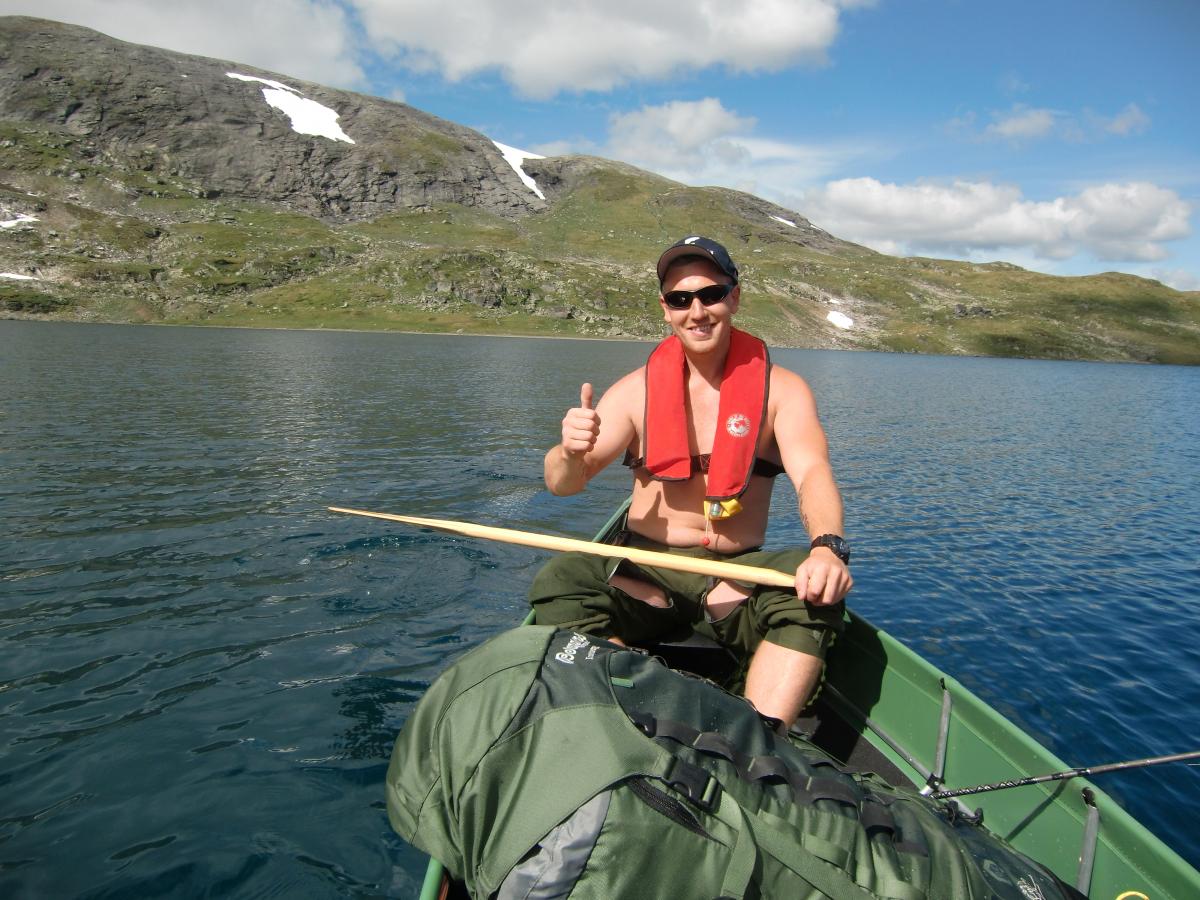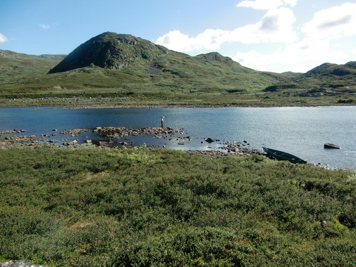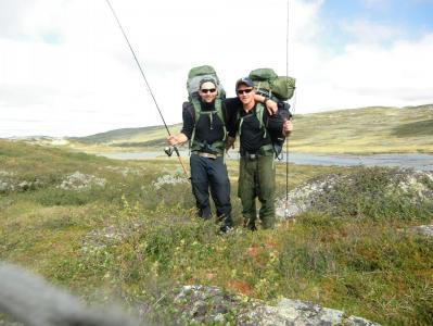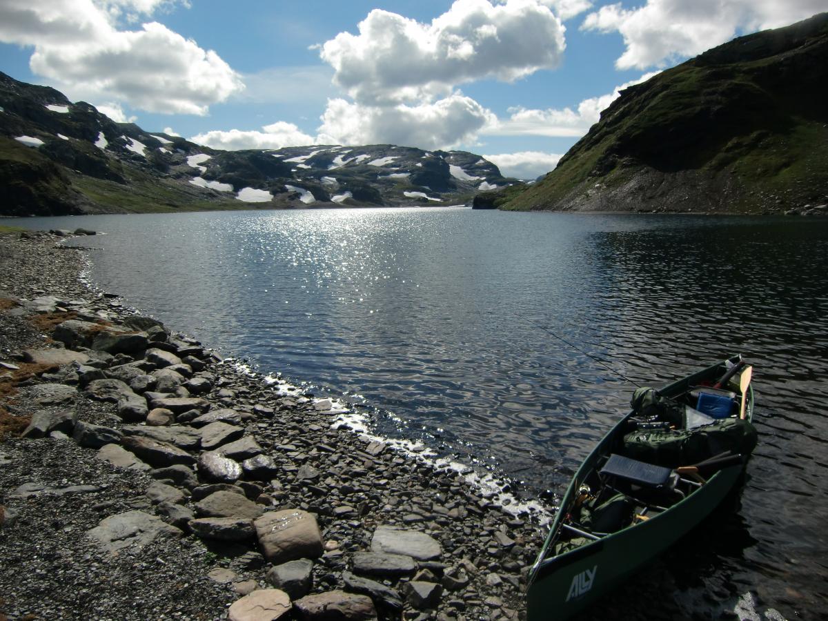 Turen startet med en biltur til Møsvatn hvor vi forlot bilen og ventet på bussen som skulle frakte oss til Røldal via Haukeli. Herifra kjørte Røldal Taxi oss inn Valldalen og til startpunktet for turen. Vi var startklare og ferdig pakket rundt 17:00. Vi har ikke spart på noe siden vi skal padle mesteparten av turen og dette gjorde at startvekten på sekkene ble anslått til rundt 45+ kg. Vekten fikk vi smertelig erfare etter 20 meter i første motbakke da melkesyra spruta ut i iskald lår muskulatur og undertegnede lurte på om det var mulig å bære dette opp i en vending, men Ole var overbevist og labba avgårde i front. Motvillig fulgte jeg etter. Etter mange pustepauser, en matpause, hvilepauser, drikkepauser og stopp måtte vi konstatere at det ble mørkt og at vi enda hadde langt igjen. Totaldistansen var ca. 1 mil og 600 høydemeter og vi hadde brukt 6 timer. Det var BLYTUNGT. Men tanken på å våkne neste dag å kunne sette seg rett i kanoen ble for fristende og vi gampet videre. Det føltes ut som vi aldri skulle komme frem, bare en ås til, bare en høyde til, bare en ryggkam til. Det var umulig å orientere seg i mørket for utenom stien som vi så i lyset fra hodelykta. Til slutt så Ole en liten flate med mulighet for å legge soveposen og brøt ut: «HER skal vi sove, NÅ!» Klokka var når 0100 og vi hadde gått i 7 timer, det var bare å kapitulere…. Neste morgen oppdaget vi at vi hadde 400-500 meter med slak nedoverbakke å gå før vi var ved målsetningen for gårsdagen. Det var en enorm lettelse og vi var begge enige om at det var den tyngste fysiske anstrengelsen vi noen gang hadde gjort. Sola skinte og egg og bacon ble frest i panna på gassbrenneren og nå kunne turen for alvor starte. Vi prøvde fiskelykken i Holmavatn så best det var, samt de små vanna før du kommer til Kvennsjøen, men ikke så mye som et livstegn. Vi hadde vel ikke helt trua da tidligere rapporter tilsa at det var lite eller ingen fisk i disse vannene. Første dag oppe på vidda ble en fantastisk padletur ned til neste planlagte leirplass som lå mellom Kvennsjøen og Litlosvatn, også kalt Fiskos. Fiskekonkurranse er en naturlig del av våre turer og den hadde vart siden første padletak. Veddmålet var at den som fikk først fisk over 0,5 kg slapp å betale burgeren på vei hjem. Rett før utoset fra Litlosvatnet hogg det til i stanga til Ole og turens første fiske var et faktum, men de 0,4 kiloene som den ble veid inn til holdt ikke til å vinne konkuranssen. I all entusiasmen og gleden over å endelig være på tur etter et halvt års nedtelling av dager gjorde at vi glemte å ta bilder de 2-3 første dagene. Dagen etterpå bestemte vi oss for å gå til Litlos turisthytte å kjøpe en øl også ta en fiskerunde på nordsia av hytta. Vi fikk mye fisk, men alt var under den berømte halvkiloen. Jeg fikk vel bortimot 10 stykker denne dagen og er man ute etter storfisk kan jeg si at Skadvatn, Perapytten og Ambjørgsvatnet ikke er stedet man vil dra. Men har du med unger og målet er å få fisk vil det være perfekt med kobber og rødt her. Vi fikk også våre eneste 3 timer med regn denne dagen. Etter å ha pakket sammen leiren ved Fiskos tok vi årene fatt nedover Kvennsjøen. Vi var heldig med vær og vind så det gikk fort og enkelt. Nesten for fort for markdraget og rapala’en som hang på slep bak oss i vannskorpa. Det var ikke så mye som et napp, nordavinden og sola fikk skylda for det, for det skulle i hvert fall ikke stå på utstyret. Vi hadde jo rana både Gmax, XXL og Ebay i forkant av turen. Mellom Kvennsjøen og Krokavatn er det mange ruter å velge mellom, men vi fant vår vei gjennom mylderet av bekker. Akkurat denne passasjen ble et av padlehøydepunktene på turen. Sola skinte og naturen viste seg fra sin beste side der vi gled ned gjennom de brede og grunne bekkene mens vi bare styrte doningen. Det gikk som en lek. Siste biten ned mot Øvre Krokavatn måtte vi bære, men aller først var det lunsj. Denne besto av liten delikatesse med knekkebrød, selvfanget fjellørret, rømme og en skive bacon på toppen. Ikke engang Hellstrøm kunne fått det til å smake bedre. Siden vi var ivrige fiskere hadde vaderene blitt med og disse ble flittig brukt på turen. Ikke til fluefiske, men rett og slett til å vade kanoen ned de mindre strykene istedenfor å bære den. Vi følte dette var lettere i de litt mindre bærepassasjene. Fordelen var at man slapp å tømme kanoen hver gang. Dagen endte opp nede ved Hansbu hvor det er et naust man kan overnatte i mot en liten betalingsordning beskrevet i en bok. Men det var så bedritent og skittent at vi valgte å ligge ute lavvoen i stede. Men etter litt rekognisering rundt naustet fant vi vedrester nok til et bål, og det ble snart god stemning med både øl og vin foran bålet. Dette skulle bli den lengste bæreetappen på til sammen ca 3.5 km. Klok av skade valgte vi å gå 2 turer, først sekkene også kanoen. Polarbrød med diverse pålegg ble fortært til lunsj og padlingen kunne igjen starte over Sandvatn. Kanskje tidenes mest langgrunne vann, så fiskeredskapen kunne bare bli værende i boksen, men på enden av vannet så Ole sitt snitt til å fiske og kastet ut supersluken over alle. Og plutselig hogger det til i stanga og det er ikke tvil, fiskekonkurransen er tapt. Fisken veies inn til 0,7 kg og en overlegen vinner så langt. Selvtilliten min har nå fått seg en real knekk og vi fleiper litt på kanten om nord-norsk haill og fiskelykke. Jeg kjenner at det sårer litt, men i morgen er det min tur det kan du banne på. I enden av vannet finner man Breidvadhølen og her ligger en fantastisk fin leirplass og ikke nok med det, men det så perfekt ut for å teste fluestanga i kulpene. Fangst ble det, men størrelsen trenger vi ikke snakke om. Det ble nok en bæreetappe først på dagen og denne gangen ned til Gunleiksbuvatnet. Vi valgte å gå to turer denne dagen også. Været var igjen i det fantastiske hjørnet så t-sk