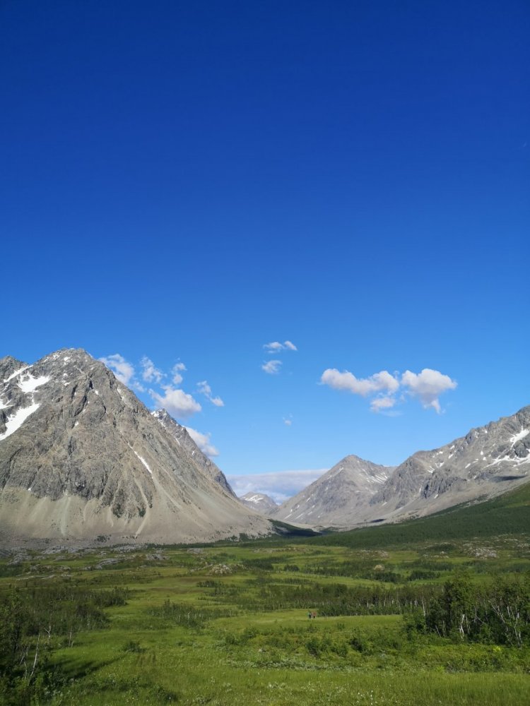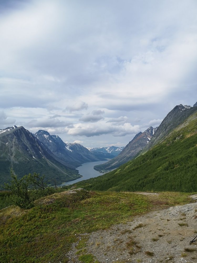 Mot slutten av juli var det grått og trist i sør. I beste fall skiftende. Nordnorge derimot badet i sol og inspirerte meg til å ta med familien på en spontantur til Lyngsalpene. Dette er et område kjent for toppturer på ski, men jeg har lenge drømt om en fottur her. Planen var å gå tvers over Lyngen halvøya, med start på Svensby ferjekai. Gjennom Stortinddalen, ned Russedalen og ta sørover ved Fastdalshytta. Forbi Rottenvikvannet og ned til Lyngseidet. 31 km målt på ut.no sin ruteplanlegger. Vi kommer til Tromsø med fly på søndag 26.07 og må derfor en svipptur med drosje ut på en bensinstasjon på Kvaløysletta for å kjøpe gassboks. Det er gode buss og ferjeforbindelser fra Tromsø til Lyngen, så etter en rask middag sitter vi på bussen og står på Svensby ferjekai 1 times tid senere. De første 2 kilometerne går på grusvei, og allerede her stifter vi bekjentskap med svartfluer og klegg. Fra en annen verden. Nordnorske insekter må være pumpet opp på testosteron eller speed, for dette ligner ikke noe jeg har opplevd før. Heldigvis har vi tatt med myggnetting til å ta over hodet. På kartet er hele turen tegnet inn som umerket sti, men over myrene og inn mot Stortinddalen er det ikke mulig å se noe tydelig tråkk. Det beste er bare å sikte seg inn mot dalen og nyte det formidable synet: Over myrene må Trollvasselva vades. Den flyter rolig og dovent nedover og er uproblematisk å krysse. Vi har i tillegg til myggnetting tatt med crocs, som skal vise seg å være de 2 tingene vi setter mest pris på hele denne turen. Vi bestemmer oss for å legge myr og bjørkeskog bak oss før vi slår leir. Håpet er å slippe unna fluene. Bjørkeskogen står delvis tett, så vi er glade når vi passerer tregrensa, som er på 150 meter i denne dalen. Endelig finner vi en flat høyde der det blåser nok. Insektene gir opp og teltene pakkes ut. Jeg har en følelse av å være på 2000 meter med spisse tinder på alle kanter. Neste dag blåser det enda friskere. Vi kan gå uten å bli plaget av insekter. Det er en gnistrende flott dag med skyfri himmel, og deilig å gå opp den mektige breelva som ligger som et turkist bånd på venstre hånd. Rundt lunsj tid kommer vi til en brølende og stri sideelv som renner ned i fra Storvatnet. For å komme videre må vi krysse den. Det er kun mulig der den renner ut i en stille lagune av breelva. For å forsikre meg om at dette er trygt tar jeg et prøve vad. Elva flater godt ut nederst, så den er ikke dyp. Men det blir en 10-15 meter å krysse. Tilbake igjen. Og så over med hele gjengen. Jeg tror ikke jeg har mye følelse i beina etter dette.....Her blir det en velfortjent lunsj. Innerst i Stortinddalen er det løst vardet og vi følger disse oppover en bratt stigning på 200 høydemeter til vannskillet. Vi ser litt av en brearm, og smeltevannet som fosser nedover. Kondisjon og lår får kjørt seg, og jeg drikker sikkert en liter på vei opp. Solen steker og landskapet vibrerer. På toppen venter en storslått belønning: vi snur oss rundt og tar farvell med Stortinddalen. Nedover Russedalen er stien tegnet inn på sørsiden av elven, men tydelig varding leder oss over på nordsiden. Her må vi ta et viktig valg. Jeg antar at elva vokser seg så stor nedover at det ikke er mulig å krysse den igjen. Skal vi følge kart eller varder? Om vi går ned på sørsiden må vi også krysse en ny stor sideelv som renner ned Fastdalen. Vi bestemmer oss for vardene og heller krysse elva på bro nede ved Fastdalshytta. Men det får bli neste dag. Alle er klare for å slå leir, selv om vi på kartet ser at vi ikke har gått langt i dag. Og sannelig finner vi ikke en liten flekk med vegitasjon i all steinen. I alle fall for det ene teltet. Vi er veldig spent på om valget vårt har vært fornuftig, der vi kruser ned Russedalen. Spesielt siden vi etter en stund ser varder på den andre siden av elva også. Når vi kommer til punktet der elva fra Fastdalen møter elva fra Russedalen er jeg glad for at vi slipper å vade den. Sannsynligvis måtte vi fulgt elva langt oppover for å finne en trygg plass å krysse. Straffen blir det utfordrende terrenget resten av veien til broen. Altfor tett vegitasjon ved bredden tvinger oss opp i grov ur. Det er varmt, det er ingen vind lenger og fluene og kleggen er på krigsstien. I tillegg viser det seg at broen ser en smule tvilsom ut. Jeg går over uten sekk først. Heldigvis ikke noe bevegelse eller knaking. En og en går over med sekk, og endelig er vi ved Fastdalshytta. Jeg skulle selvsagt tatt bilde av denne broen, men man glemmer jo å ta bilder i kampens hete. Alle er varme, slitne og gretne, og det føles som en gave fra himmelen at nøkkelen til hytta henger over døra og betalingsordning finnes. Nå kan vi ha lunsj og en real pause. Fri fra de satans fluer og klegg. Her blir det 2 timers pause med risotto, kaffe og tørking av svette klær. Det blir som å starte dagen på nytt, der en glad og fornøyd gjeng forlater hytta. Målet er å nå Rottenvikvannet. Det er endelig en tydelig sti fra hytta og opp på fjellet. Som selvsagt forsvinner etter 1 kilometer. Heldigvis er terrenget mer lettgått en de 2 første dagene. Den grove ura jeg forbannet noen timer tidligere ser plutselig vakker ut når vi kommer opp i høyden og kan se ned på den. Og fjordutsikt får vi også: Til og med konfirmanten i huset måtte ut med et "wow" her. Etter at høydemetrene er unnagjort går det raskt fremover med sauer og snøfonner oppi lia. Et koselig og mer vennelig fjellterreng. Men crocs må selvsagt frem en siste gang der mange bekker små gjør en stor å: Endelig kommer Rottenvikvannet til syne. Og heldigvis finnes en kvalitetsbro et stykke nedenfor utløpet. På et høydedrag over vannet er det også nok vind og en bekk med smeltevann. En perfekt leirplass. Den siste dagen har vi bare noen få kilometer foran oss, og det eneste spenningsmomentet er om vi treffer stien ned lia, som er merket og mye brukt som nærtu
