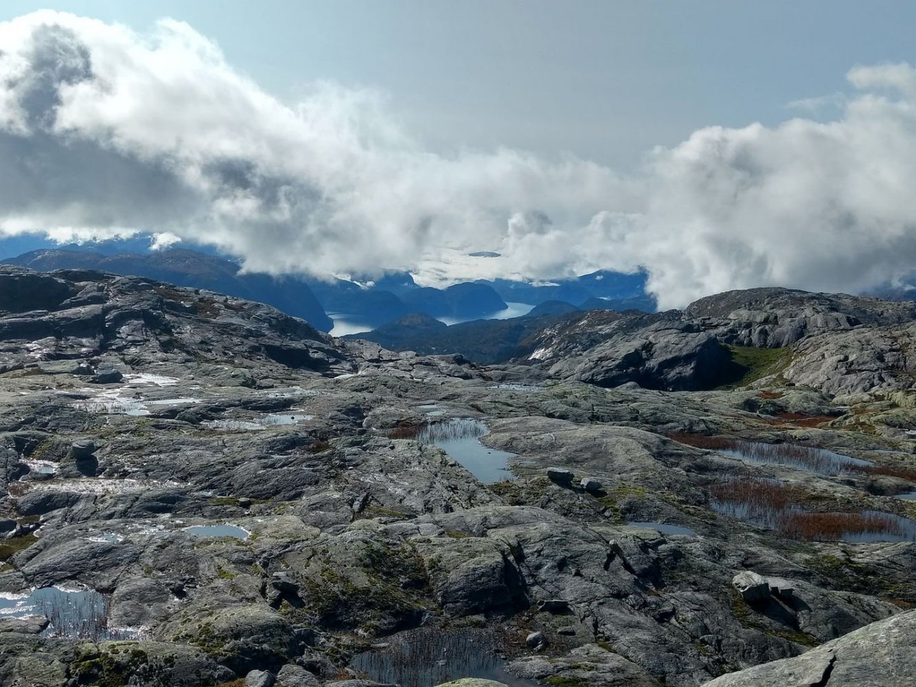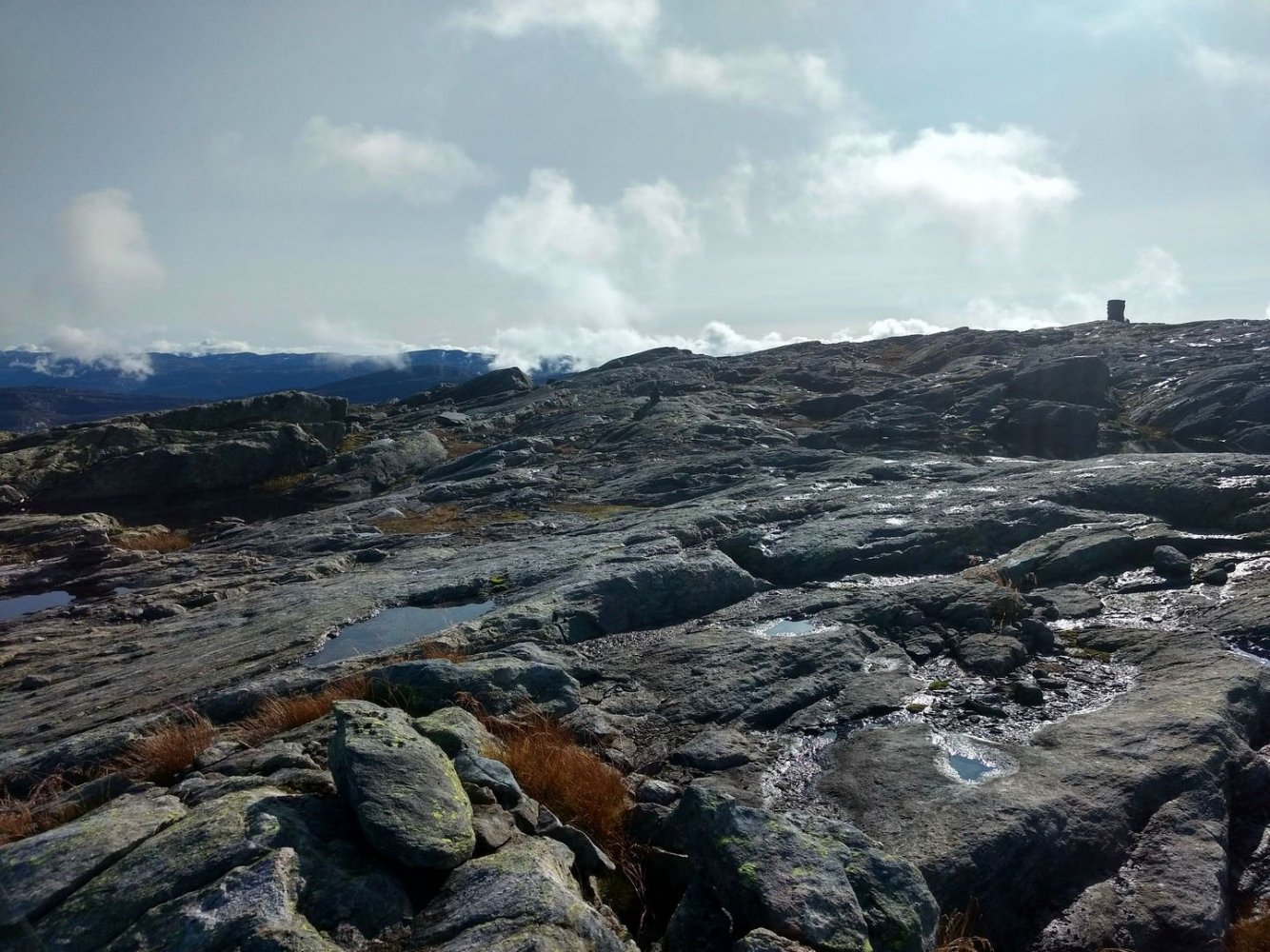 Etterhvert kom toppen i sikte, og jeg var oppe på ca 3:45 etter start, med noen småpauser innlagt. På toppen skippet jeg langbukse og gummistøvler til fordel for shorts og lettstøvler - etter en lang periode med barfotlufting Spiste og drakk ned vekta på sekken, så til syvende og sist var den vel like tung med bukser og gummistøvler i...