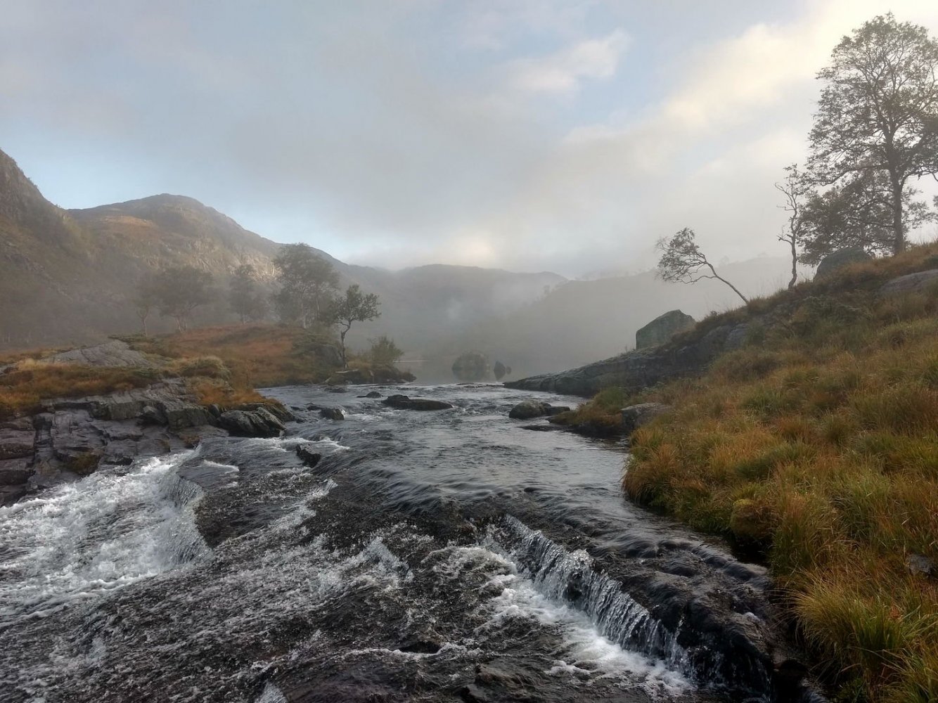 Jeg hadde valgt gummistøvler i utgangspunktet (med "vanlige" lette støvler i sekken), siden det hadde regnet hele gårsdagen. Det var ikke dumt, endte med å gå helt opp med dem Bukse ble våt til langt oppå lårene av vått høyt gress, måtte flytte mobilen oppover til håndlommene, Trolsk stemning med morgentåke skled sakte over i en sensommerdag mens jeg gikk oppover.