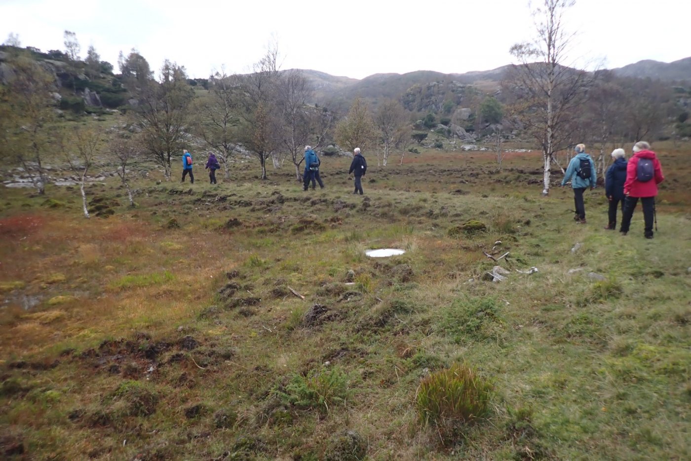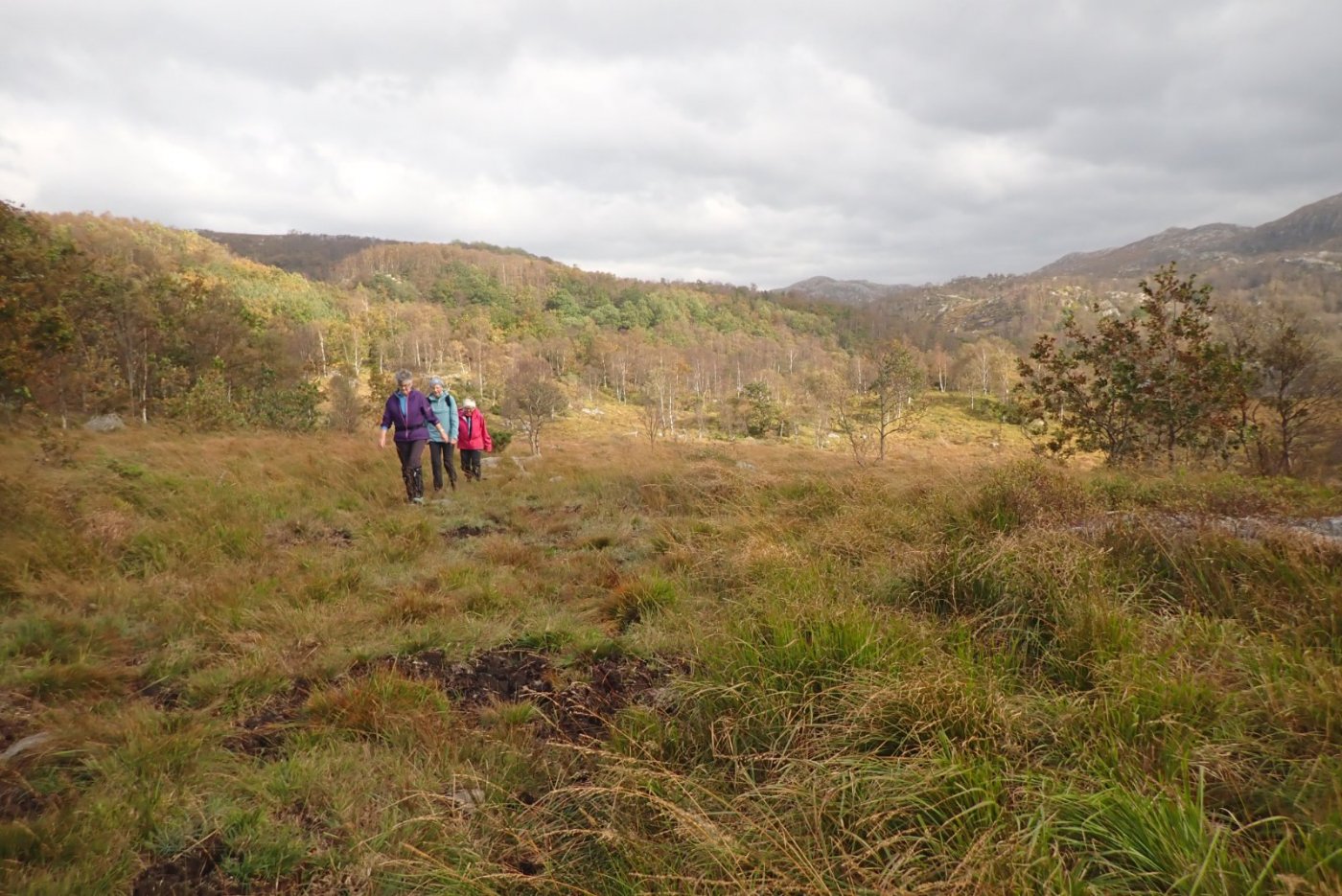 Det blir nok en uke uten besøk på Blåfjellenden. Denne gangen ble turen erstattet av en flott tur til Bjødnali, med en ekstra runde rundt Engjavannet før vi tok fatt på det siste strekket mot Sjelset og videre til Sælandsskogen. «Vi» i denne forbindelse var en gjeng som jeg ar gått tur med en del ganger. Ikke så ofte hjemme, men mange turer på Grand Canaria Min svoger Sigbjørn hadde besøk fra Tysvær. Edvin og Anne Margrete er faste medlemmer av turgjengen på Grand Canaria, og siden det var snakk om tur, ble det til at Kjell og Ingrid også meldte seg. Vi ble 9 stykker som stillet til start i Sælandsskogen. Værmeldingen var grunn til at vi valgte nettopp denne turen. Det var meldt om sterk vind, og på denne turen er det mye skog, - som tar av for vind. Selv om det gikk kjapt å bestemme at vi skulle møte opp i Sælandsskogen, var det ikke like klart hvor resten av turen skulle gå. Det er mulig å gå opp Urdådalen eller over Blåfjellet for å komme opp til Bjødnali. Sigbjørn og Anne Lise har i tillegg funnet en sti mot toppen av Blåfjell som ikke er merket. Siden det var en del i følget som aldri hadde gått i området tidligere ble det bestemt at vi skulle gå opp Urdådalen. Det er nok den flotteste måten å komme oppover mot Bjødnali. Med ni stykker i følge, blir det litt mer behagelig tempo opp bakkene enn om jeg går alene. I vått vær går det likevel ikke fort å tråkke på, over eller i mellom alle steinene i stien oppover. Høsten er kommet, og det var flotte farger opp over dalen. For å få beundret fargene måtte vi stoppe opp. Alle steinene i stien gjør det nødvendig å følge nok så nøye med hvor beina plasseres. Det er lett å få overtråkk. Vi stoppet noen ganger bare for å sjekke «høsten». Selvsagt ble det en lengre stopp oppe ved garden. Denne gangen var det med både kaffe og mat. Etter en god pause – med kjekk drøs og utveksling av minner fra turene i «Syden», fortsatte vi videre – rundt Engjavannet og mot Skogen. Vanligvis går turen direkte mot Sjelset fra Bjødnali. Det er mulig, og helt greit å gå rundt Engjavannet, og på den måten utvide turen mer et par muligens tre kilometer. En helt grei forlengelse, om du ikke roter deg bort i Engjamyrene, noe jeg var med på første gang vi gikk her. Gjengen fikk en fin tur rundt vannet. Sola kom fram, det ble varmt, nesten sommer, og med høstfarger på marka og på trærne, ble det en skikkelig flott ekstrarunde. Det blåste i skaret over mot Sjelset, og det var dis ute ved kysten som gjorde det vanskelig å få sett utsikten. Vi fortsatte rundt mot Sælandsskogen. Den vanlige runden, er ikke mer enn 8 kilometer, og går greit på to timer. Inklusive ekstrarunden blir turen på omtrent 11 kilometer, og vi brukte nesten fire timer. Da med en god pause og mange stopp. Nå er ikke terrenget og været som på Kanariøyene, men gjengen, humøret og turgleden den samme. Vi fikk en skikkelig flott tur sammen. Det er kjekt å være på tur med denne gjengen.2 poeng
