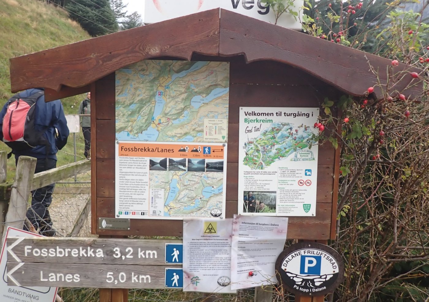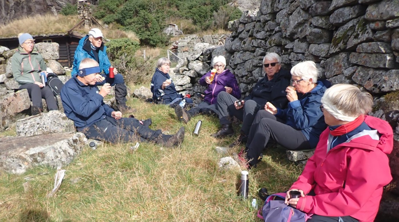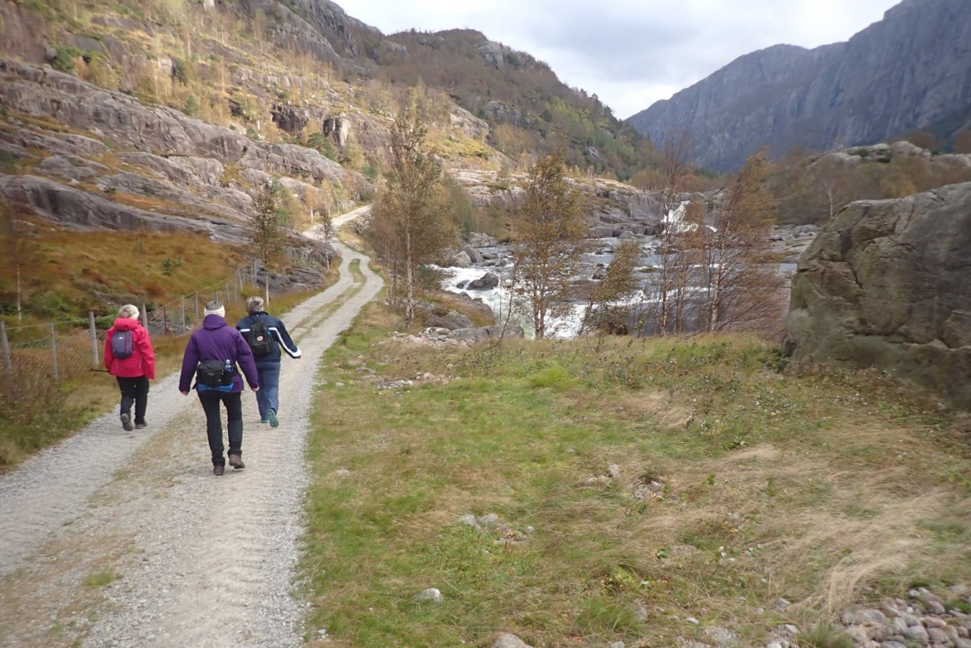 Alt på fredagens tur ble det diskutert hvor vi skulle ta ut på lørdag. For egen del så var jeg ikke helt sikker på om det var så lurt å ta på tur med værvarsel om vind på over 20 m/sek. Med mange på tur er det lite som kan gå galt, og Bestyrerinnen var oppsatt på å være med. Jeg bestemte meg for å slå følge. Sigbjørn og Anne Lise har vært en tur til Lanes inn av Espeland på riksvei 503 (fra Vikeså). En times kjøring fra oss, men på god vei – for det meste. Sigbjørn mente bestemt at turen innover dalen til Lanes var verdt en kjøretur på en time. Natur og stedet Lanes var verdt å få med seg. Vi ble enige om å starte hjemmefra klokka 10, med en oppsamling på Vikeså, for så å kjøre sammen innover mot Espeland. Rett over Storånå i Espedal, går det en vei innover (til høyre når du kommer fra Vikeså og 200 meter innover). Veien går inn til et opplysningsskilt og der er det en liten parkeringsplass. Fra parkeringsplassen er det bare å følge veien innover forbi Roaldsvannet og inn til Fossebrekka. Derfra er videre rett fram til der traktorveien slutter, så overtar en merket sti ned mot Maudalsvannet og rundt til Lanes. Samme vei tilbake. Vi var i alt ti stykker på tur denne dagen. En grei gjeng å være på tur med. Det ble temmelig fullt på parkeringsplassen, men det kom biler etter oss. Turen gikk innover en helt vanlig vei. Med grønne marker og fjell og trær. De første kilometerne gikk unna uten at det var noe spesielt å se. Bortsett fra en skikkelig stor jettegryte i en liten foss. Etter to kilometer var vi inne ved Hælen, og kunne se Fossebrekka foran oss. Veien ble mer driftevei enn traktorvei, og i lia opp mot fossen var det tydelig at det en gang hadde vært en gård. Steingjerdene sto igjen, sammen med en rusten høyvender. Det var nok drift her inne til en stund ut på 50 tallet. Over fossen gikk det bru, men vi skulle videre innover mot Maudalsvannet. Veien gikk opp og ned, rundt en kolle, og i toppen av bakken fikk vi øye på en merkepinne - «fyrstikk» – med rød topp. Her begynte stien mot Lanes, som vi greit kunne se en kilometer lengre inne. Stien langs Lanesstranda og Brattestøl, var tydelig og grei. En lett sti å komme seg fram på. Det var også kjekt å komme ut i terrenget, spesielt med flotte høstfarger rundt om kring. Det var et par småbekker og litt ur, men det var gjort en del for at folk skulle komme lett fram. En kjekk liten kilometer. På selve Lanes var det gamle murer fra mange bygninger. Det må ha vært et lite samfunn her ute en gang i tiden. Det står igjen en laftet tømmerhytte. Nå er det vanskelig å se hvor gamle slike hytter er, men møblene innenfor og interiøret var i hvert fall gammelt. For vår del fant vi en flott plass i le for vinden bak noen gamle murer. Det ble en kjekk pause i godt selskap. Tilbaketuren gikk somme vei som turen inn. Mens vi spiste, blåste det skikkelig opp, og vinden var virkelig kraftig der den fikk tak. Maudalsvannet gikk hvitt, og vinden må ha vært opp mot liten storm. Vi blåste tilbake til bilen, men igjen med en liten pause øverst i Fossebrekkå for å beundre utsikten – nok en gang. Den var vel verdt å få med seg. Vi brukte nesten fire timer på turen, som var litt over ti kilometer. Da hadde vi en god pause, og det tar litt tid å kikke seg rundt. For det var så avgjort verdt å få med seg naturen og utsikten på denne turen.3 poeng