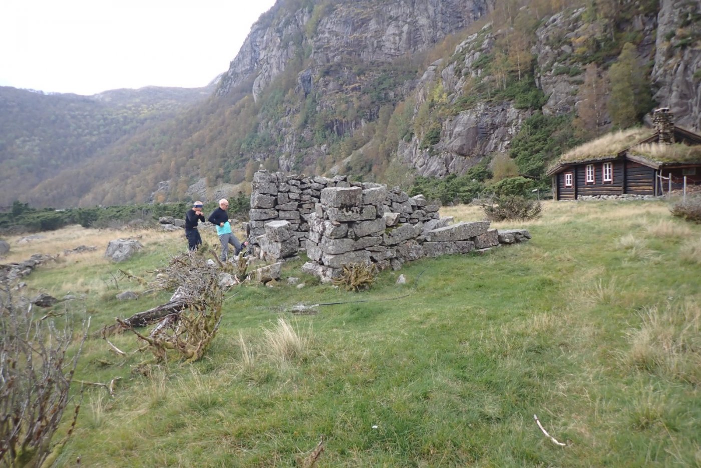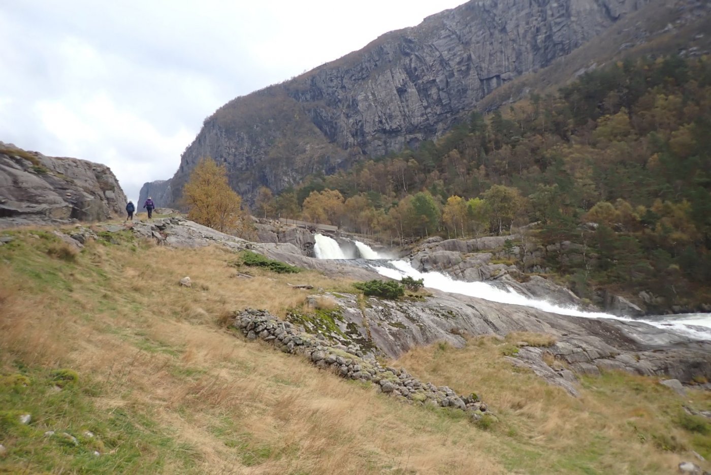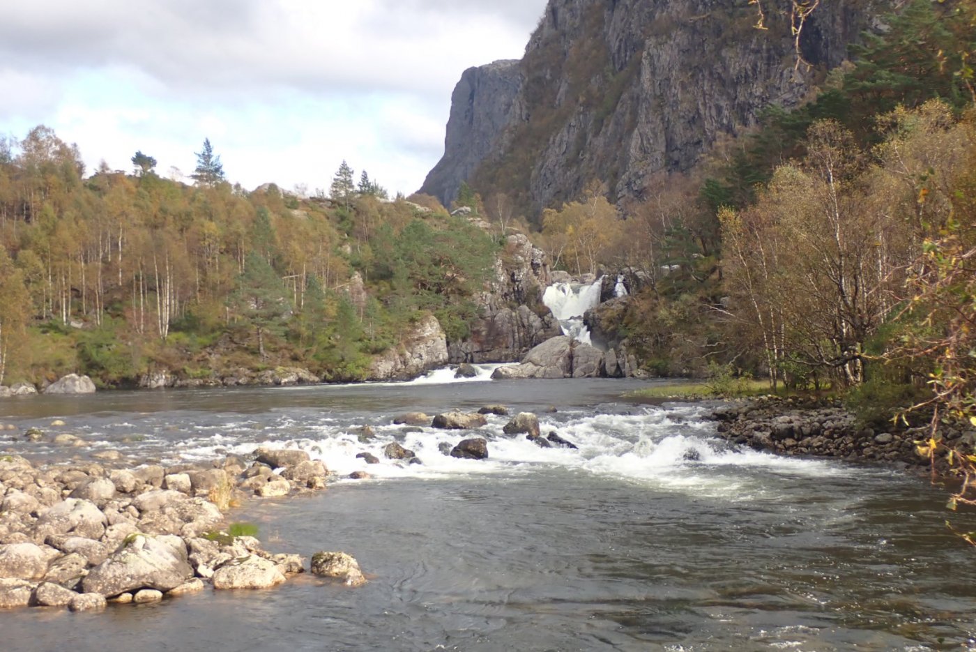 Alt på fredagens tur ble det diskutert hvor vi skulle ta ut på lørdag. For egen del så var jeg ikke helt sikker på om det var så lurt å ta på tur med værvarsel om vind på over 20 m/sek. Med mange på tur er det lite som kan gå galt, og Bestyrerinnen var oppsatt på å være med. Jeg bestemte meg for å slå følge. Sigbjørn og Anne Lise har vært en tur til Lanes inn av Espeland på riksvei 503 (fra Vikeså). En times kjøring fra oss, men på god vei – for det meste. Sigbjørn mente bestemt at turen innover dalen til Lanes var verdt en kjøretur på en time. Natur og stedet Lanes var verdt å få med seg. Vi ble enige om å starte hjemmefra klokka 10, med en oppsamling på Vikeså, for så å kjøre sammen innover mot Espeland. Rett over Storånå i Espedal, går det en vei innover (til høyre når du kommer fra Vikeså og 200 meter innover). Veien går inn til et opplysningsskilt og der er det en liten parkeringsplass. Fra parkeringsplassen er det bare å følge veien innover forbi Roaldsvannet og inn til Fossebrekka. Derfra er videre rett fram til der traktorveien slutter, så overtar en merket sti ned mot Maudalsvannet og rundt til Lanes. Samme vei tilbake. Vi var i alt ti stykker på tur denne dagen. En grei gjeng å være på tur med. Det ble temmelig fullt på parkeringsplassen, men det kom biler etter oss. Turen gikk innover en helt vanlig vei. Med grønne marker og fjell og trær. De første kilometerne gikk unna uten at det var noe spesielt å se. Bortsett fra en skikkelig stor jettegryte i en liten foss. Etter to kilometer var vi inne ved Hælen, og kunne se Fossebrekka foran oss. Veien ble mer driftevei enn traktorvei, og i lia opp mot fossen var det tydelig at det en gang hadde vært en gård. Steingjerdene sto igjen, sammen med en rusten høyvender. Det var nok drift her inne til en stund ut på 50 tallet. Over fossen gikk det bru, men vi skulle videre innover mot Maudalsvannet. Veien gikk opp og ned, rundt en kolle, og i toppen av bakken fikk vi øye på en merkepinne - «fyrstikk» – med rød topp. Her begynte stien mot Lanes, som vi greit kunne se en kilometer lengre inne. Stien langs Lanesstranda og Brattestøl, var tydelig og grei. En lett sti å komme seg fram på. Det var også kjekt å komme ut i terrenget, spesielt med flotte høstfarger rundt om kring. Det var et par småbekker og litt ur, men det var gjort en del for at folk skulle komme lett fram. En kjekk liten kilometer. På selve Lanes var det gamle murer fra mange bygninger. Det må ha vært et lite samfunn her ute en gang i tiden. Det står igjen en laftet tømmerhytte. Nå er det vanskelig å se hvor gamle slike hytter er, men møblene innenfor og interiøret var i hvert fall gammelt. For vår del fant vi en flott plass i le for vinden bak noen gamle murer. Det ble en kjekk pause i godt selskap. Tilbaketuren gikk somme vei som turen inn. Mens vi spiste, blåste det skikkelig opp, og vinden var virkelig kraftig der den fikk tak. Maudalsvannet gikk hvitt, og vinden må ha vært opp mot liten storm. Vi blåste tilbake til bilen, men igjen med en liten pause øverst i Fossebrekkå for å beundre utsikten – nok en gang. Den var vel verdt å få med seg. Vi brukte nesten fire timer på turen, som var litt over ti kilometer. Da hadde vi en god pause, og det tar litt tid å kikke seg rundt. For det var så avgjort verdt å få med seg naturen og utsikten på denne turen.3 poeng