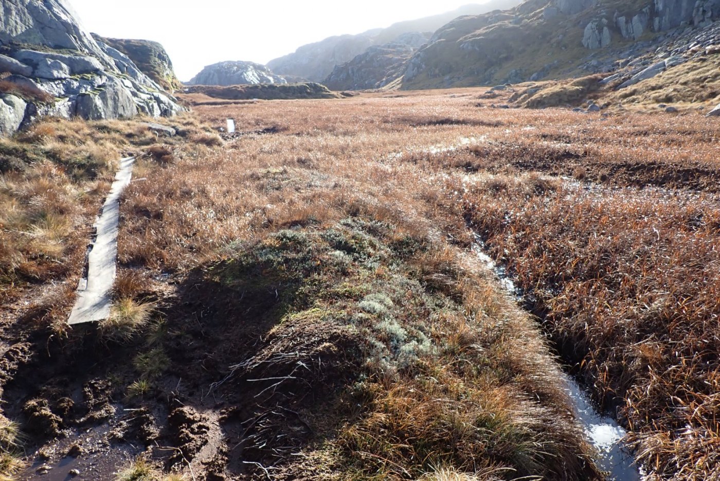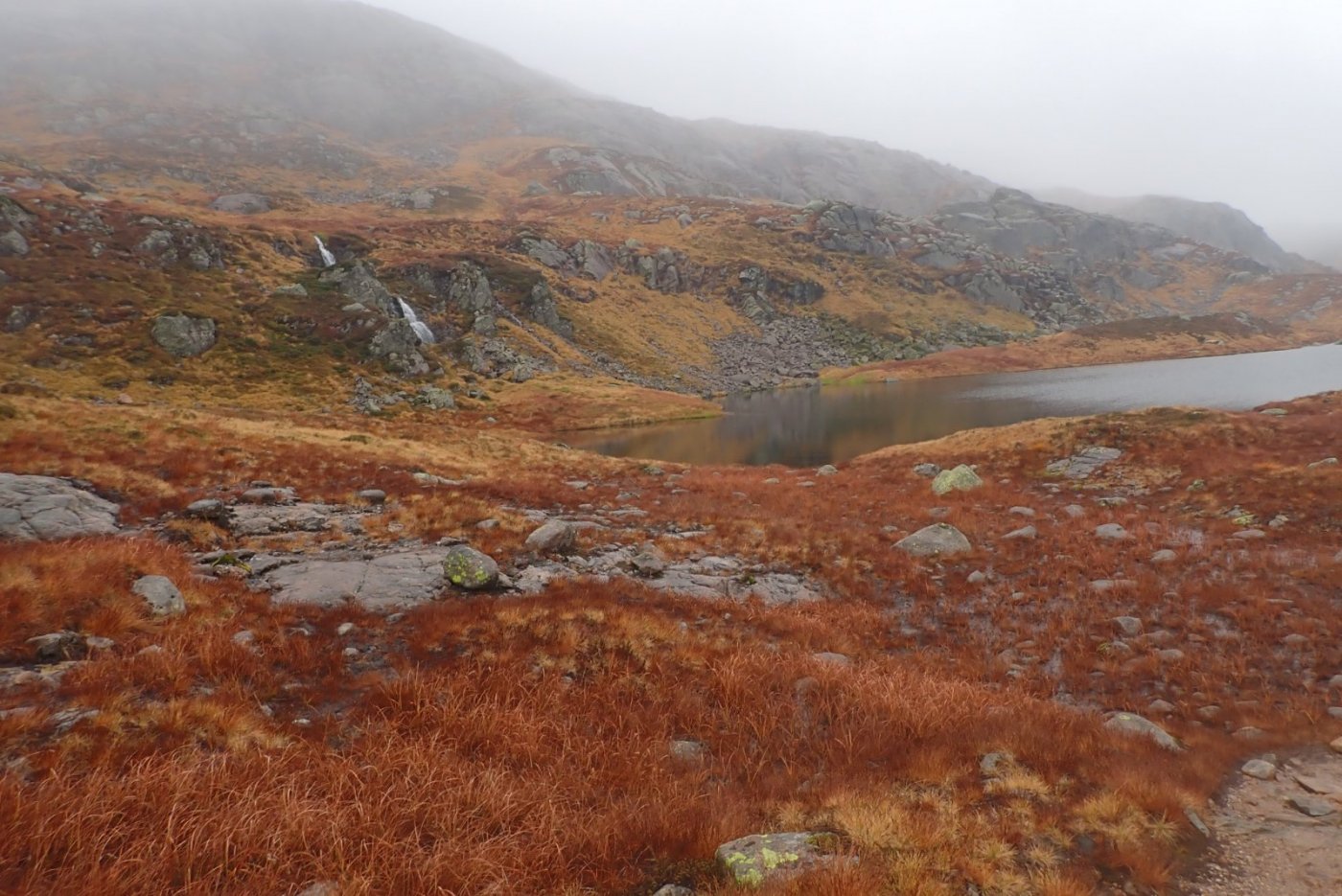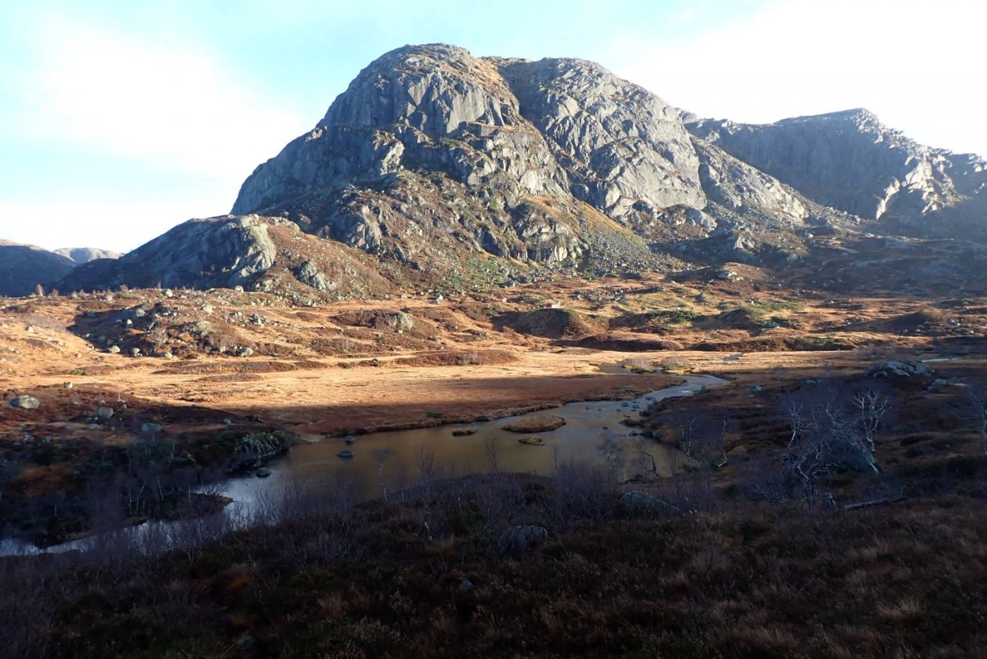 Det skulle ha vært en mørk og stormfull aften på Blåfjellenden, etter en våt og forblåst tur inn, men heldigvis tok YR litt feil. Så sent som i slutten av oktober betyr været en god del. Med frost og snø i heia, så blir det, for min del, heller turer nede i lavlandet. Alene i heia i dårlig vær er ikke helt min stil. Denne fredagen ville YR ha det til at det skulle regne, og blåse. Det ble nevnt vindstyrke opp mot stiv kuling – 15 m/sek. Med regn i tillegg, og lav temperatur, er slikt vær så avgjort ingen spøk. Vinden og været skulle komme fra sørøst. Det betyr rett bakfra på turen inn til Blåfjellenden. Selv lav temperatur, regn og vind er omtrent greit, så lenge det kommer bakfra. Jeg tenkte det skulle gå greit å komme inn. Været ville være litt bedre midt på dagen, og derfor startet jeg tidlig fra Hunnedalen. I lett regn, men som ble lettere og omtrent forsvant inne i mellom. Vinden var i hvert fall ikke noe problem. Den kom aldri opp mot frisk bris en gang. Selv Leitevannet var omtrent uten bølger da jeg kom inn der. Det ble en helt grei tur innover. Selvsagt uten spor i sorpa, og uten at jeg traff andre. Så sent på året er det ikke mange andre som tar på tur. Egentlig var det en helt ordinær tur innover. Det kunne omtrent ha vært mye tidligere på året. Det var mer forventningene om dårlig vær som var forskjellen. Etter en stund kom det gode turhumøret og det ble en flott opplevelse. Selv om det var sent på året. Nå er det ikke mulig å ta feil av årstiden, for myrene er brune og brunrøde. Det er ikke mye grønt å se. Det er ikke sauer, og småfuglene er dratt for lenge siden. Det er stille i heia. Det er bare lyden av bekker og fosser som kan høres. Det er litt underlig at lyden av bekken ofte kan høres ut som snakking. Nå var det andre på vei mot hytta. Det var bestilt et par senger. Da jeg kom ned til hyttene, var det alt folk der. Det var to karer som hadde tatt turen fra Flørli til Blåfjellenden på torsdag – i dårlig vær. Og skulle, etter to netter på hytta, videre mot en støl opp av Frafjord. Guttene hadde fyrt i hovedhytta. Der var det 25 grader inne. Jeg trakk bort til annekset og mitt eget rom. Inne på annekset var det 6 grader. Hytta sto som jeg hadde forlatt den forrige lørdag. Vannbøtta var ikke rørt. Stolene sto som før og ovnen var kald.... Det tok litt tid å få opp varmen i stua. Det var helt greit å ta en tur bort til de to andre for en liten prat mens ovnen - og rommet, ble varmt. Så var det tid for de vanlige skolebollene og varm drikke. Jeg valgte kakao denne gangen. Det virker «varmere» enn te, antakelig på grunn av sukkeret. Yr hadde mye bedre vær på lur for lørdagen, og denne gangen fikk de nesten rett. Temperaturen ute kom omtrent ned til null på morgenen. Det var så vidt snerk på de minste pyttene, og gangplankene var spinnglatte. Der var det is. Det var blå himmel og sol – bak Grønanuten. Blåfjellenden ligger litt utsatt til for østavind. Det kan blåse ganske hardt rundt hyttene. Denne dagen var det blå himmel og vind. Det var kaldt utenfor hytta. Det var bare å hive på seg vinterutrustningen. Selvsagt ble det likevel alt for varmt opp bakken i le for vinden. Det hadde vært frost øverst, men der sola hadde kommet til, var det ikke spor av is. En enslig liten hvit flekk lå fortsatt igjen fra forrige ukes snøfall. Lørdag var det vind rett i mot for meg som skulle mot bilen. For å ta litt igjen for den manglende vinden dagen før, blåste det mer denne dagen. Opp mot 10-11 m/sek, frisk bris. Det var en kald fornøyelse øverst, men ble straks mye mer behagelig nedover mot Hunnedalen. En tur i sol og vind over heia fra Blåfjellenden til Hunnedalen, er vel verdt å få med seg så sent i sesongen.6 poeng