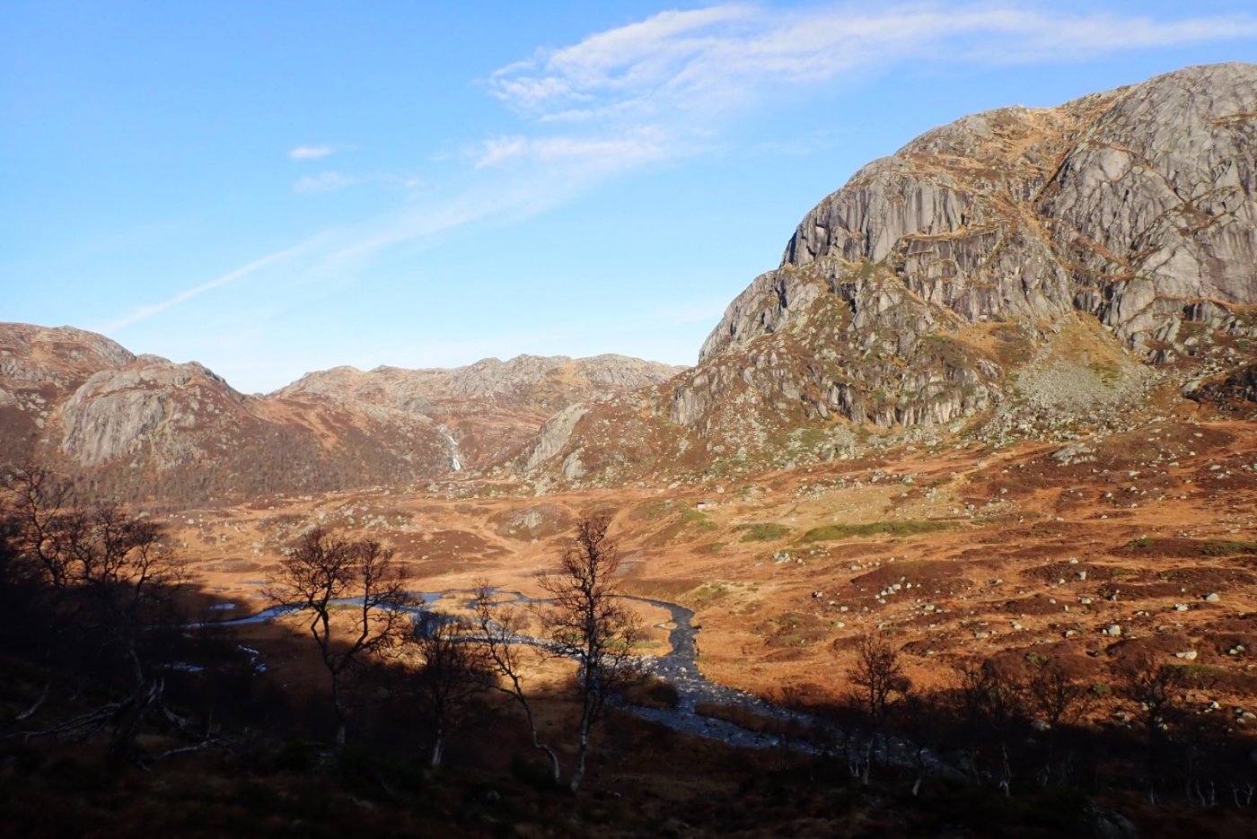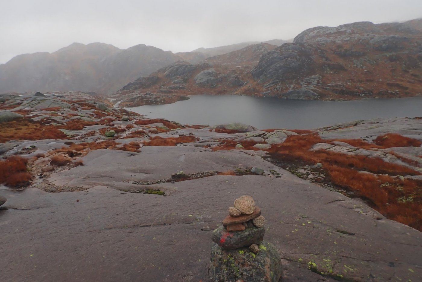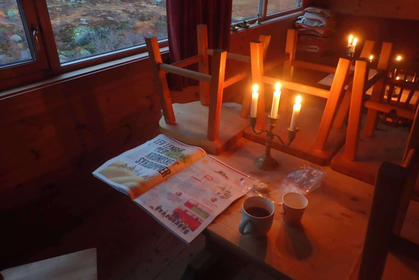 Det ble en flott start på ukas tur innover til Blåfjellenden. Været var bedre enn det YR hadde meldt, og jeg så lyst på situasjonen. Det kunne lett bli en tur uten regn. Så sent på året er ikke det noen selvfølge. Nå hadde Blåfjellenden vært nevnt i Stavanger Aftenblad. Et par hadde gått fra Mån mot Blåfjellenden og Sandvatn og var ikke kommet tilbake på avtalt tid. Letemannskapene traff paret da de var på vei mot Lortabu fra Sandvatn. I både godt humør og i god form. De hadde antakelig bare tatt en dag ekstra på hytta – i dårlig vær muligens, og så ble det satt i gang en leteaksjon. Nå ja, ingen ble skadet og alt endte godt, heldigvis. Jeg tenkte litt på dette da jeg gikk innover heia. Temmelig alene – uten spor verken mot eller med. Og det hadde antakelig ikke vært folk i stien på noen dager. Det skal lite til. Det er lett å få en ødelagt fot og bli liggende. Det gikk selvsagt bra denne gangen også. Høsten er ensfarget brunrød. Det er lite andre farger å se. Litt grønn einer lyser opp og helt nede mot Høgaleitet er det fortsatt noen gule blader på bjørka. Oppe i høyden var det hvite flekker i kontrast til alt det brune og grå. Snø, som lå igjen fra tidligere i uka. Nesten alt var forsvunnet på sørsiden, men mot nord var det fortsatt hvite flekker. Heldigvis var det ikke antydning til frost. Det var egentlig en helt grei tur innover. Nå forsvant sola etter hvert, og det kom noen dråper, men siden trekken kom bakfra, var det ikke et problem. Selvsagt kom det verste været øverst. Hadde det stått på fra nord, og jeg hadde fått det i fleisen, ville det blitt en sur halvtime. Temperaturen kan ikke ha vært mer en et par grader over null, og med vind og regn i mot, så hadde det blitt skikkelig ubehagelig. Og farlig. Det var i slikt vær jeg og broderen en gang ble litt for kalde. Helt opplagt hypotermia, men det forsto vi ikke før etterpå . Da fant vi ut at vi hadde oppført oss litt «merkelig». Det ble som vanlig varmere nedover mot hytta. Det var rett før jeg kunne ha tatt av jakken. Også denne gangen ble det et par stopp i bakken nedover mot Blåfjellenden. Panoramaet over dalen og mot Jomfruvannet og fossen nederst og mot Blåstøldalen er skikkelig flott. Selv etter 30 år på samme stien og med samme utsikt, finner jeg dette verdt å ta med videre i livet. Jeg håper å få lov til å oppleve dette noen ganger til. Jeg nådde akkurat inn dørene før regnet kom. Senere på kvelden blåste det også opp. Det er helt geit å ligge i en varm seng å høre regnet plaske utenfor og vinden ta skikkelig i. Spesielt da værmeldingen bestemt mente at uværet ville gi seg ut på morgenen, og det ville igjen bli greit vær. Det er jo en del ting som mår gjøres før kvelden. Først er det vann. Denne gangen var bøtten skål tomme. Så er det å få fyr på ovnen. Det gir ikke varme ut i rommet med en gang, men litt lunk blir det jo etter hvert. Så er det å få på varme tørre klær. Neste post på programmet for min del er varm te, skoleboller og saft. Og finne fram lesestoffet. Det ble denne gang noen rolige timer i eget selskap. Skikkelig hyggelig – for meg. Klokka et ble jeg vekket – av lys fra mange hodelykter. En gjeng fra Turistforeningen på turlederkurs kom sent til Blåfjellenden. Det var litt vind i mot og det kom noe nedbør på vei tilbake til Hunnedalen. Selv været var ikke i stand til å legge noen demper på humøret. Jeg hadde fått nok en flott tur til Blåfjellenden dette året, og det var verdt å feire. Med en stopp på Byrkjedalstunet med te og lappe.1 poeng
