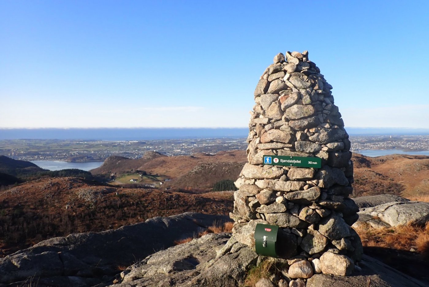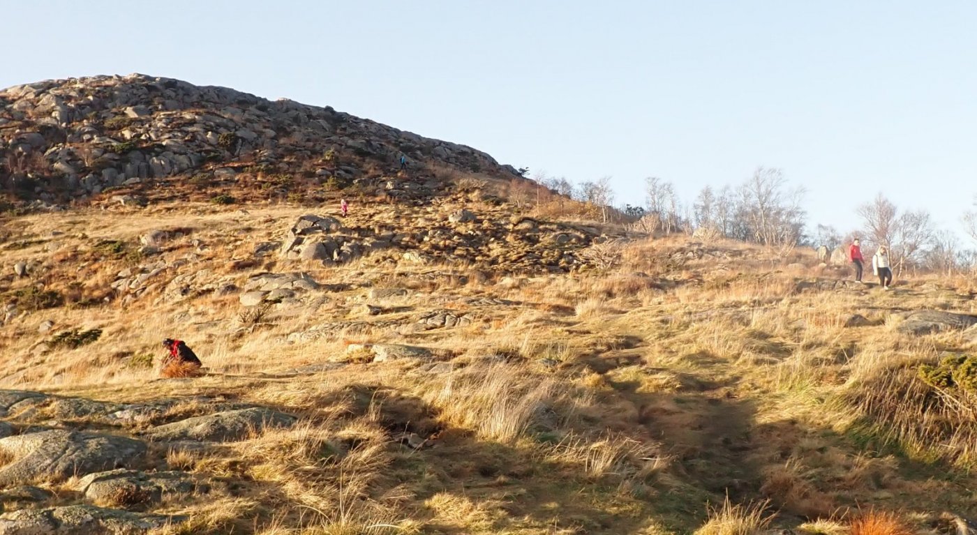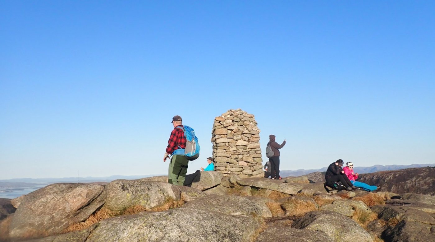 Mandag kom med virkelig flott turvær. Sol og blå himmel og nesten ikke vind. Selv om det hadde blitt ganske mange turer den siste uka, var det umulig å sitte hjemme – å se på det kjempefine været. Broderen ble kontaktet, og han var kjapt klar for en tur. Fortsatt er det slik at han ikke helt er innstilt på langturer. Bakker, både opp og ned er en annen sak. Det går greit. Vi ble enige om å treffes på parkeringsplassen på Gramstad. Det var snakk om Bjørndalsfjellet og Fjogstadnuten – og muligens Dalsnuten, om alt stemte. Det viste seg at vi ikke var enige i tidspunktet for når vi skulle møtes på Gramstad. Jeg ventet en stund på broderen, men fant ut at jeg fikk bare ta oppover mot Bjørndalsfjellet. Skulle broderen komme senere, siden han ikke hadde møtt opp på «riktig» tidspunkt, ville vi i hvert fall møtes. Like under toppen av Bjørndalsfjellet dukket broderen opp. Det ble til at vi tok mot Fjogstadnuten og Dalsnuten. Broderen mente at det ville gå helt greit å ta opp om denne toppen også. Broderen var langt fra den eneste som kom i mot. Det var nesten fullt på parkeringsplassen og mange folk overalt. Det var mer folk på tur denne mandagen enn på en «dårlig» søndag. Det hender ofte at jeg, eller vi, treffer folk vi kjenner på stiene rundt Gramstad. Denne gangen var det mye folk, men ingen kjente. Selv på stien mot Fjorgstadnuten og videre mot Revholen, var det masse mennesker. Her treffer vi som oftest bare noen ganske få andre tur-gåere. Dette var så avgjort dagen for en litt lengre tur enn bare den kjappe to-nuts turen. Her måtte vi legge til Dalsnuten. Det er noen høydemeter fra Revholen, opp mot 150. Den «gamle» stien var forholdsvis bratt, og med noen vanskelige trinne her og der. Det er mulig å gå noen flotte trapper opp over fra Revholen og mot toppen. Der trappene slutte går det en sti – rimelig flatt – over til stien som kommer fra Gramstad direkte over myra. Videre oppover mot toppen er det nye trapper og god sti til selve blanke berget under toppen. Det er helt greit å komme opp denne veien. Nedover går mye fortere enn oppover – for oss. Vi valgte denne gangen å gå tilbake samme vei vi var kommet opp – mot Revholtjørn. Videre er det god sti med flate steiner å gå på til veien. Denne ruta mot Gramstad er muligens 100 meter lengre, men det går antakelig like fort, da det er letere å holde fart på god sti. Det ble noen stopp underveis denne dagen. Med flott vær og nesten vindstille, var det mange muligheter for å ta gode bilder. Etter omtrent to og en halv time var vi tilbake på parkeringsplassen. Der var det mindre biler enn da jeg startet. Det var likevel folk som begynte på sin tur da vi kom tilbake. En flott dag gjorde at mange ville på tur. Både broderen og jeg var fornøyd med dagen. En kjekk tur i flott vær.1 poeng
