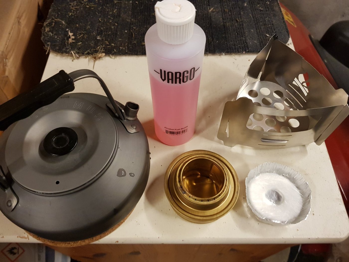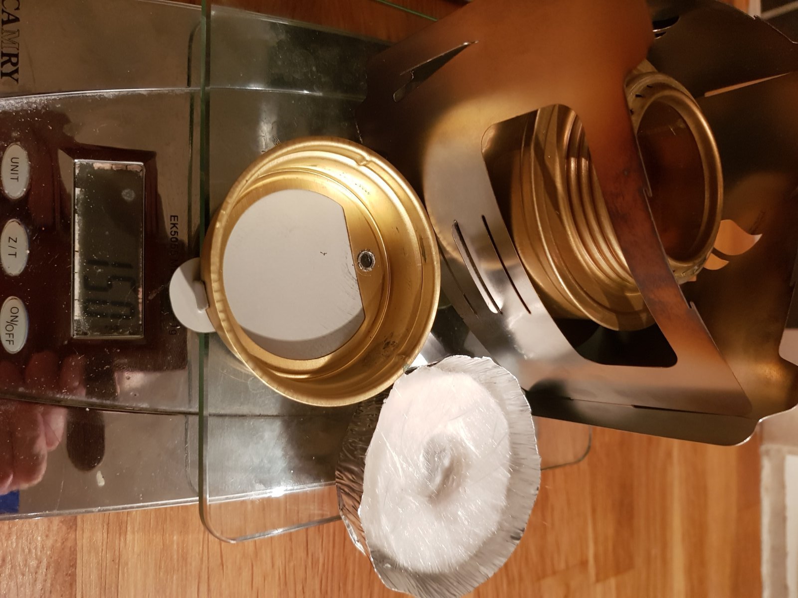 okey, Bushcraft Essentials Bushbox Ultralight er kommet i hus og måtte prøves. Det blir for trangt med Trangias vintersats inne i selve brenneren. Så da ble det en annen løsning. Klippet ned en aluform kake og la en forvarmings filt nedi. så var det bare å helle på rødsprit, tenne på og sette den under Bushbox. Forvarmingen gikk greit. På min kjele bruke jeg 6 min og 30 sek for å koke opp 0,6 L vann. Av det andre bilde ser dere vekten på 150 gram komplett sett. Helt ok!1 poeng