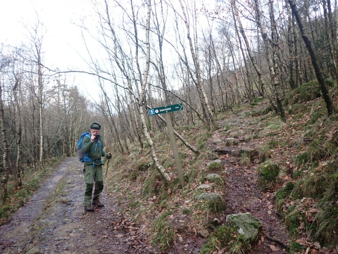 Det var snakk om søndagstur. Bestyrerinnen ville vite hvor jeg hadde tenkt å gå. Jeg hadde ikke tenkt i det hele tatt. Hva med om vi spurte Sigbjørn og Anne Lise, om de har tenkt seg på tur? De ville gjerne på tur. Det kom opp forskjellige forslag til hvor vi skulle ta turen. Vi endte opp med at vi igjen ville forsøke oss på Karten og Brusanuten. En tur vi har tatt noen ganger. På vei mot Bryne, ble Bjødnali nevnt, og Bestyrerinnen gikk inn for dette som turmål. Det ble til at vi kjørte mot Sælandsskogen. Nå er Sigbjørn og Anne Lise med i en turgjeng som går mange forskjellige plasser. I motsetning til meg som gjerne holder meg på kjente og kjære stier. Denne gjengen har selvsagt også forsøkt seg på Bjødnali som turmål, men da med en vri. Sigbjørn foreslo å ta ut i turgjengens fotspor . Siden Bestyrerinnen og jeg ikke hadde gått den turen, men bare de «vanlige» turene fra Parkeringsplassen i Sælandsskogen, så var det ikke vanskelig å godta en liten omlegging av planene. Turen startet i hvert fall som vanlig. Ved veien langs «ånå» og vannet, står det et informasjons-skilt. Her går det en litt utydelig sti oppover mot toppen av Blåfjell. Denne dagen var stien dekket av eikeblader, og temmelig vanskelig å finne. Bare et lite stykke opp i lia ble stien ganske tydelig og lett å se. Lett å finne, men så avgjort ikke lett å følge. Det var både bratt og kronglet. Selvsagt traff vi en gjeng med voksne og unger som ikke hadde problemer er med bakken. Ett stykke oppover gikk stien over et lite myrsøkk. Det jeg trodde var en stein viste seg å være et dypt hull. Jeg sank gjennom torva og var ned i myra til kneet, uten å kjenne bunnen. Jeg ble sorpet til langt opp på buksebeinet. Vi kom til toppen og gikk videre ned mot stien som går mot Urdådalen og Moldtjørn. Vi tok stien mor Sælandsfjellet og rundet den toppen og fortsatte videre mellom Bukkanuten og Sælandsfjellet. Her oppe i høyden var det så vidt antydning til sti noen plasser. Uten god sti, tok det tid å komme ned til veien mellom Sjelset og Bjødnalivannet. Fra stidelet mellom Blåfjell og Sælandsfjellet og til veien, er det ikke mer en vel en og en halv kilometer, men det tok oss opp mot en halv time. Vi fulgte veien nedover og tok mot «Skogen» rundt Engjavannet. Ved «Skogen» var det tid for pause. Som ble kort. Bestyrerinnen likte ikke at høylandsfeet kom for å sjekke oss opp. Fra «Skogen» tilbake gikk vi den vanlige veien rundt Engjavannet og tilbake til veien mellom Bjødnali og Sjelset. Oppe i skaret er det god sikt over Bryne og Jæren – og bakken nedover. Fra Sjelset går turen langs vei til «Kleiva» og så videre langs «ånå» tilbake til Sælandsskogen. Det hadde vært en skikkelig flott tur, mye utenfor vanlig sti ute i terrenget, og med en skikkelig bakke opp til toppen av Blåfjell. Alt i alt ble det en kjekk fjelltur, og det i slutten av november. En flott søndag i god selskap. Alt i alt omtrent 11 kilometer og vi brukte 3 1/2 time. Pausen denne søndagen ble kort.1 poeng