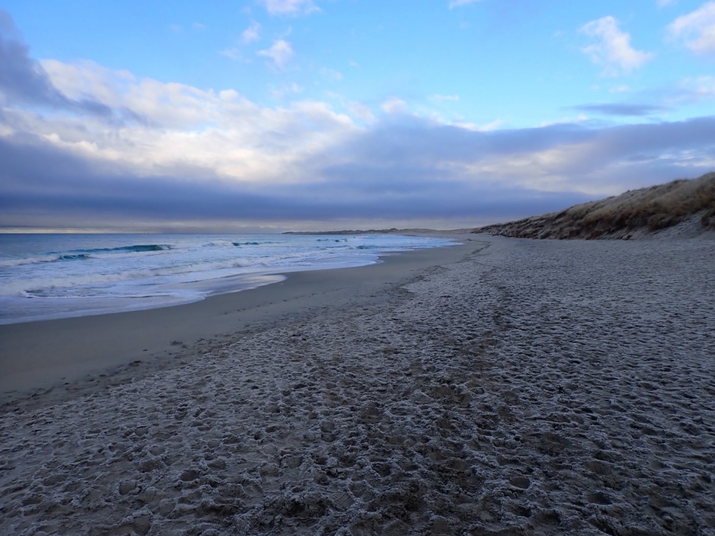 Onsdag 27. januar 2021. Flotte vinterdager står i kø. Det er virkelig vanskelig å la være å ta ut på tur slike flotte dager For oss i pensjonistalderen, og med skrekk for glatt føre og lårbeinsbrudd, betyr is og kulde helst et begrenset utvalg av turmuligheter. Vi tar nå på tur likevel. Sand og strand er bra. Det vil sjeldent bli glatt på en sandstrand, og om naturen samarbeider, så vil sanden også være steinhard. Omtrent som asfalt, og like god å gå på. Jærstrendene trekker mange folk disse dager. Vi, det vil si, broderen og meg er blant de som bruker strendene flittigst. Nå kan likevel ikke naturopplevelsen av å gå tur langs nordsjøen helt sammenliknes med en tur i fjellet, men er en god erstatning når forholdene ikke tillater fjellturer. Sand og strand byr på en høy himmel og vidt utsyn – over bølger og sjø. Landskapet innenfor selve stranden gir også fine opplevelser. Fra toppen av sanddynene er det mulig å se langt til havs og inn til fjellene i horisonten mot øst og nord. Strendene langs jærkysten er også et yndet sted for overvintrende fugler. Svanene som holder til i området er på «sommeropphold» fra Sibir, blir jeg fortalt. Gjessene kommer vel også nord fra. Broderen og jeg forsøker å få et par turer i uka sammen. Det er ikke alltid det lar seg gjøre, av forskjellige årsaker. Tidligere ble det ofte til av vi fikk en tur i helga og så ble det en litt kapp og kort tur på onsdagen. Denne onsdagen avtalte vi tur og været var for så vidt samarbeidsvillig, men med is og frost, ville det igjen bli en strandtur. Vi avtalte å møtes ved Friluftshuset på Orre, og gå derfra. Det var kommet er tynt lag med snø, helst bare rim, men det var fortsatt frost på morgenen. Heller kjølig med et par minusgrader. Vi tok mot Orreelva først. Med sola i mot og trekken bakfra, måtte det bli en skikkelig grei start på onsdagsturen. Det ble litt mindre «greit» da vi snudde mot nord ved elva. Heldigvis hadde vi da gått oss så pass varme at det ikke ble for kaldt. Det er lett å snakke om naturopplevelsene i sjøkanten, men etter en halv time med sand, sjø og blå himmel, blir det likevel til av vi prater om løst mens vi går. Det «løse» denne gangen var hvor langt vi egentlig skulle gå. Ved Reve, ble det snakk om å gå til enden av sandstranden, da vi nådde veien ble det til at vi fortsatte mot havna. Et lite stykke før Reve havn ble vi stoppet av noen isfloer, og valgte å snu. Det hadde nok vært mulig å komme seg helt til havn, men vi var ikke mer en vel hundre meter unna. Det fikk klare seg for denne gangen. Etter omtrent 6 kilometer, var vi kommet i rett trav, og tilbaketuren gikk helt greit. En flott tur, på omtrent en mil. Det er litt mer enn en vanlig onsdagstur, men i det flotte vinterværet var det bare kjekt.2 poeng