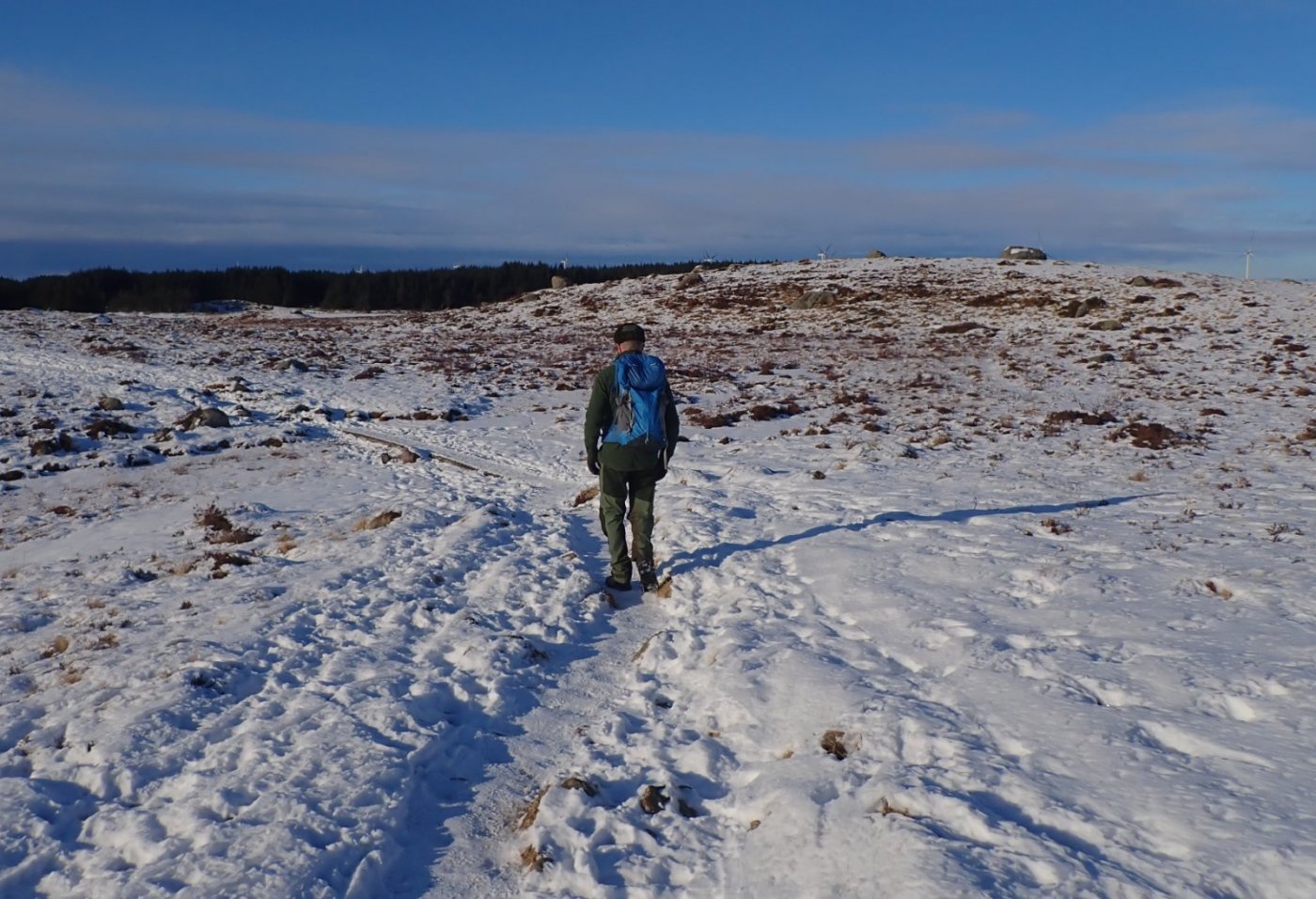 Fin dag og flott tur. Broderen hadde fått med seg at jeg igjen hadde gått tur på Høgjæren. Med frost og snø har det blitt mange turer langs sjøen. Han kunne godt tenke seg å prøve gamle gode stier på litt inne i landet. For egen del ble det greit med tur på hvitt føre, da jeg anskaffet nye sko – Icebug med pigger. Piggdekk er tingen, spesielt på det føre vi har hatt den siste tiden. Hardtråkket snø og smale spor. Enkelte flekker med is har ikke bydd på problemer, og selv om det går litt langsommere på piggdekk-føre, kom jeg rundt på en grei tid. Litt mer sliten enn vanlig, men det skyldes nok at jeg bruker litt andre muskler enn de vanlige. Det er noe med et kne som ikke samarbeider. Det kunne være greit å ta turen på Høgjæren en gang til. Broderen var i hvert fall innstilt på det, og vi ble enige om å møtes på parkeringsplassen på Holmavatn. Det var andre enn oss som ville på tur denne dagen. Selv på en onsdag var det en god del biler, og folk som startet på tur enten mot Steinkjerringå eller Synesvarden. Før start fant jeg fram et par med brodder. De hadde ligget hjemme en stund, et par år eller noe sånt. Broderen var skeptisk, men piggene kom på plass under skoene. Nå ville det nok være greit å gå rundt på Høgjæren uten pigger under skoene, men noen bakker og noen små flekker av is gjorde det greit med «piggdekk». Det tok ikke lang tid før broderen hadde kjørt inn «piggdekkene», og litt oppe i bakkene, var han enig med meg om at det var bedre med enn uten. Vi hadde i hvert fall ingen problemer med å komme oss til Steinkjerringå. Vanligvis når vi går denne runden, på sommerføre, så tar bi ikke turen ut til statuen, men fortsetter mot Synesvarden. Den lille utstikkeren til Steinkjerringå, gjør turen så lang at den «fortjener» å komme med i bloggen. Nesten ni kilometer og nesten to timer, nesten en skikkelig tur. Været er fortsatt flott. Vintervær med frost og nok så mange kuldegrader om nettene. Da vi startet var det kaldt, minst 6-7 minus, men uten trekk eller vind, så ble det ganske fort varmt, Og i bakkene ble det både svette og høy puls. Nå er værvarselet for neste uke ikke fullt så bra. Noe nedbør, vind og så vidt over null. Det kan være mulig å gå tur, men det kan også bli mye is, hvor piggene ikke er nok til å holde gamle folk på rett kjøl. Vår tur gikk bra. Forrige gang syntes jeg det var «tungt» å gå. Det var lange strekk, der det vanligvis gikk kjapt. Vi kom greit gjennom hele løypa. Sola skinte, det var omtrent vindstille på Synesvarden, og nedover mot Holmavatn, med sola i ansiktet, ble det riktig kjekt. Broderen var mer enn fornøyd da vi sto på parkeringsplassen ved Holmavatn. Det hadde vært en kjekk tur – på vinterføre.1 poeng