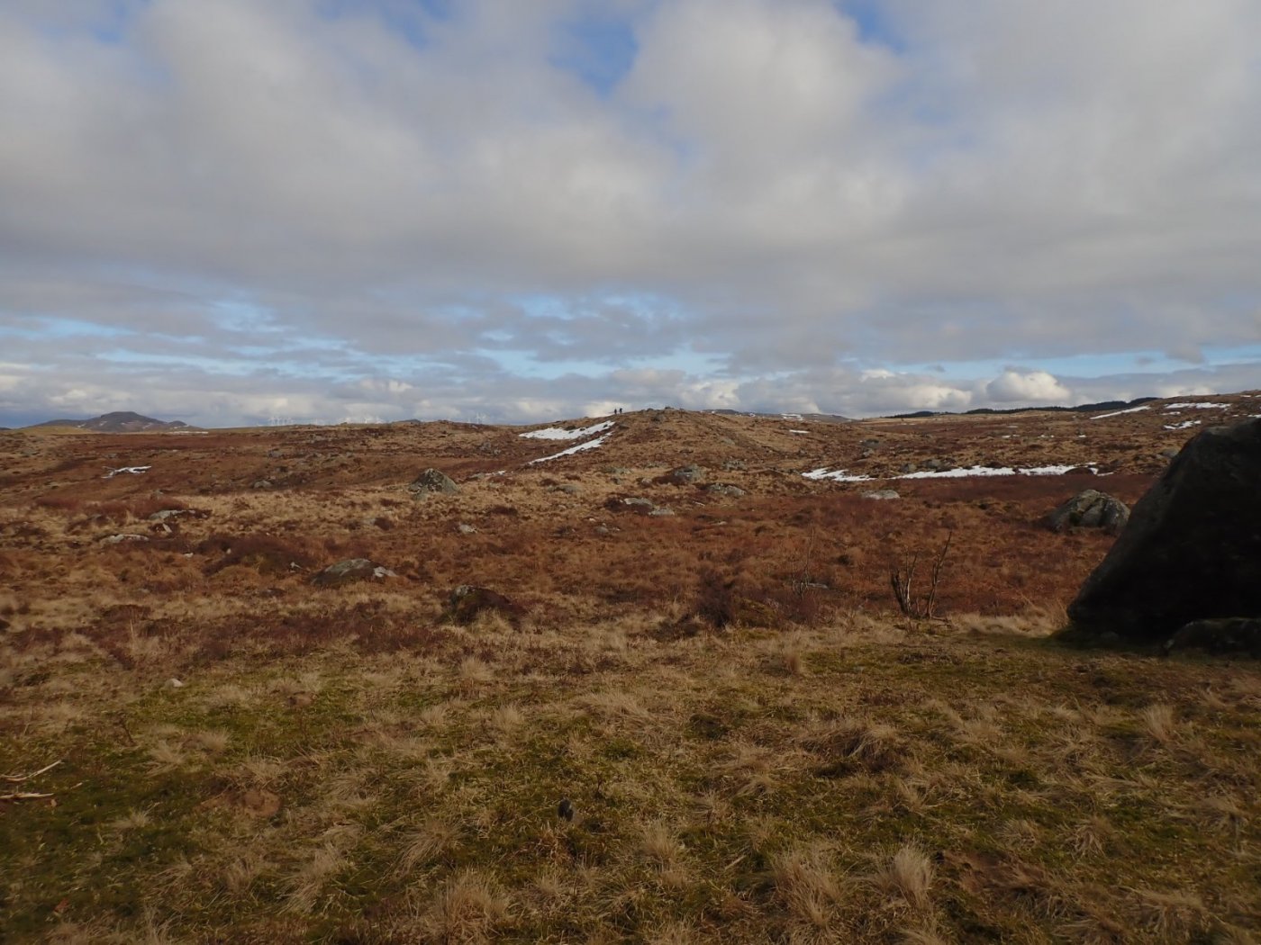 Fortsatt flekker med vinter. Etter en kjapp og grei tur på mandag, lurte jeg på hva jeg skulle finne på tirsdag. Jeg hadde liksom gått de fleste enkle og greie turene. Skulle jeg forsøke meg på en av de litt lengre. Jeg ble ening med meg selv om å ta turen fra Tovdal til Steinkjerringå. Ikke en riktig langtur, men en grei tur på omtrent 11-12 kilometer. Bestyrerinnen hørte om planene, og kikket ut vinduet. Været var neset bra. Bare noen skyer enkelte plasser, og det så ut som omtrent vindstille. Hun bestemte seg kjapt for å bli med. Planer er greit, men da vi kom opp ovenfor Undheim, og fikk se ganske mye snø, snudde vi kjapt på opplegget og kjørte til Holmavatn for å ta den tradisjonelle runden. Fra Holmavatn til Synesvarden og så til Steinkjerringå, så tilbake til bilen. Selv med en avstikker til selve statuen er turen «bare» på omtrent 8 kilometer, men vil ta oss opp mot to timer. Det er god sti, men mesteparten går i terrenget. Turen går i lett terreng og bakkene (og det er bakker) er slake og greie å komme opp. 4 kilometer i timen er grei fart for Bestyrerinnen og meg. Det var andre biler på parkeringsplassen, men merkelig få. Det har den siste tiden vært mye mer folk på tur enn tidligere. Denne dagen manglet turfolkene. Det skulle vise seg å være mindre folk på tur enn bilene viste. Ved parkeringsplassen lå det en haug med planker, noen oppskåret i passe lengder. Andre ganske lange. Det var tydelig at noen holdt på å forbedre stien med å lage gangveier. På en papp-plate var det oppfordring om å ta med noe av materialer ti minutter oppover stien mot Synesvarden. Heldigvis heiv jeg opp i sekken en del plank, omtrent så mange som jeg mente sekken ville tåle. Det ble omtrent 15 kilo på ryggen. Jeg traff to av karene som jobbet. De var opptatt med bæring. Planken kom jo ikke på plass av seg selv. Mitt lille bidrag vart jo ikke mye. Det viste seg at en av karene kjente meg igjen fra forrige gang jeg var med på bæring av plank her oppe. Virkelig flaks at jeg da hadde plank i sekken. Det var ikke lange strekket jeg bar, men siden Bestyrerinnen var med, gikk vi videre og ikke ned for å hente mer. Selv om det ikke hadde vært frost hjemme på en stund, lå det igjen enkelte fenner på Høgjæren. Vi måtte krysse noen, og det var tydelig at andre hadde gått før oss. Dype og skitne spor. Det ble ingen stopp på Synesvarden vi fortsatte nedover mot Steinkjerringå. Det ble kaldere da vi fikk vinden på oss. Selv om sola skinte og det var en del varmegrader – hjemme, så ble det kaldt. Litt lengre ned og i le av trekken fikk vi en skikkelig vårtur, så lenge det varte. Ved Steinkjerringå traff vi to jenter, som også ville ta turen rundt, men i motsatt retning av oss. Merkelig nok var det ingen andre ute på tur. Spesielt mellom Holmavatn og Steinkjerringå, pleier det alltid å være andre. Selv med kuling og nedbør treffer vi vanligvis folk her. Det ble nye fenner, men ellers en grei tur tilbake til bilene. To timer og tung sekk – et meget kort stykke.2 poeng